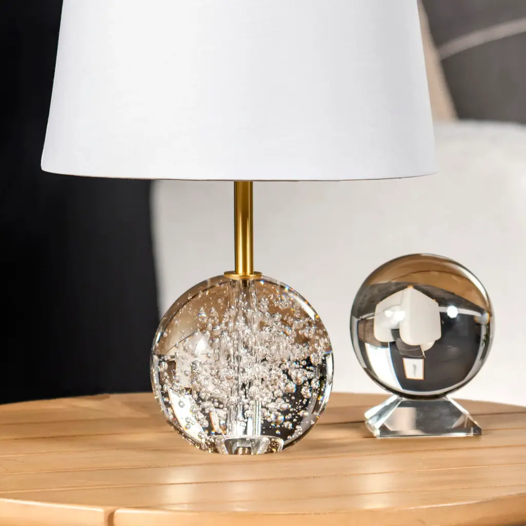 The perfect combination of compact yet striking, this round crystal table lamp sets the tone with style and grace. An oversized tapered drum shade adds height and drama, fitting wonderfully in tight spaces. This fixture provides welcoming illumination while also adding a contemporary, airy element to the overall style. Designed with you in mind, Rugs USA provides an LED bulb, allowing your lighting to take center stage effortlessly.Dimensions Overall: 16.5" H x 10" W x 10" D Base: 4.5" H x 4.75" W x 4.75" D Shade: 8.5" H x 10" W x 10" D Cord: 6'