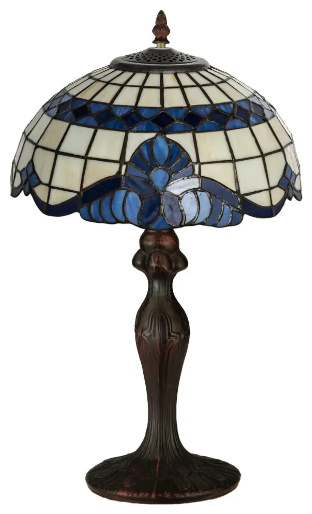 Regal scrolls of Royal Blue with coordinating diamonds; adorn this handsome Tiffany style; stained glass shade. The dome shade is paired with a coordinating accent lamp base; hand finished in Mahogany Bronze.