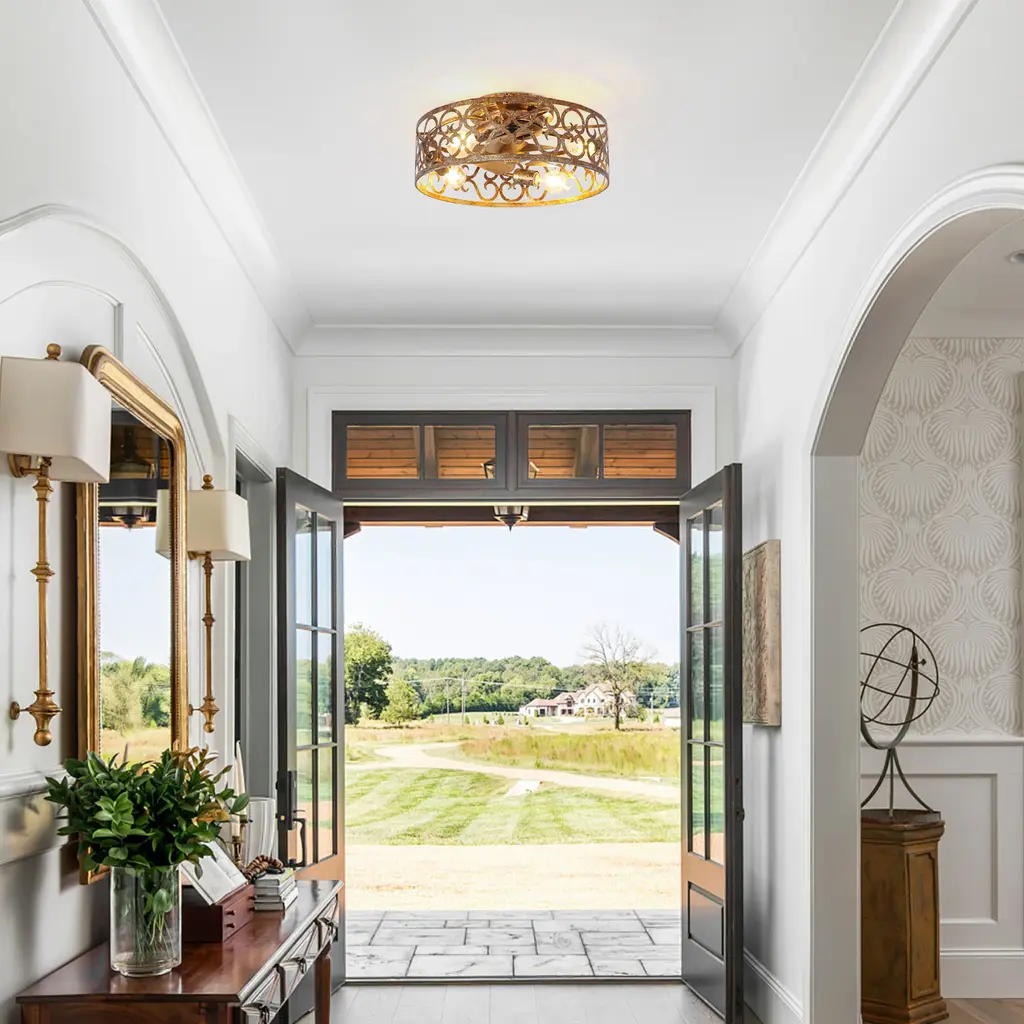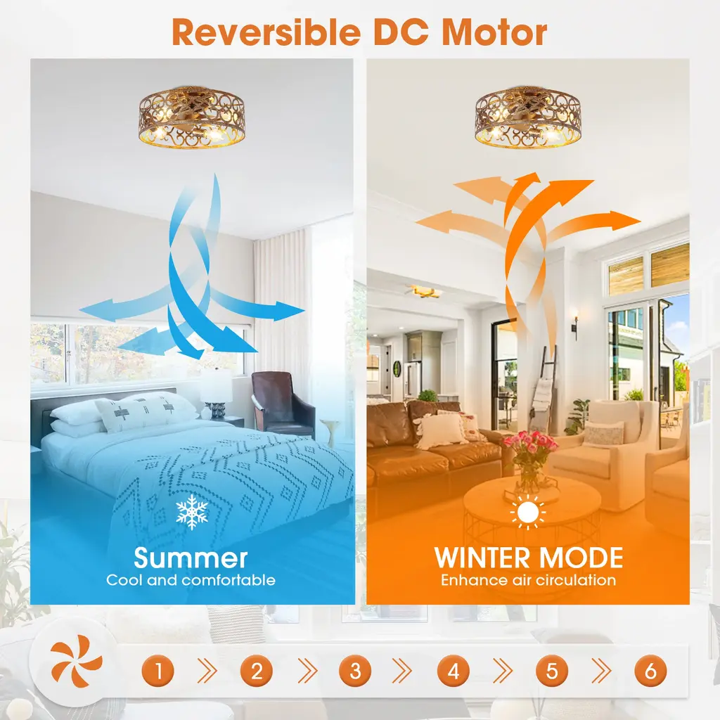 18-inch golden flush mount ceiling fan with light, the perfect fusion of smart home and retro industrial style.【Intelligent dual-control design】: Supports APP remote control + remote control, 6 wind speeds can be freely adjusted, adapted to the needs of modern smart homes【Industrial aesthetic lamps】: 18-inch retro distressed gold body with old gold blades, 5 45° angled plastic fan blades to enhance airflow, taking into account the practicality of a small space and industrial style decoration【Ultra-quiet and energy-efficient DC motor】: 20W DC frequency conversion technology, 1000RPM strong wind power only consumes 11.8W, UL certified safe and energy-saving, suitable for rooms ≤75 sq ft.【Four-lamp expansion lighting】: Flush Mount installation, integrated 4 sets of E26 ceramic lamp holders (single lamp maximum 40W), can be freely matched with warm light/white light bulbs【Worry-free installation and after-sales service】: Includes remote control and instructions, the whole machine is made of iron, 7.7-inch ultra-thin body, and enjoys a 1-year warranty.