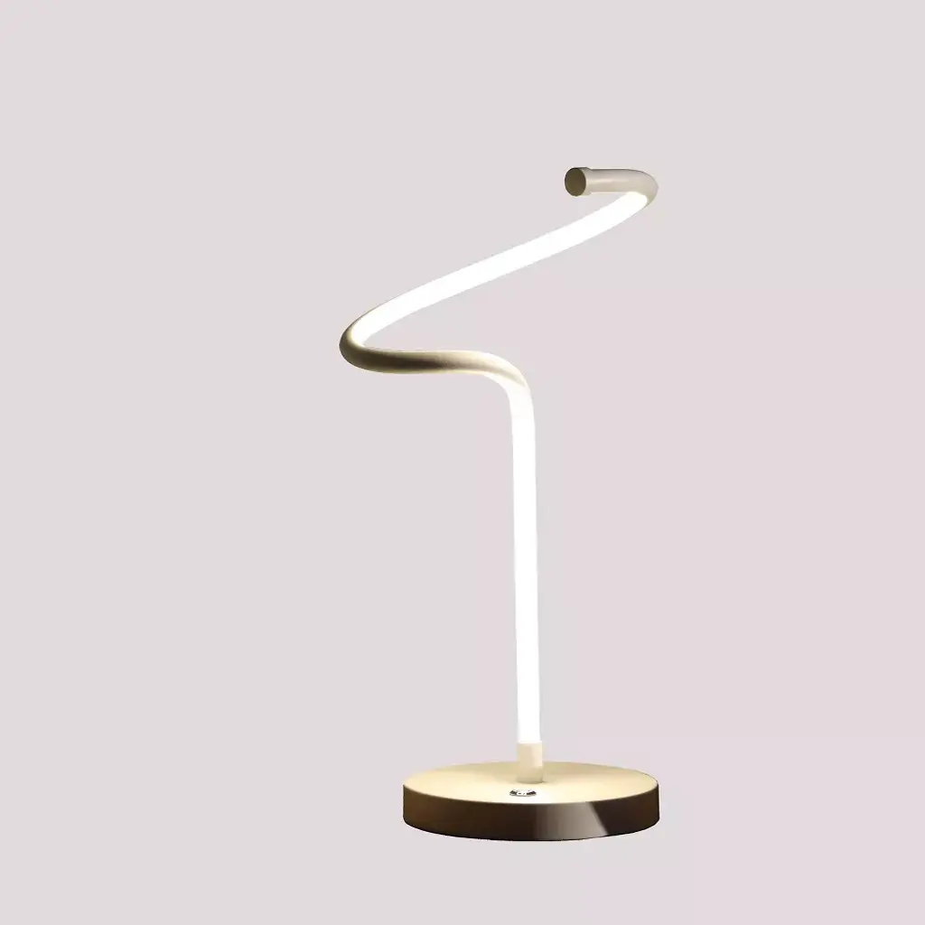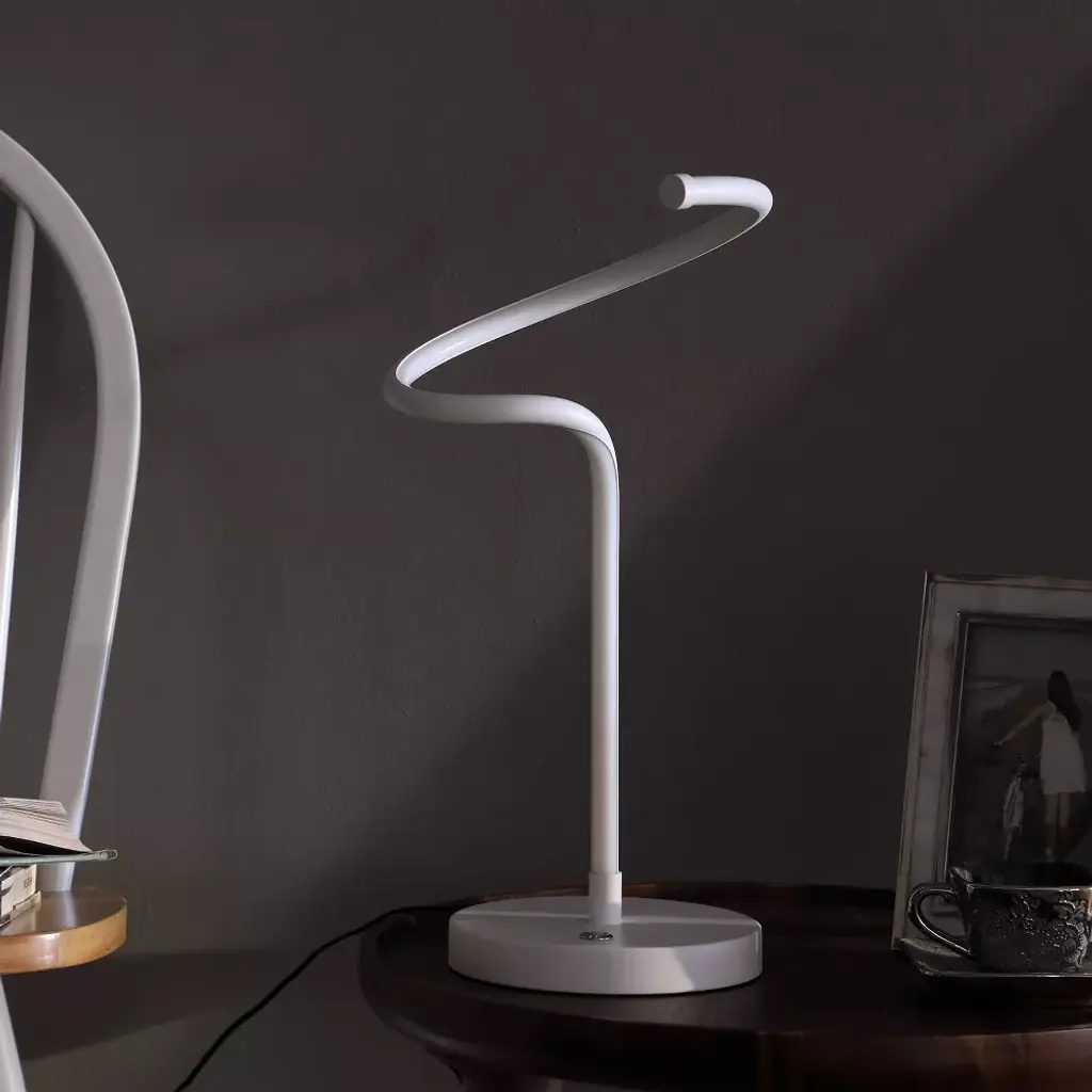 Brighten up a modern space with the stunning glow from this Curvilinear S-Curve Spiral LED table lamp. Revel in modern expressionism with the sculpture-inspired silhouette where the LED Bulb becomes part of the silhouette of this table lamp. Constructed of metal and aluminum, the matte white finish boasts a reflective and visually striking glow. Interesting twists and curves bring a contemporary update to the energy-efficient LED light. Great for a side table in an up-to-date living room or on a nightstand, this lamp makes a bold statement and Illuminating a living room space efficiently. An On/Off multi-functional push-button dimmable switch placed on the base of the lamp for easy access. Press the 1st time to turn ON, press longer to adjust the brightness of the lamp, lets you adjust the light levels to suit your taste and mood. If press the third time to turn off the lamp. The design makes a great light source next to any living spaces, or use in an office setting as a bright work light. Integrated LED fixtures come built in into the fixture. They are designed to provide a specific color and Lumen output and they do not have typical “bulbs” that can be replaced. Integrated LED fixtures typically last for many years, often a decade or more.