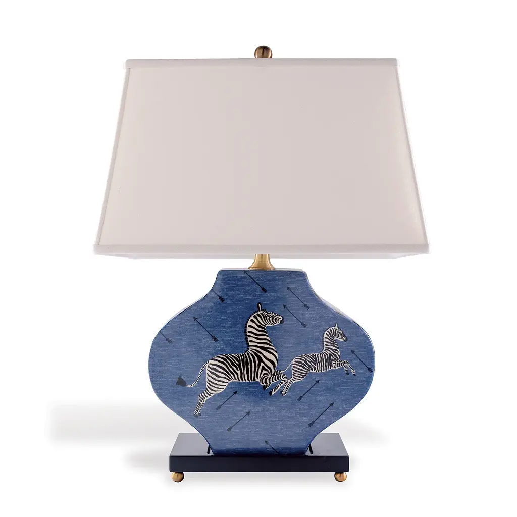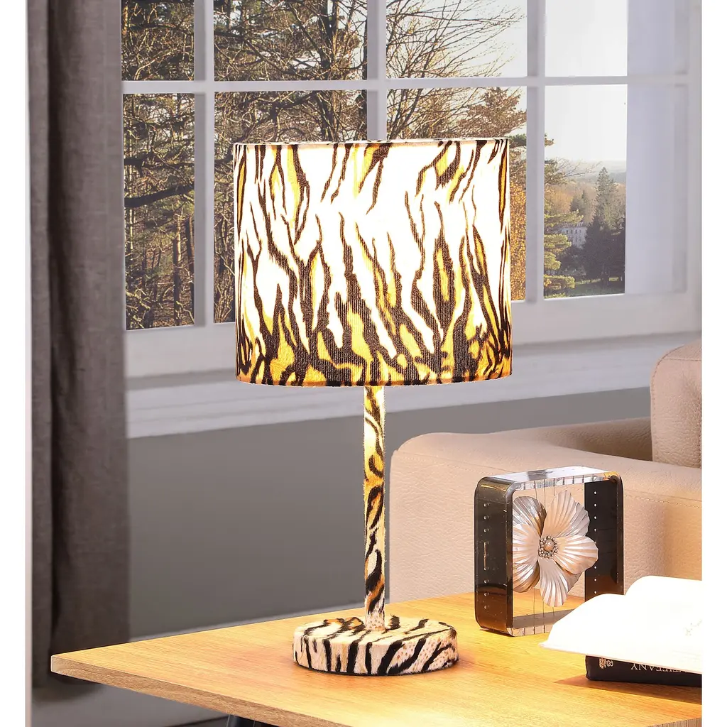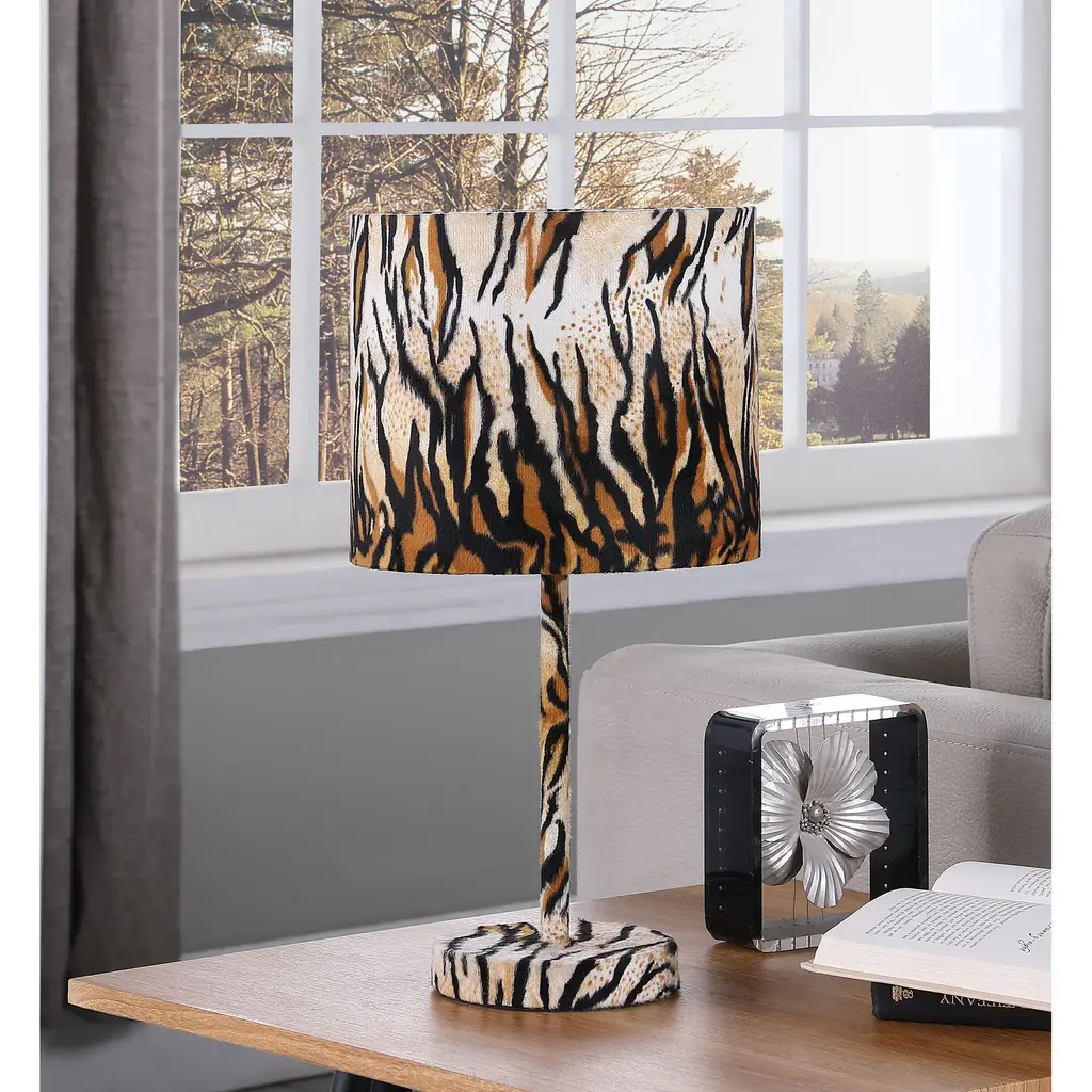 This contemporary table lamp with Tiger pattern shade is a wonderful way to add customized color and accent lighting to a room. The stylish Tiger pattern is complemented by a Tiger pattern table body finish base. Brighten up any room with this animal print table lamp creating a bold statement piece that will add instant style to your home decor. A playful take on safari style, this 19.25" one-light table lamp is ready to cast a warm glow anywhere. This table lamp is defined by its animal-print shade, which matching print on the lamp base for a distinctive look. An on/off switch makes up for convenient lighting control and the Faux Suede Animal print has a soft and cozy surface. Materials: Metal Construction and Faux Suede Base + Faux Suede/Cotton Shade. Finish: Tiger Print. Bulbs: Requires 1 pc 60 Watt Max, A19 Shape Type A (E26 ) Incandescent, CFL or LED Compatible. Fully Assembled Drum Tiger Print Uno-Fitter Shade measures 10"L x 10"W x 8.5"H. Faux Suede Tiger Pattern Metal Table Body measures 7.5"L x 7.5"W x 13.5"H. Faux Suede Tiger Pattern Metal Round Base measures 6"L x 6"W x 1"H. Input Voltage: 110-120V. Black Cord measures 64.5"L. Inline On/Off Switch located on the Black Cord. Distance from the Base to the inline Switch is 12.5"L. UL Listed. Imported. Wipe with a damp cloth for cleaning.