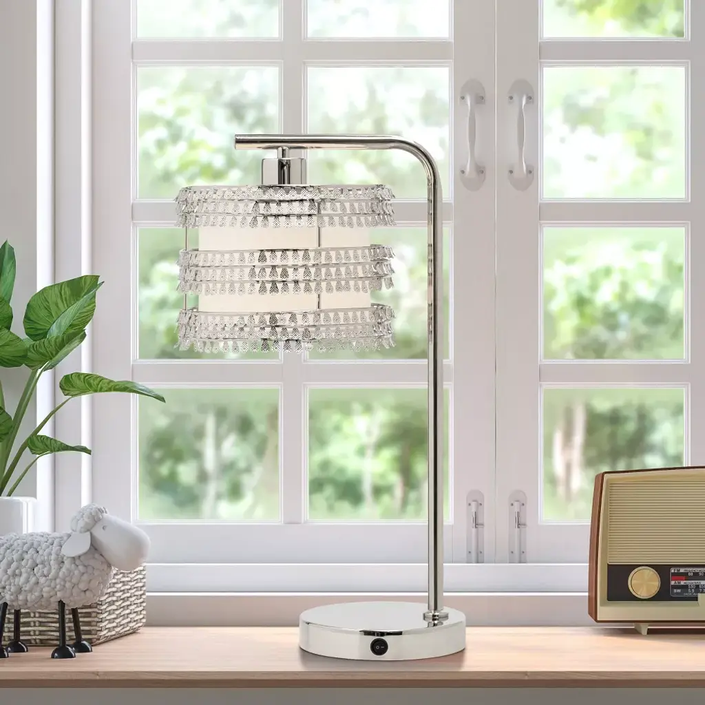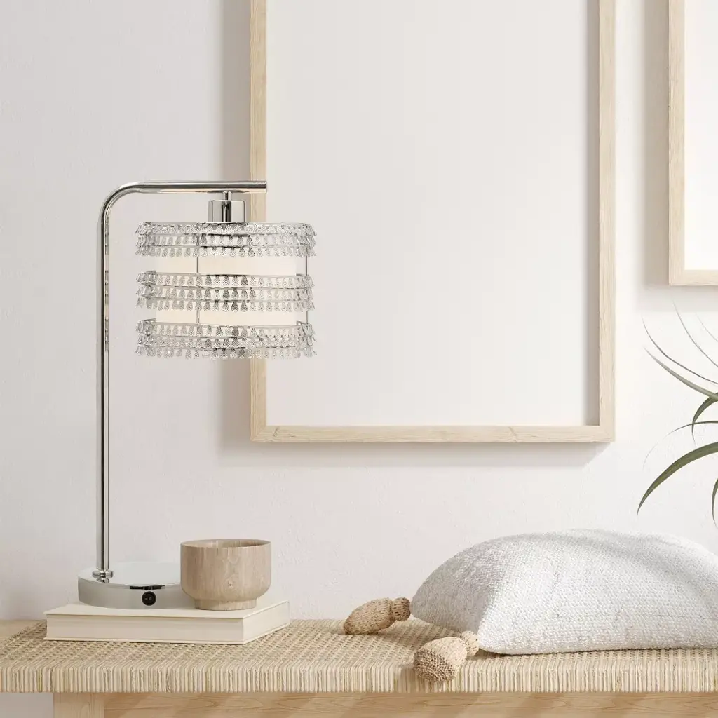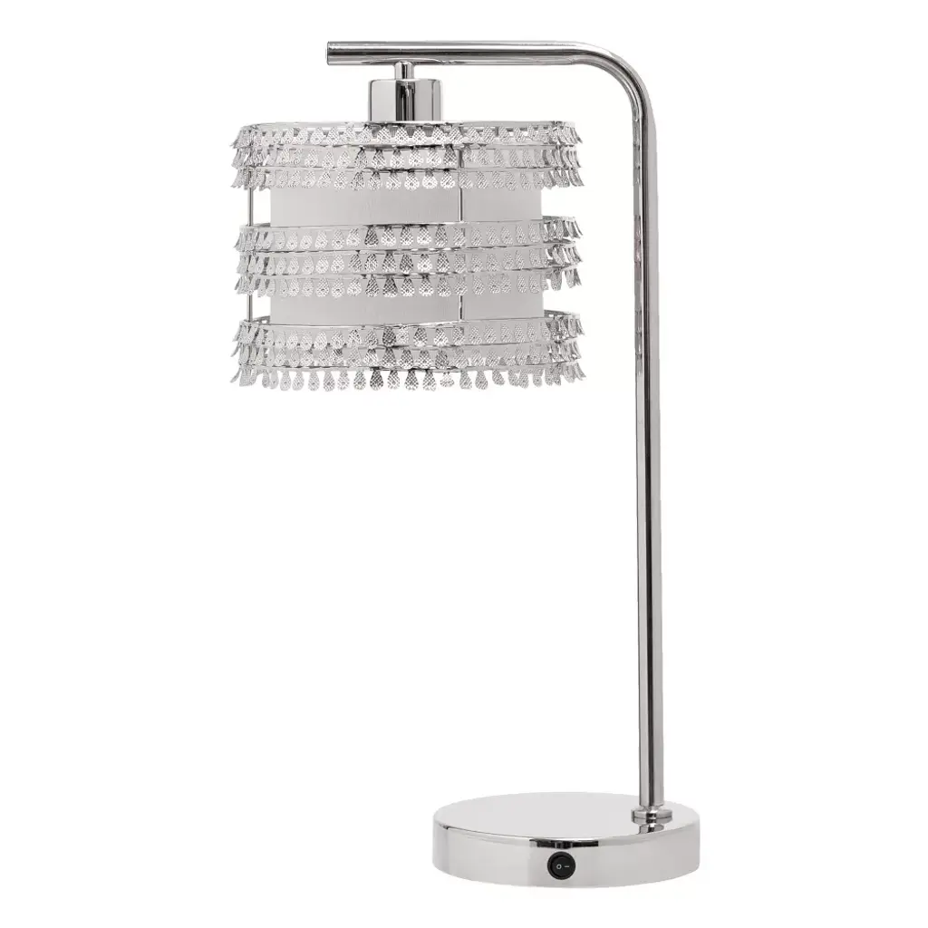Add a glam lighting option to your bedroom, living room or foyer with this 19.5" H Quigley Silver Drum Shade Table Lamp from River of Goods. This table lamp showcases a chrome-finish silver metal candlestick base and a white fabric drum shade with silver metal charms for a standout look with a touch of shine. This multifunctional lamp also features two USB ports so you can easily plug in and charge your devices. The lamp requires one 60-watt E26 bulb (not included) to cast a soft, warm glow, and the 60-inch cord with an on/off switch located on the lamp's base allows for versatile placement in any room.