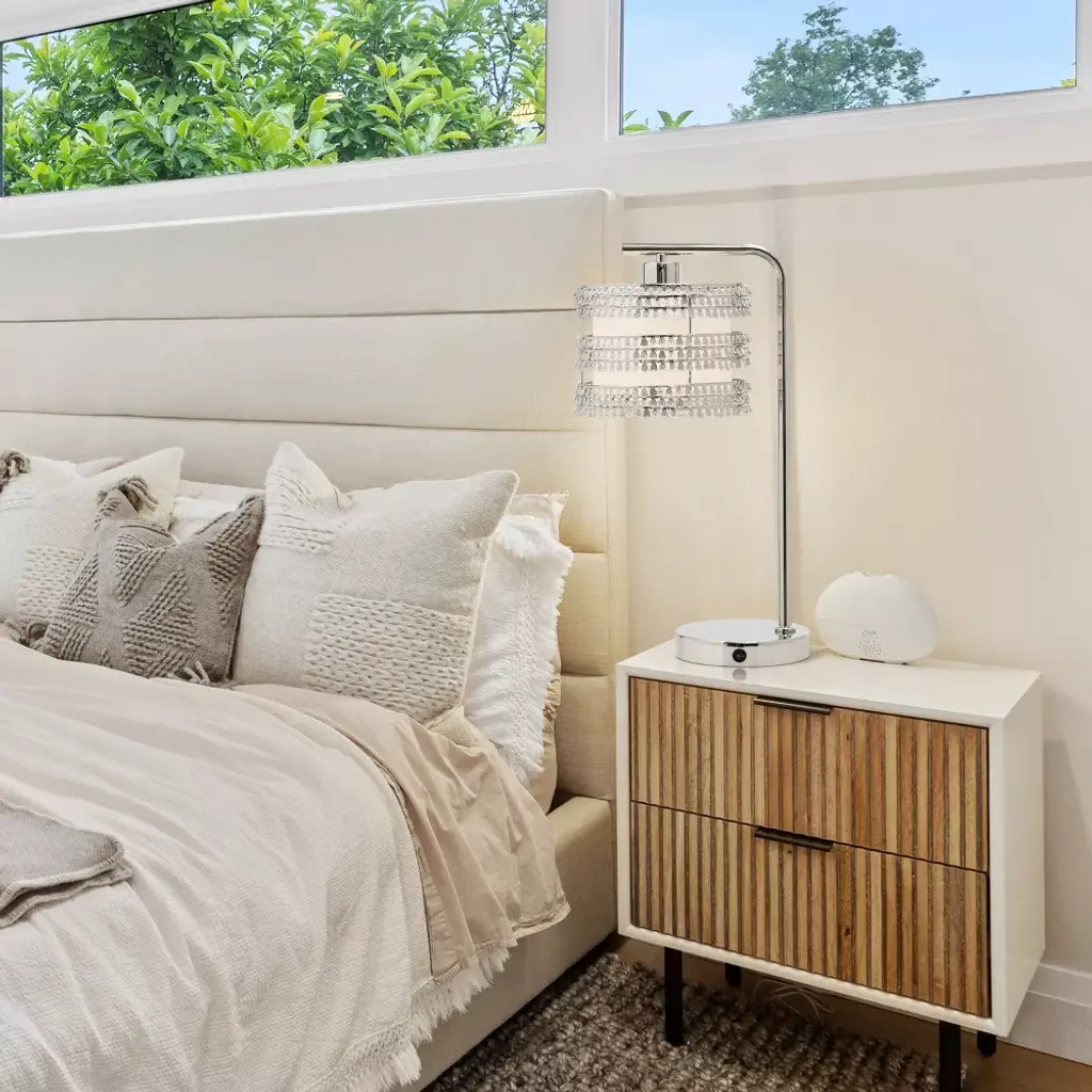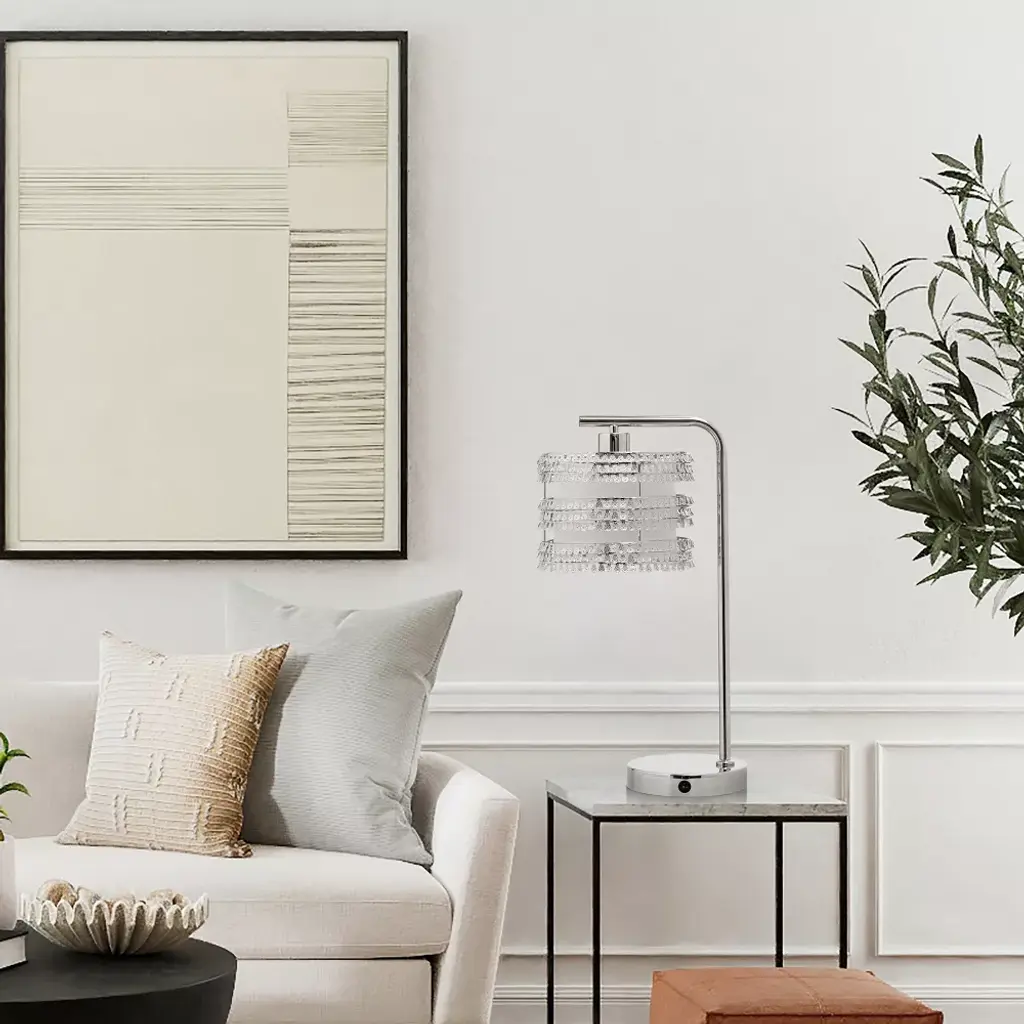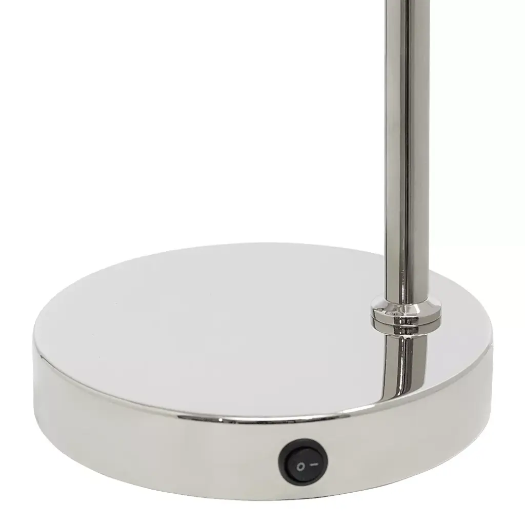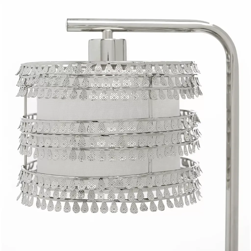 Add a glam lighting option to your bedroom, living room or foyer with this 19.5" H Quigley Silver Drum Shade Table Lamp from River of Goods. This table lamp showcases a chrome-finish silver metal candlestick base and a white fabric drum shade with silver metal charms for a standout look with a touch of shine. This multifunctional lamp also features two USB ports so you can easily plug in and charge your devices. The lamp requires one 60-watt E26 bulb (not included) to cast a soft, warm glow, and the 60-inch cord with an on/off switch located on the lamp's base allows for versatile placement in any room.