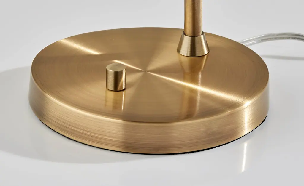 Illuminate your bedroom with the 19" Antique Brass Metal Swirled Smoke Glass Arc Table Lamp. This modern table lamp features a stunning combination of antique brass metal and swirled smoke glass, creating a soft, neutral glow perfect for any nightstand or bedside table. Its arched design adds a touch of sophistication and timeless appeal to your space.