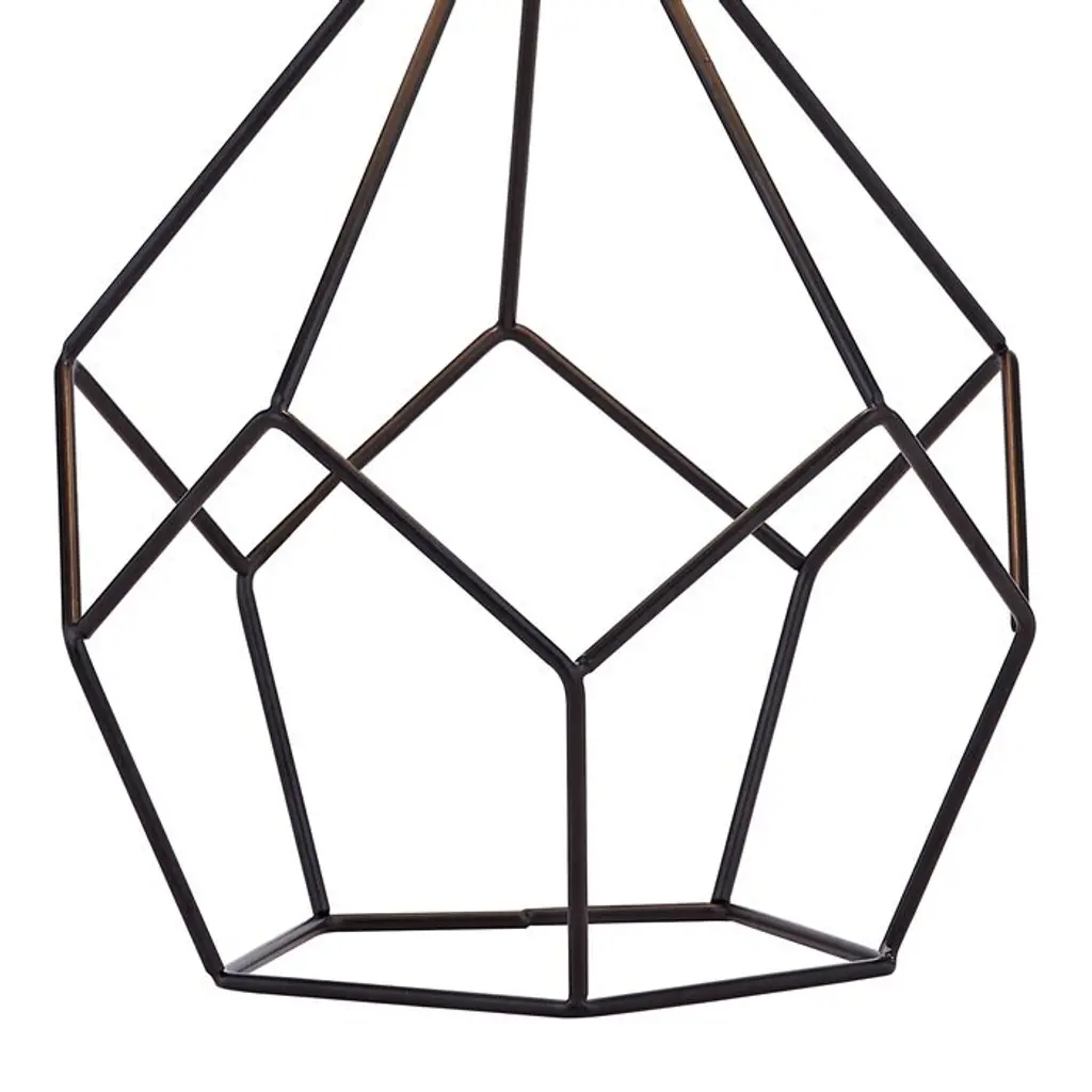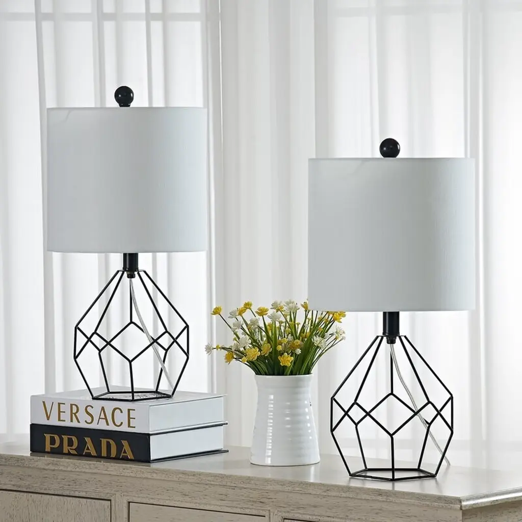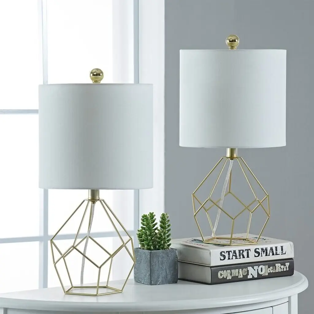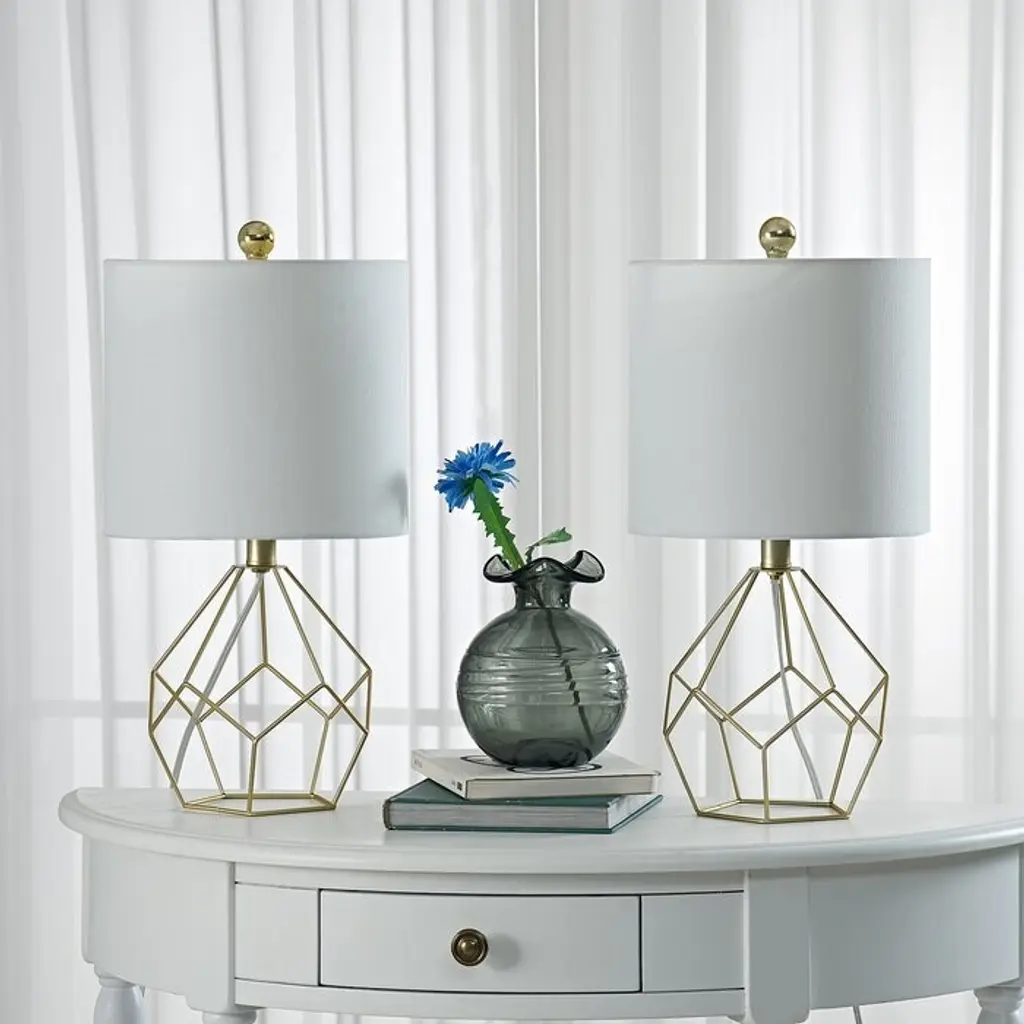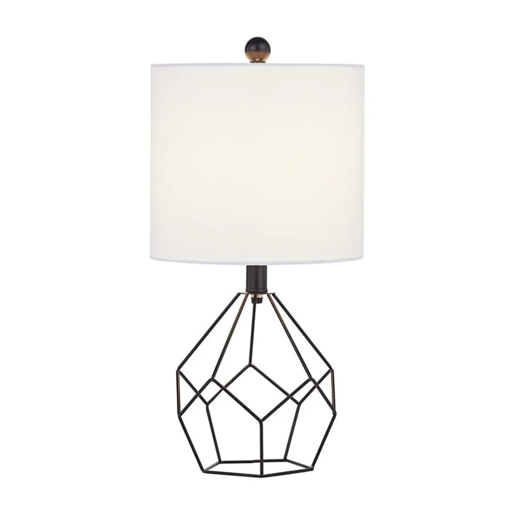 This 2-piece set of accent lamps brings a coordinated, symmetrical look to your end tables or nightstands. Each lamp has an openwork wrought iron base with a sleek geometric design. White fabric drum shades add contrast and soften the light from their 60W bulbs (sold separately). We love that these table lamps have simple yet interesting shapes and chic neutral color palettes that work well with a variety of decor styles.