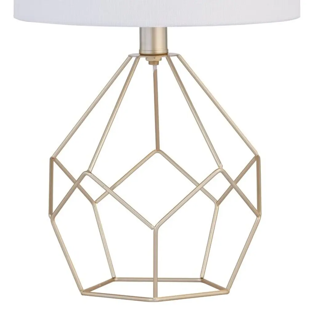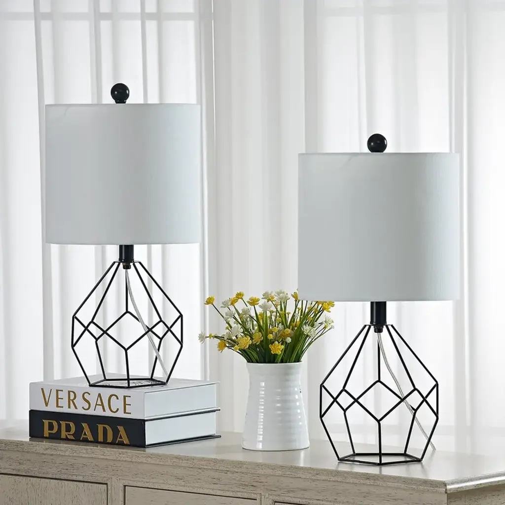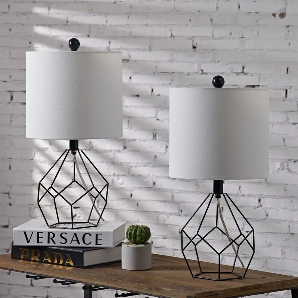This 2-piece set of accent lamps brings a coordinated, symmetrical look to your end tables or nightstands. Each lamp has an openwork wrought iron base with a sleek geometric design. White fabric drum shades add contrast and soften the light from their 60W bulbs (sold separately). We love that these table lamps have simple yet interesting shapes and chic neutral color palettes that work well with a variety of decor styles.