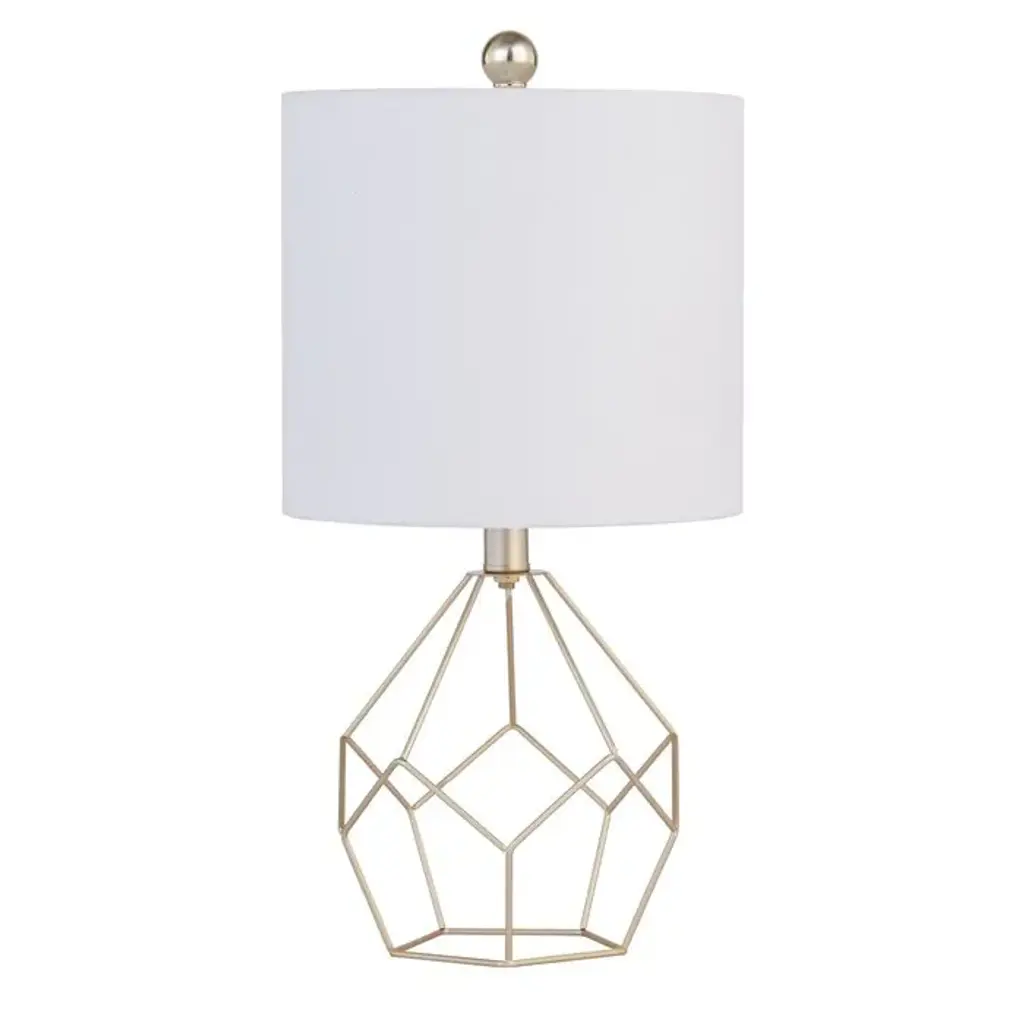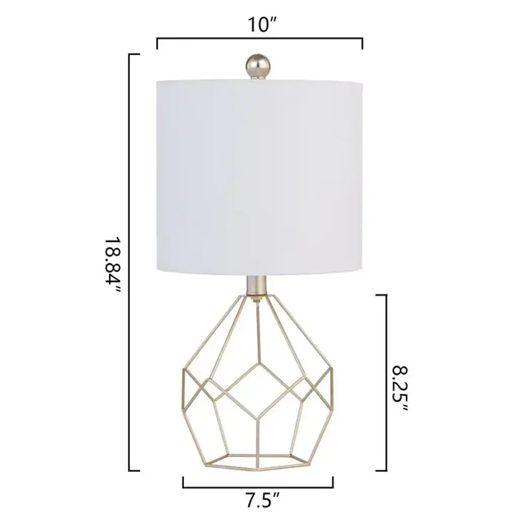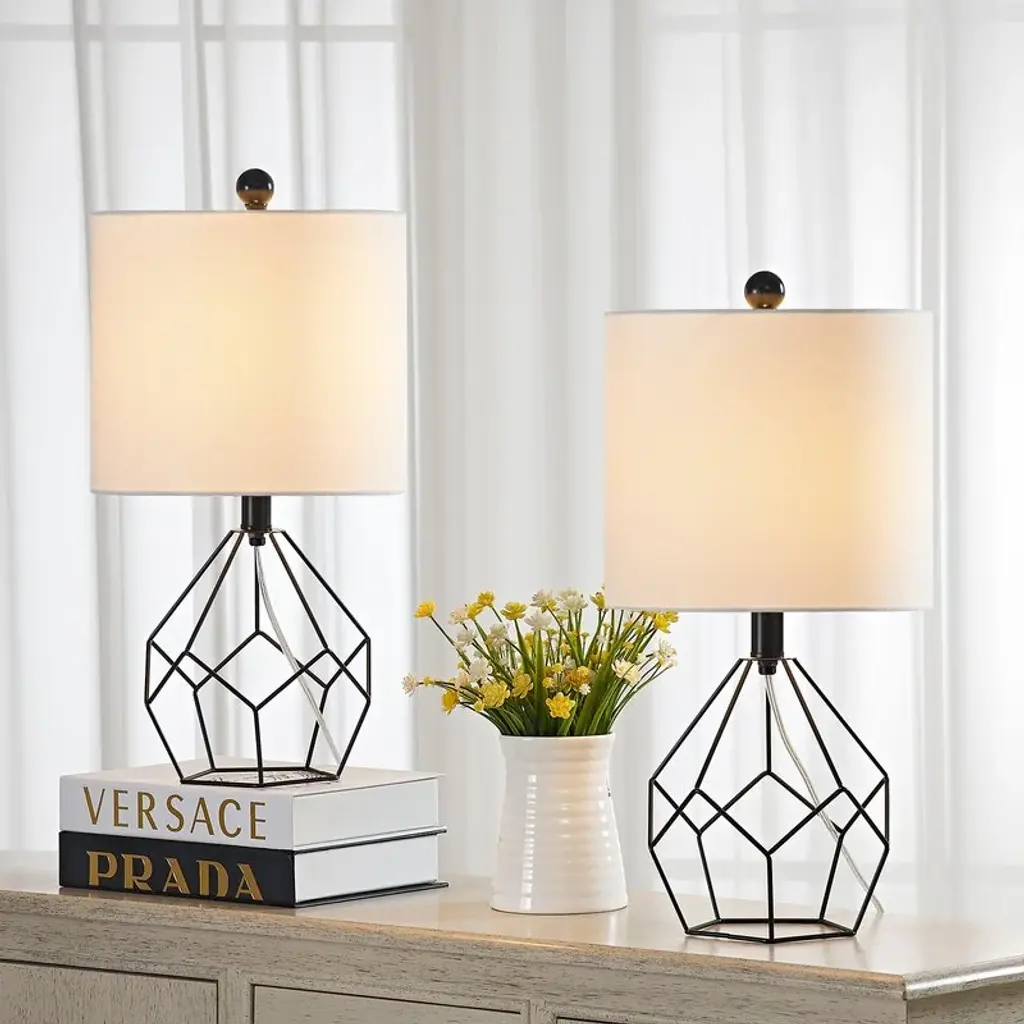 This 2-piece set of accent lamps brings a coordinated, symmetrical look to your end tables or nightstands. Each lamp has an openwork wrought iron base with a sleek geometric design. White fabric drum shades add contrast and soften the light from their 60W bulbs (sold separately). We love that these table lamps have simple yet interesting shapes and chic neutral color palettes that work well with a variety of decor styles.