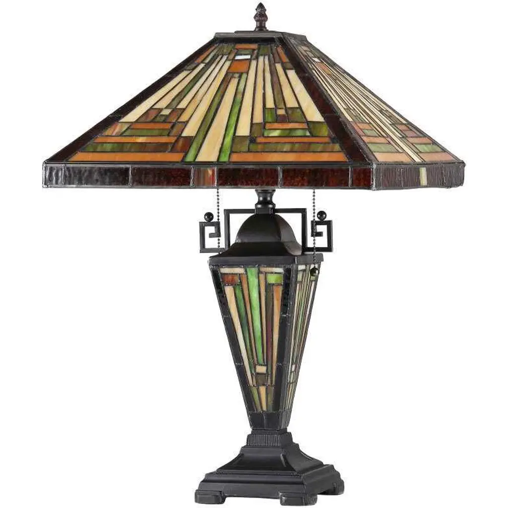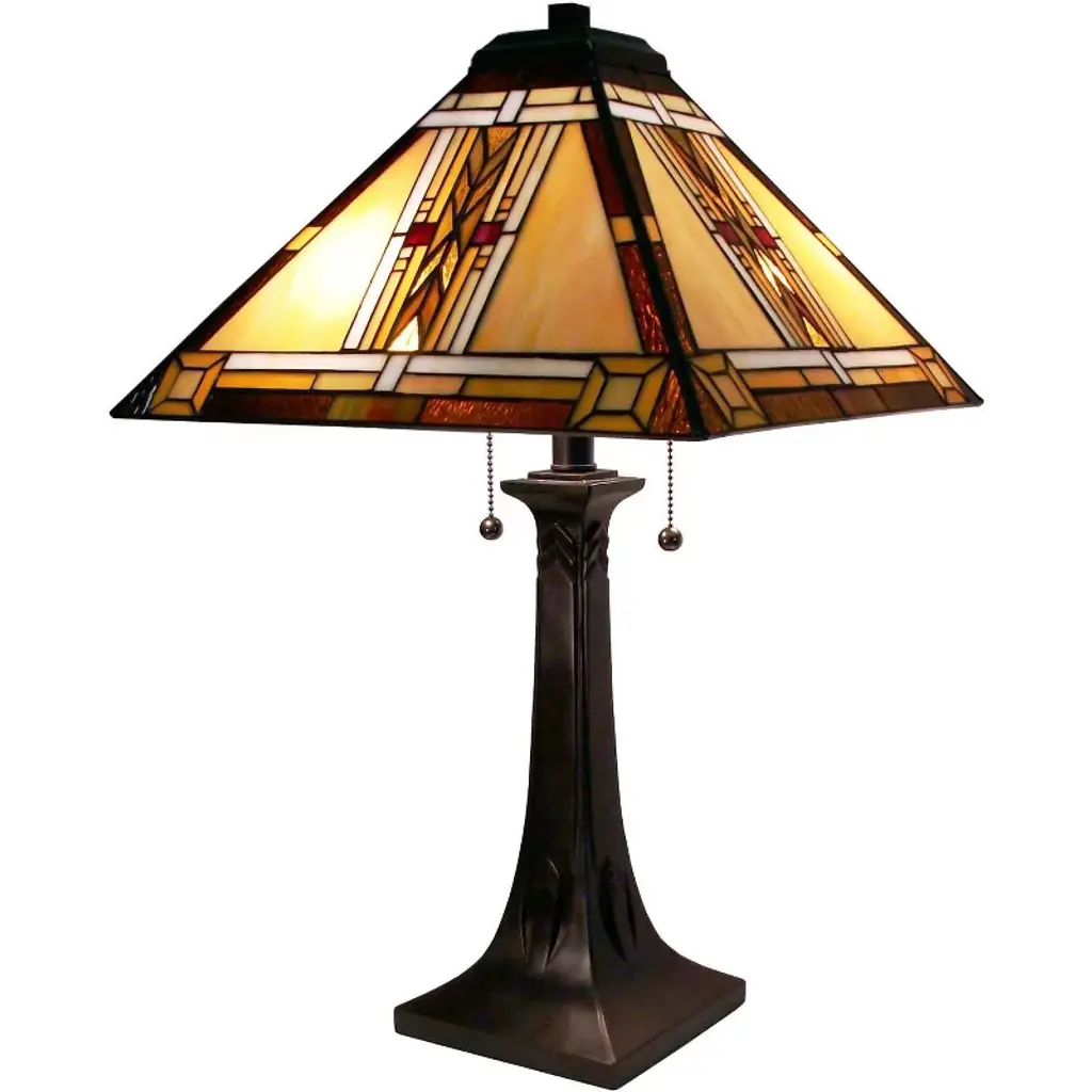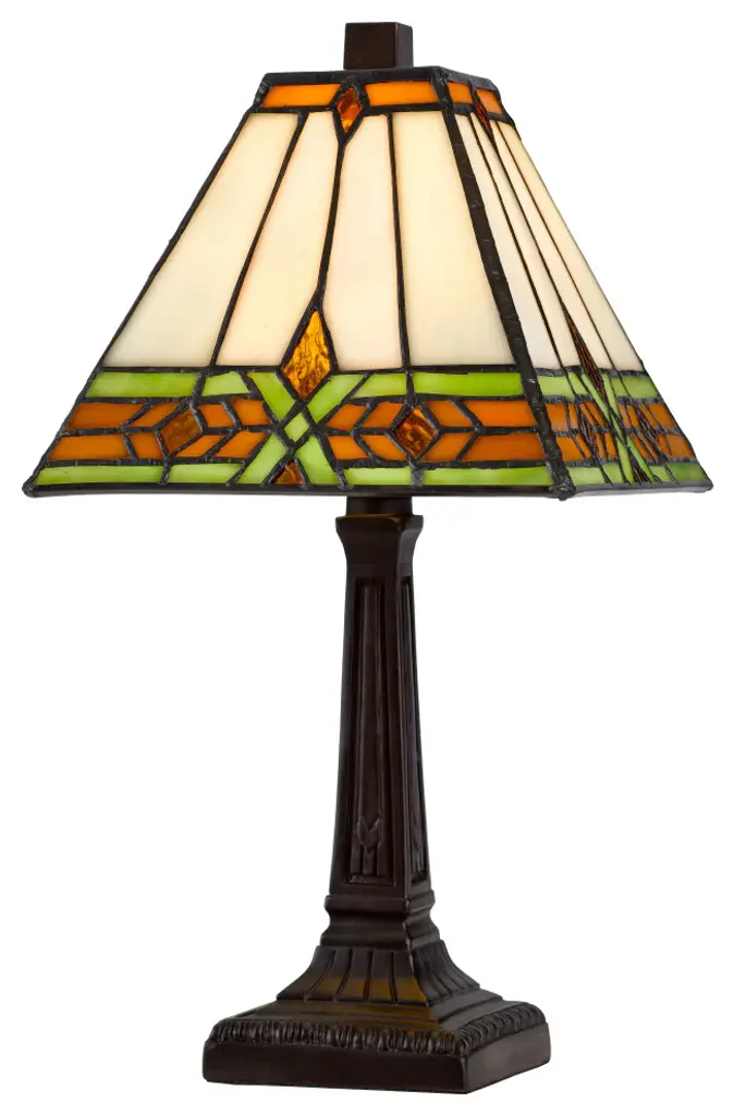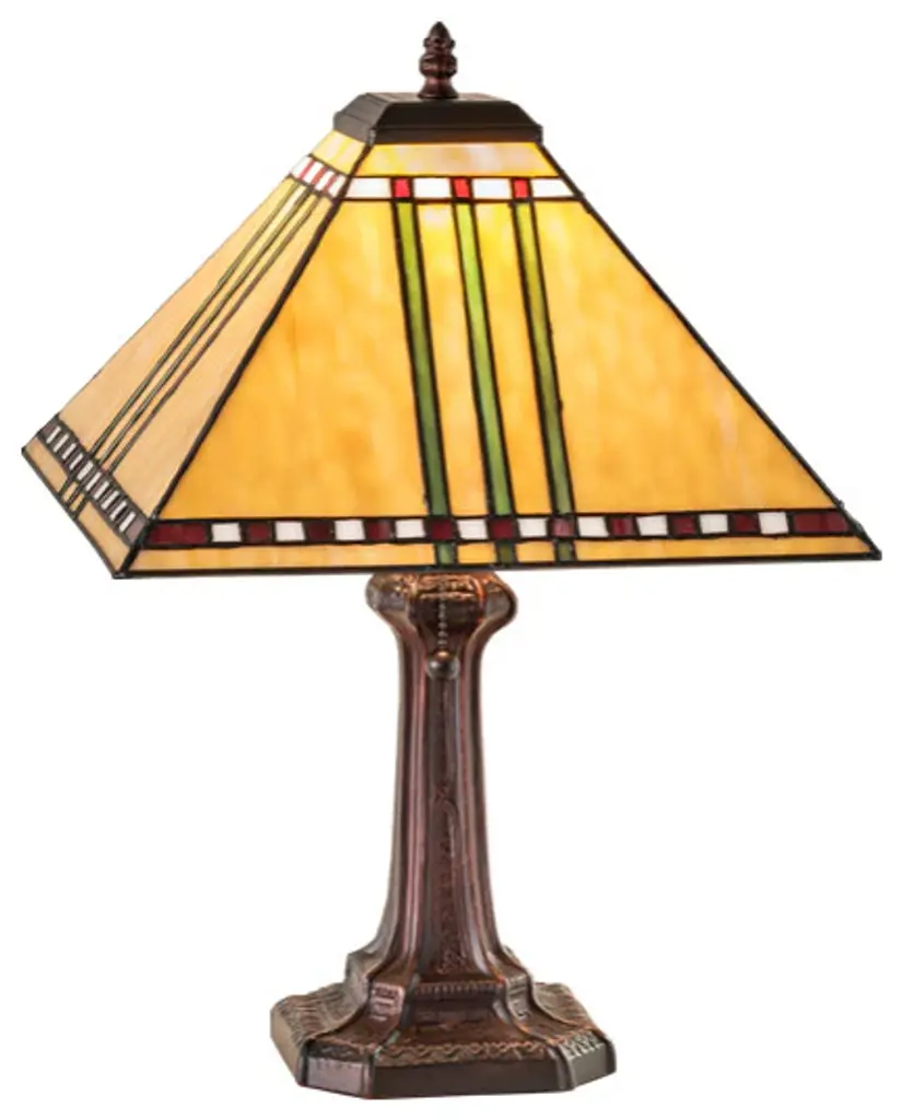 With their love of geometric forms; architects of the Prairie School interpret organic objects into simplified lines. The Meyda Tiffany Prairie Corn table lamp shade features rows of Chili Red and Wheat kernels and stalks of Bronzed Jade against a Maize Gold background. This stunning stained glass shade is created using the famous Meyda Tiffany copperfoil construction process. The shade is paired with an exquisite Gothic table base in a Mahogany Bronze finish. UL and cUL listed for dry locations.