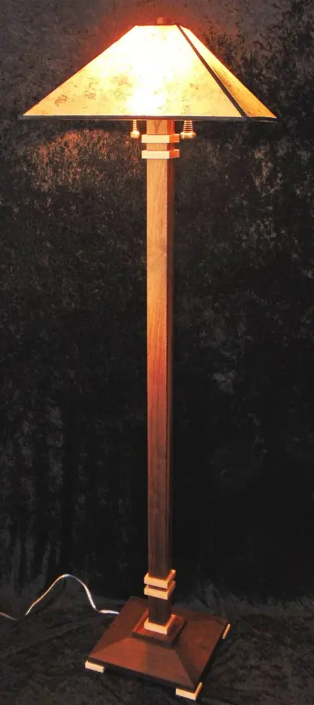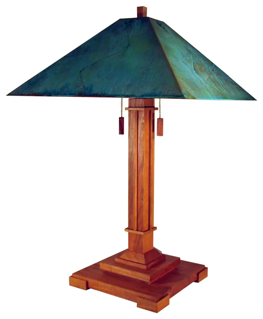 1919 Mission lamp is 26" tall made White Oak has a green copper shade has 2 pull chain sockets 75 W per socket