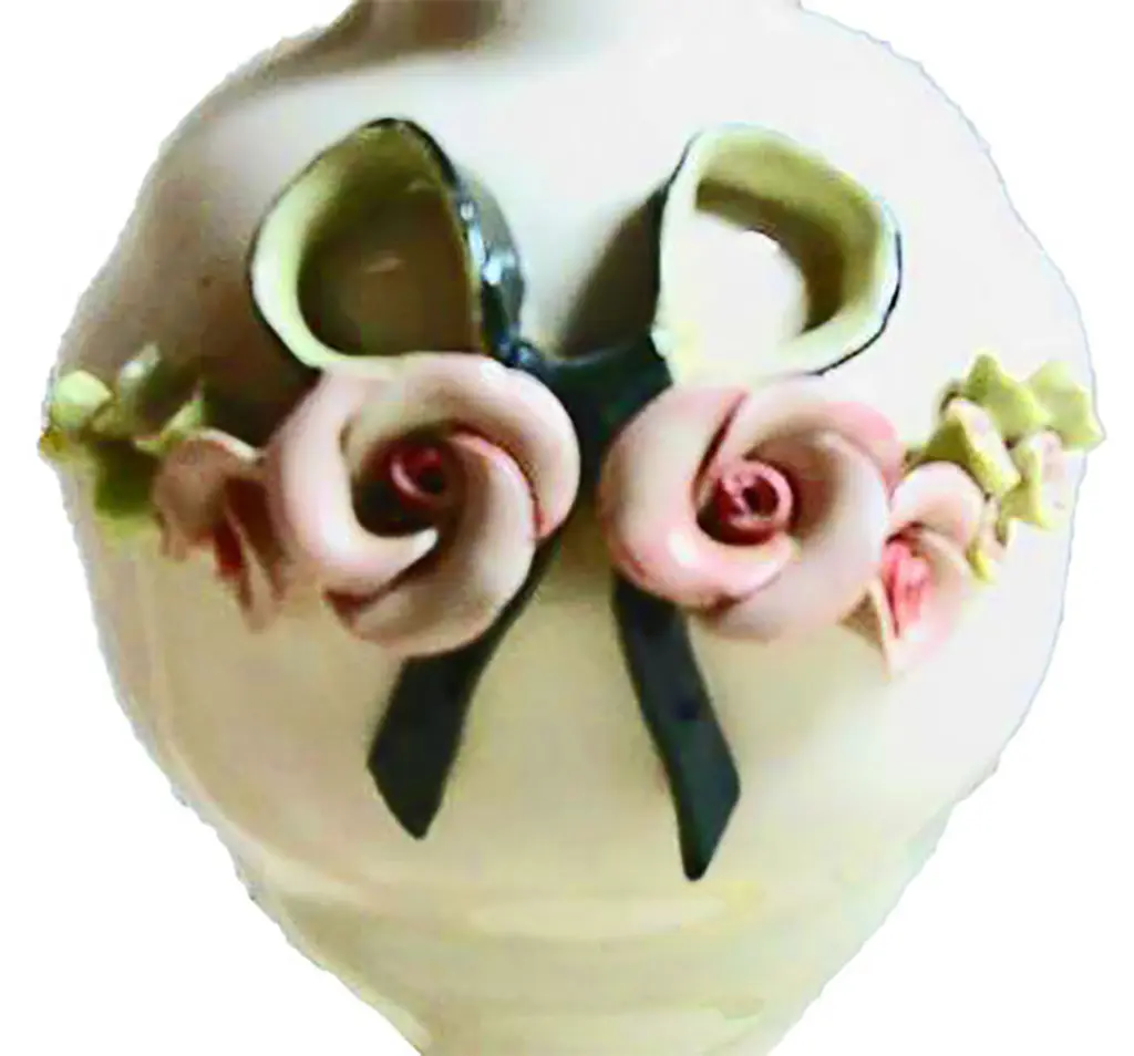 1930s porcelain lamp with delicate green ribbons, pink rose blossoms, matching harp and porcelain finial on a octagonal chased brass base. Standard E26 socket accepts 50W - 250W bulb. Estate item from the 1930s. No maker's marks. Dimensions: 4.75"W x 4.75"D x 25"H (with harp & finial); 17"H (to top of socket). Very good vintage condition with newer socket, sturdy wiring, and 2-prong plug.