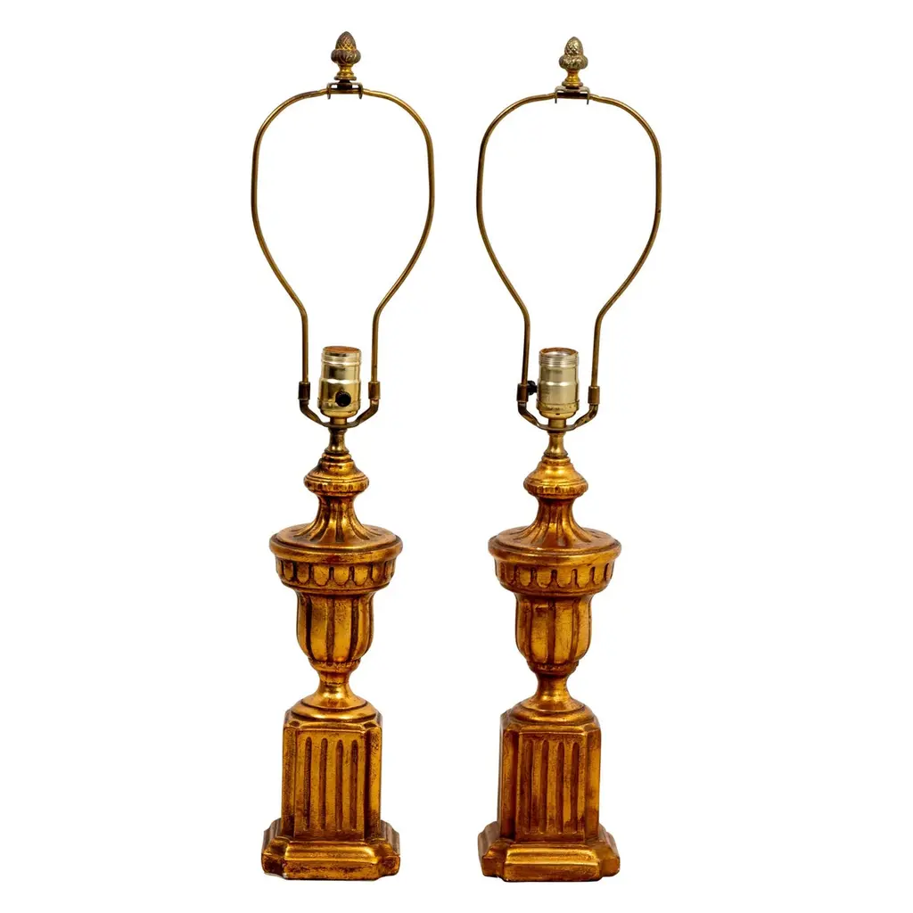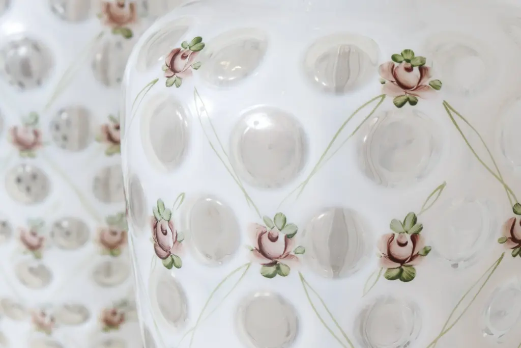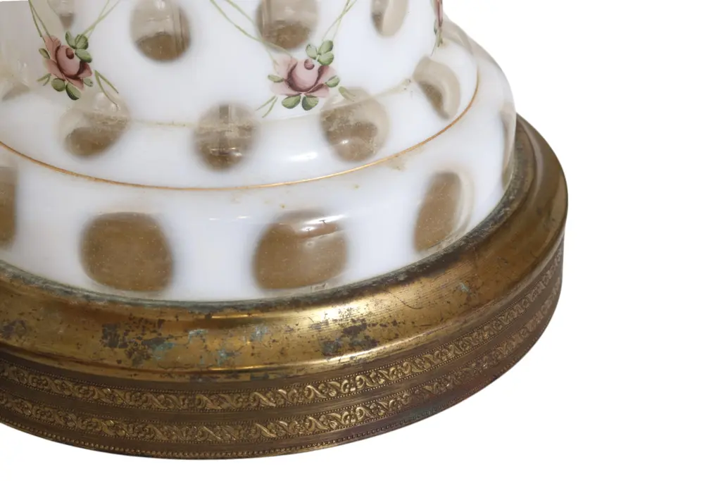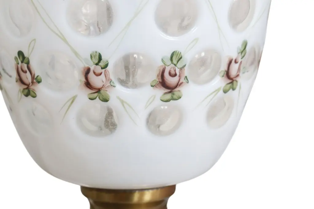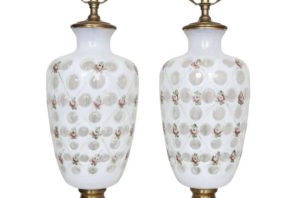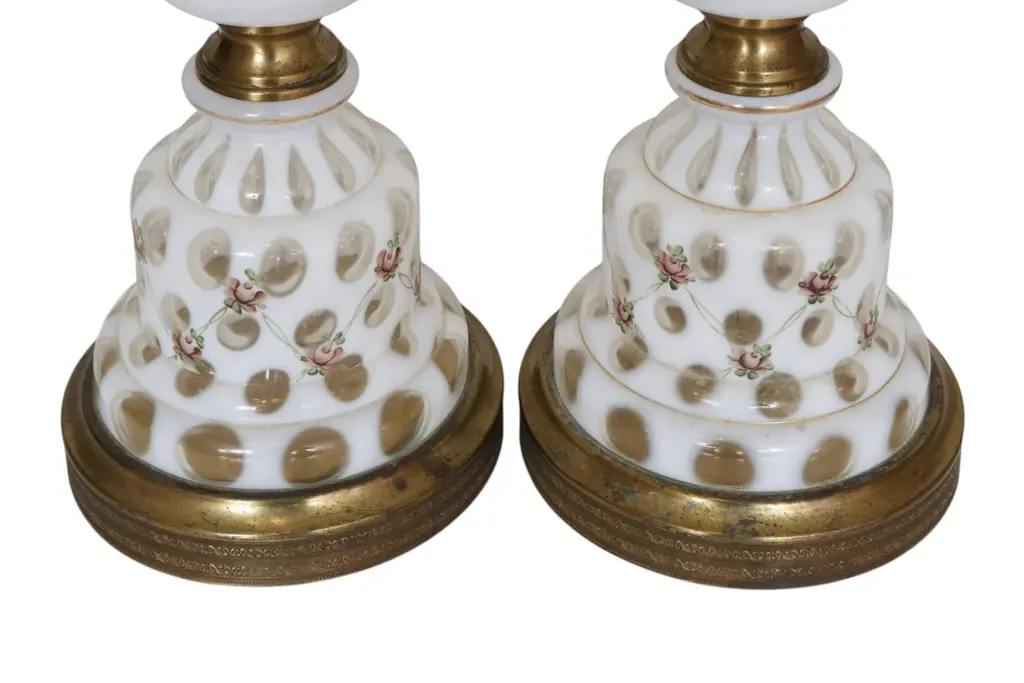 A pair of hand-painted French Opalescent White Coin Dot glass lamps made by Fenton. Vases are made with a milky-white over clear glass pattern, inspired by the Victorian glass pattern known as "Polka-Dot". Each dot reflects several others like a lens, giving the illusion of a multitude of dots within each dot. The lamps are hand painted with roses on a lattice of ribbons that reach between the dots. Finished with brass caps and round brass bases. 23"H to top of socket, 35.25"H to top of finial.