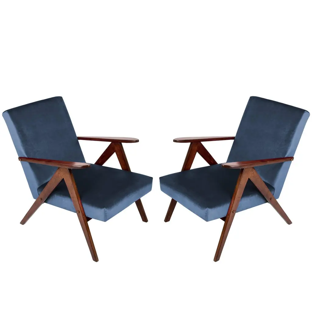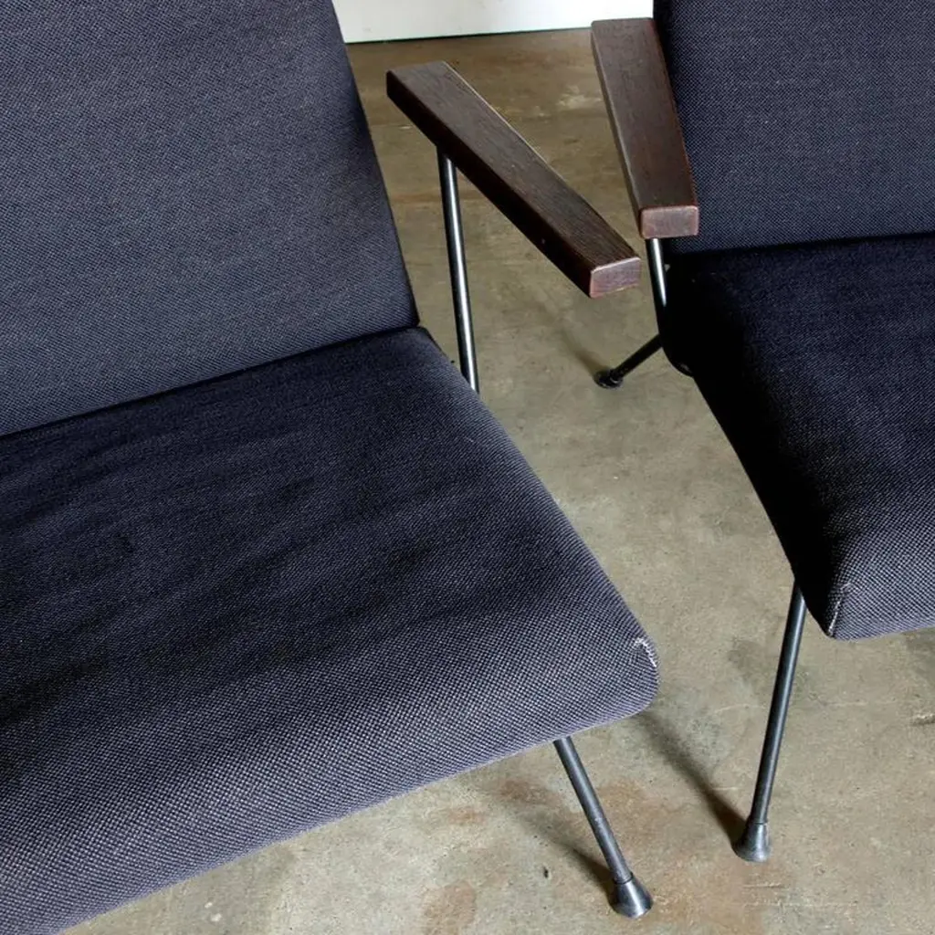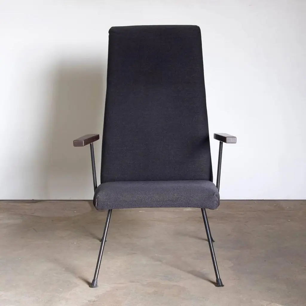 This item is part of the private collection of Casey Godrie and is situated in his private house. Ask him for competitive shipping quotes. His incredible Dune Villa, Amsterdam Beach, check last pictures on this listing and find more details on his family name plus eu, is for sale soon too. :-)Set of two elegant armchairs. Beautiful floor caps. Upholstery is in fair condition, with some color loss at some of the stitching.This easy chair is fully upholstered in a dark blue / black wool fabric, with a black metal frame and solid wenge armrests, all in good condition. This model (1410) is identical to its little sister (model 1409), but has a high back and is a more unique piece and is more comfortable seating.One more piece, with fabric in less condition, in stock, ready to upholster in your favorite fabric or (faux) leather.On request reupholstery is possible in any kind of leather or fabric of your choice. Please ask for more information and the many possibilities by our in-house atelier.Measures: Weight 17 kg each.Free shipping for Amsterdam, Haarlem and IJmuiden for lamps, chairs, small items as tables and office desks, small not too heavy couches. Rest of Holland €133, for European destinations starting at € 95, depending on the item and country of your selection. Further on discounted shipping to all intercontinental destinations starting at €125, depending on the item and country or state of your selection. We offer a variety of restoration and shipping services, high service white glove shipping, parcel shipping and store-to-door shipping, suitable for all your preferences. Our specialized shipping department can inform you about all the details, ask us for the customized possibilities and very competitive pricing.