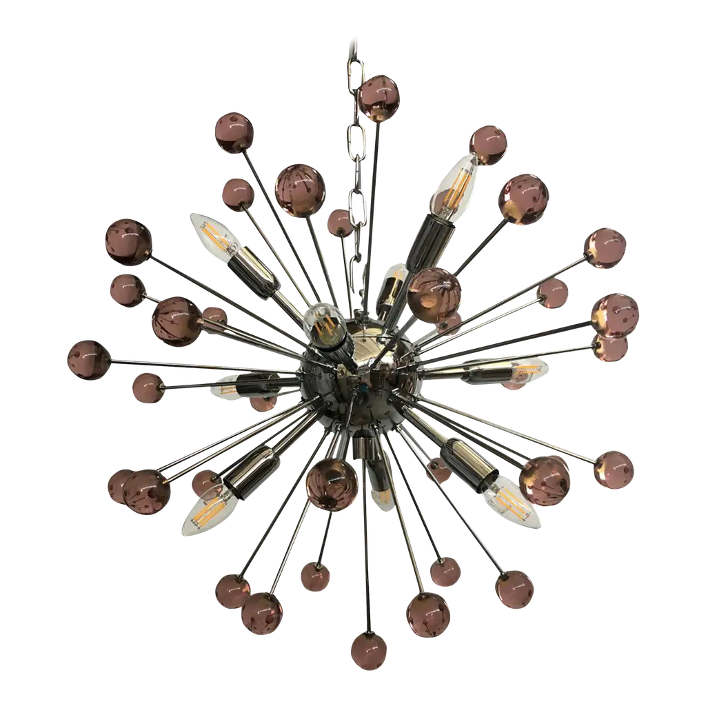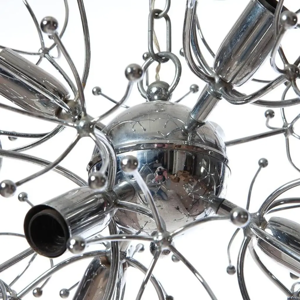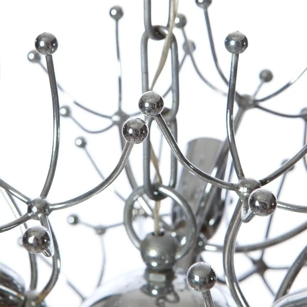 Sensational 1960's Sputnik chandelier by Gaetano Sciolari. The light starts with chrome bal with attached six stems containing a light bulb. Each stem has 5 smaller stems and again another 5 stems holding a little chrome ball at each end.Please note, we have two chandeliers in stock and also two table lamps. The table lamps have two stems on either side. With again 5 smaller stems and another 5 stems with small balls at the end. Positioned on any side as pleased.