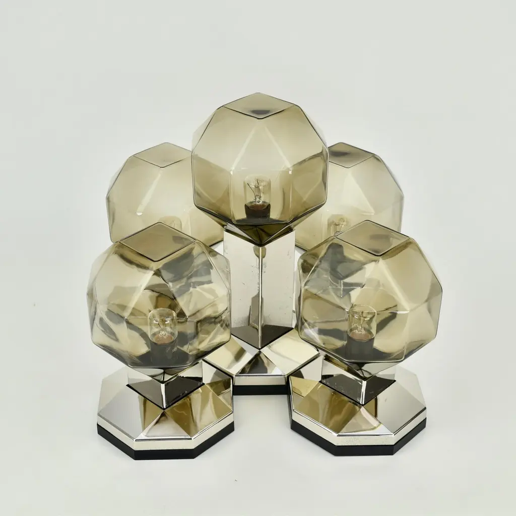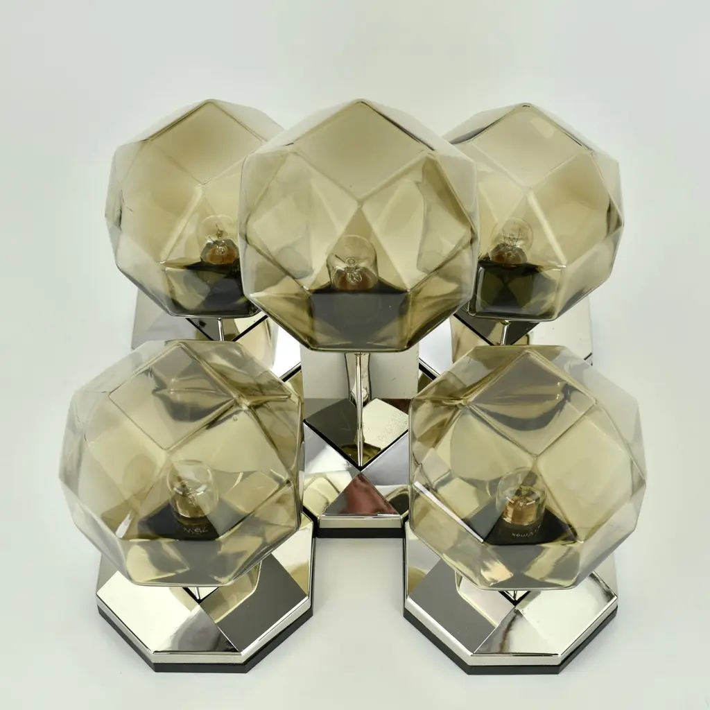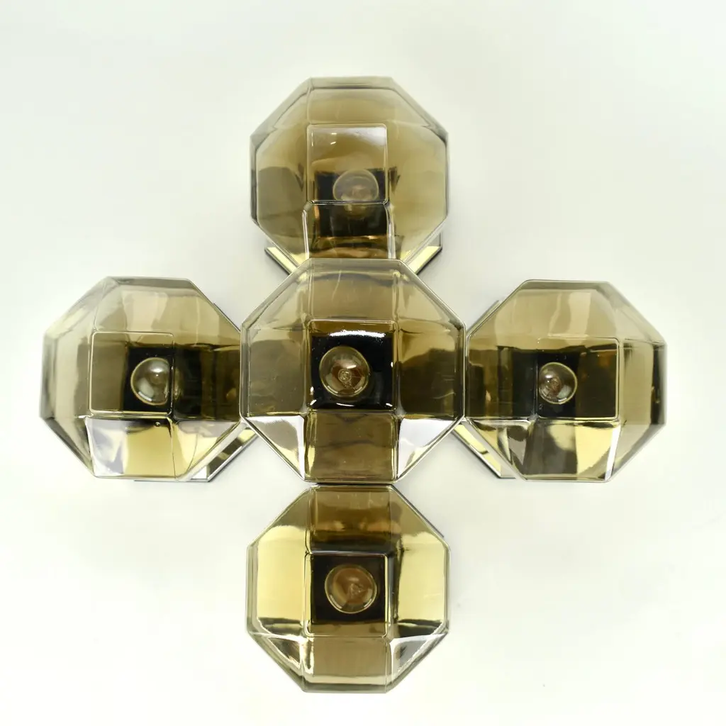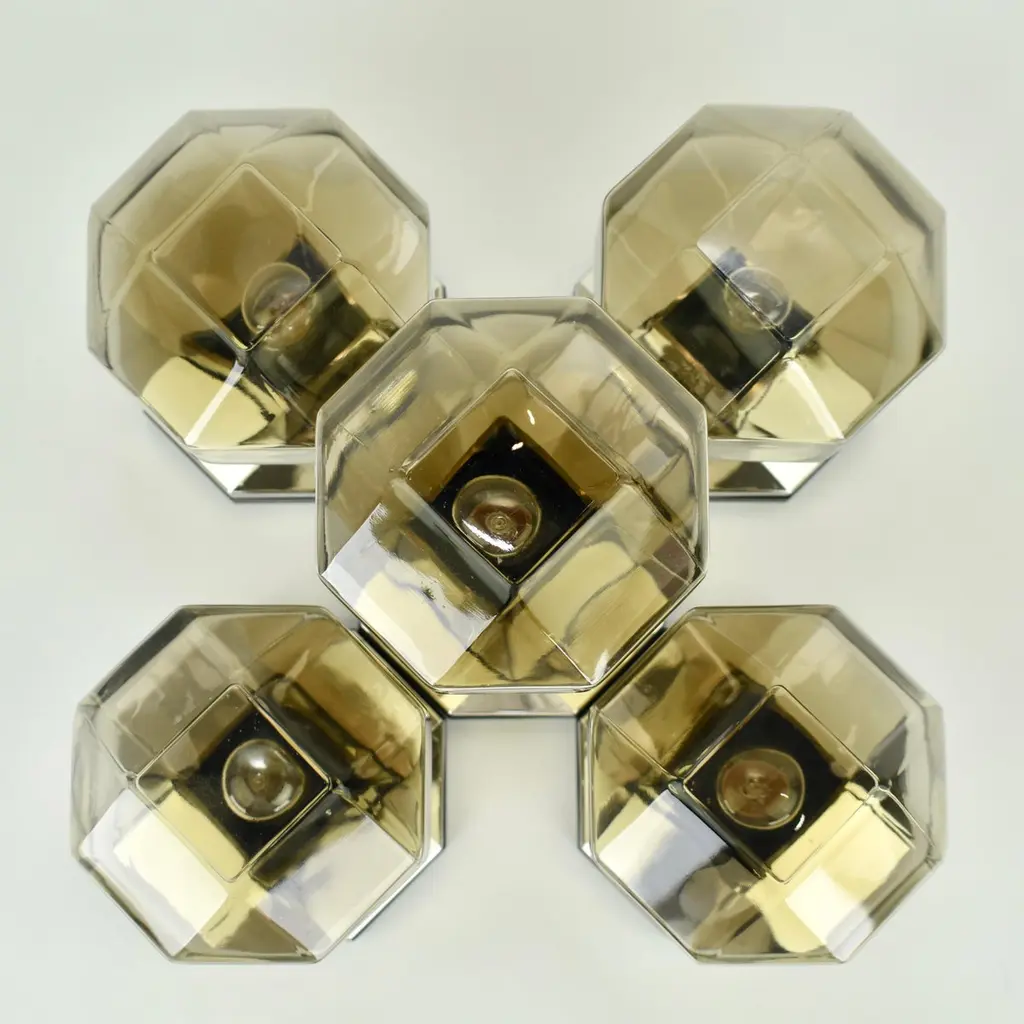 Stunning modular light fixture designed by Motoko Ishii for Staff Leuchten. The lights where made in the 1970s in Germany and consist of a gold plastic base and smoke colored glass shade. Because this lamp was designed to be modular, different outlays are possible. I have more pieces available on request.The glass shades are all in great undamaged condition. The plastic base has been metallized with a thin layer of brass. They have some wear and patina.The price is for the depicted module consisting of 5 lights.Diameter per piece: 13 cm / 5.1"Height small light: 19 cm / 7.5"Height large light: 27 cm / 10.6"