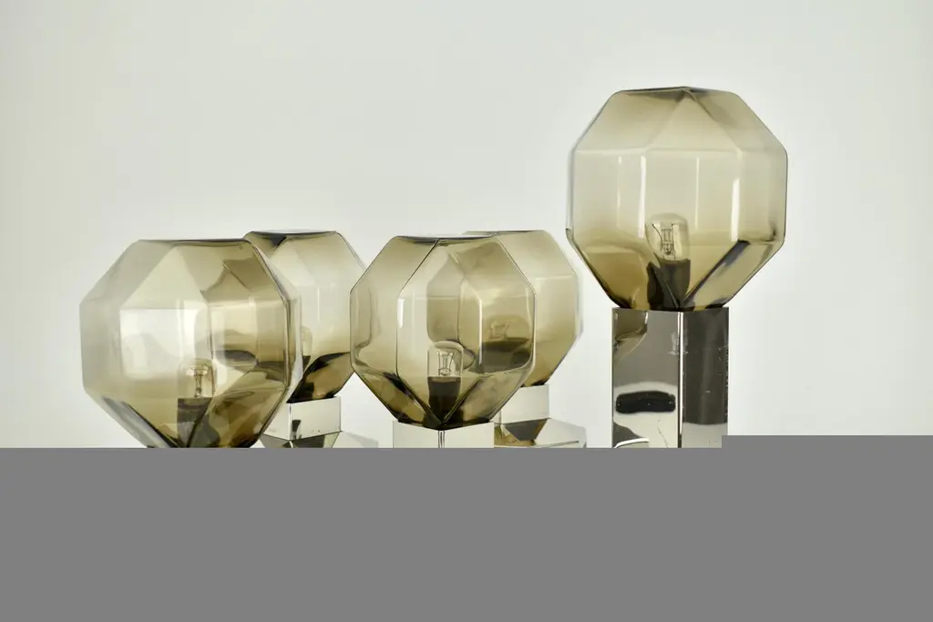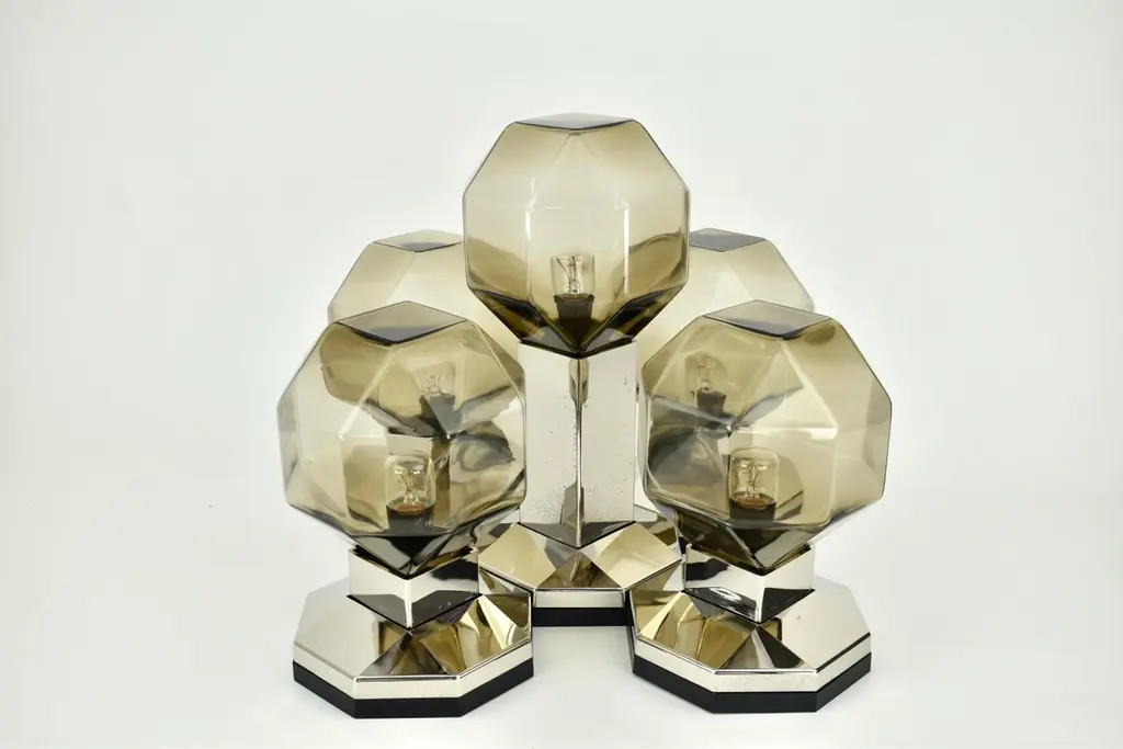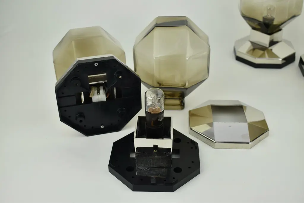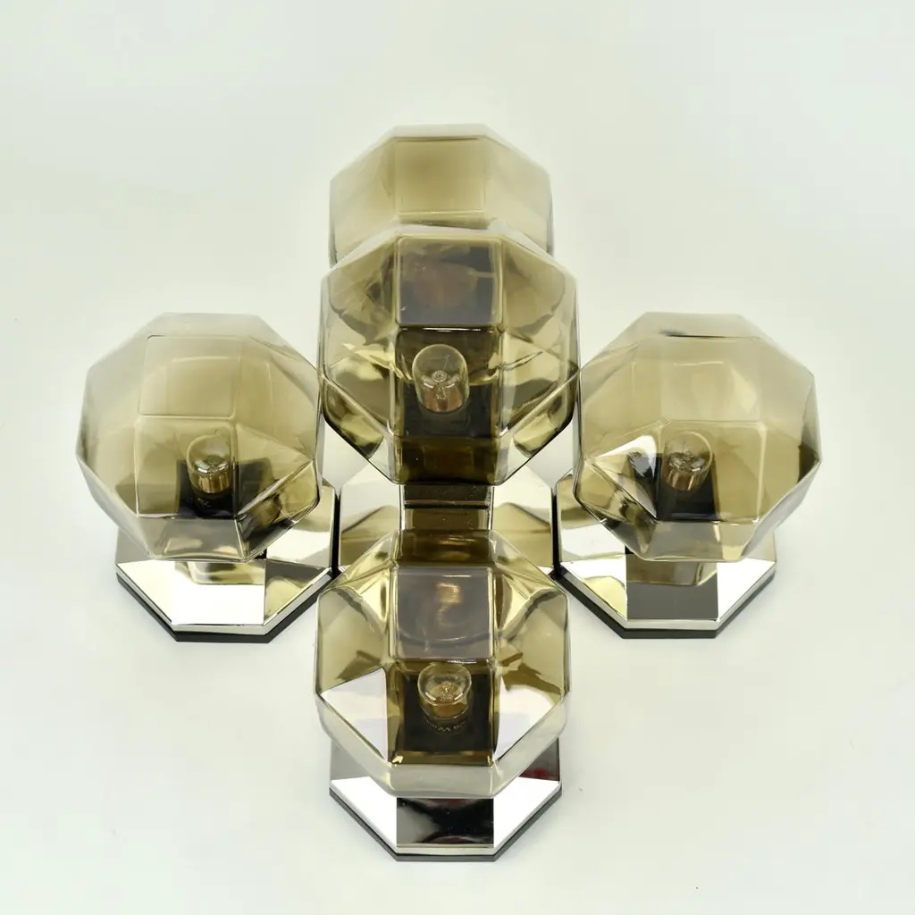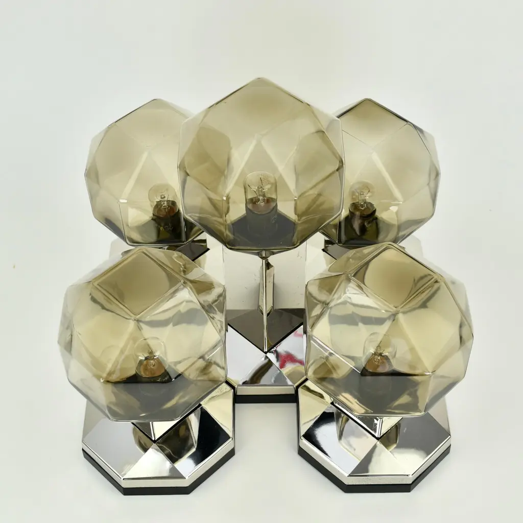 Stunning modular light fixture designed by Motoko Ishii for Staff Leuchten. The lights where made in the 1970s in Germany and consist of a gold plastic base and smoke colored glass shade. Because this lamp was designed to be modular, different outlays are possible. I have more pieces available on request.The glass shades are all in great undamaged condition. The plastic base has been metallized with a thin layer of brass. They have some wear and patina.The price is for the depicted module consisting of 5 lights.Diameter per piece: 13 cm / 5.1"Height small light: 19 cm / 7.5"Height large light: 27 cm / 10.6"