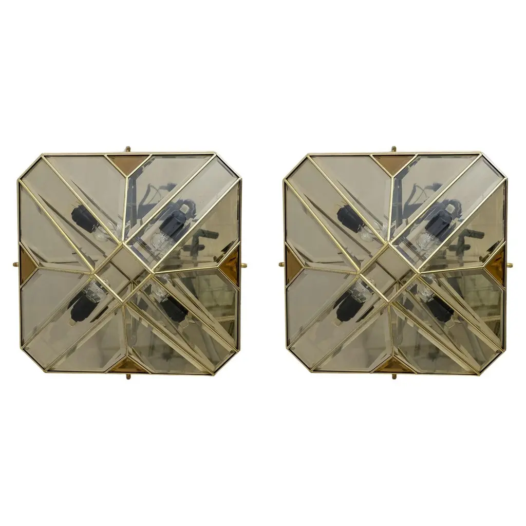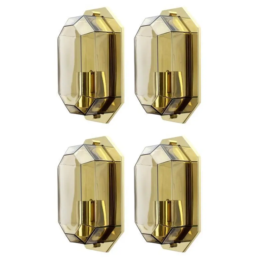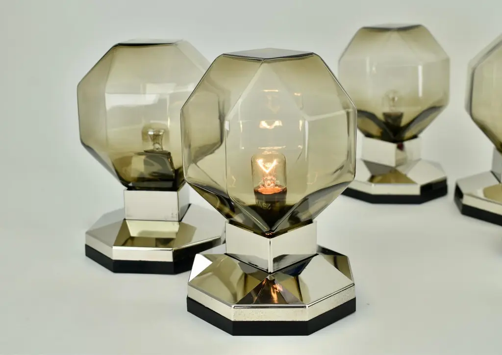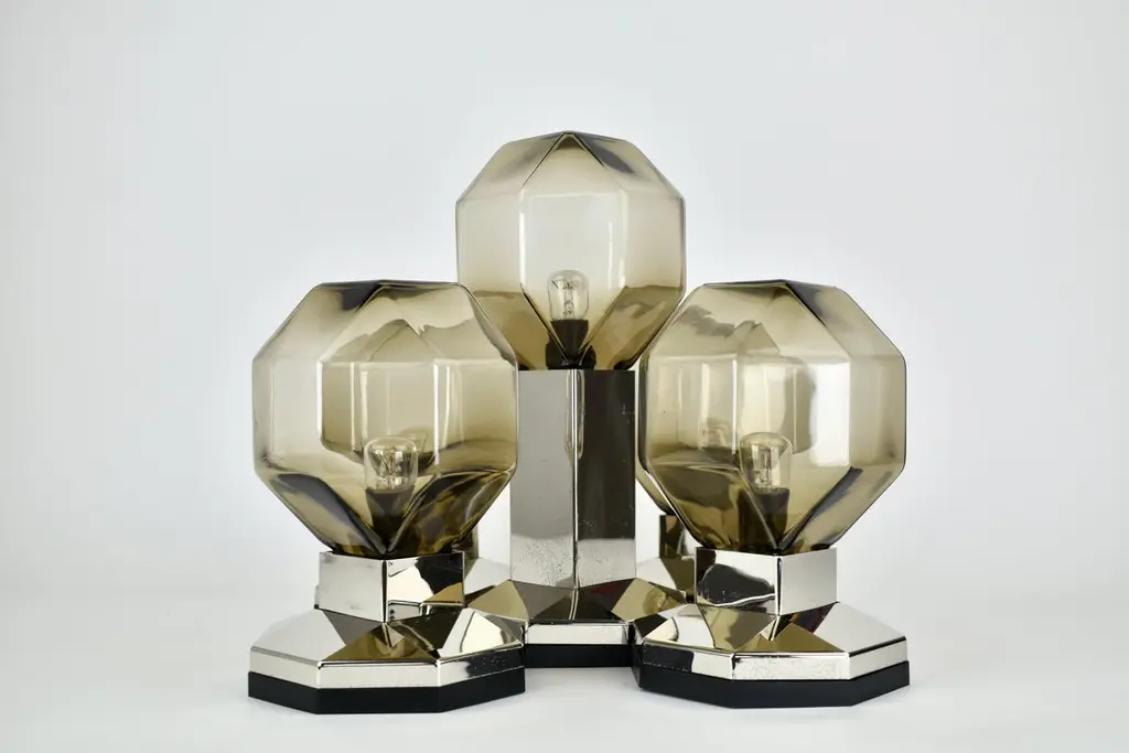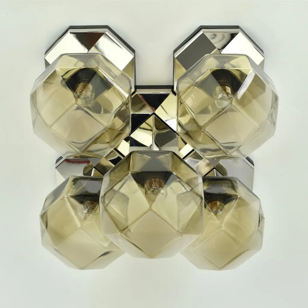 Stunning modular light fixture designed by Motoko Ishii for Staff Leuchten. The lights where made in the 1970s in Germany and consist of a gold plastic base and smoke colored glass shade. Because this lamp was designed to be modular, different outlays are possible. I have more pieces available on request.The glass shades are all in great undamaged condition. The plastic base has been metallized with a thin layer of brass. They have some wear and patina.The price is for the depicted module consisting of 5 lights.Diameter per piece: 13 cm / 5.1"Height small light: 19 cm / 7.5"Height large light: 27 cm / 10.6"