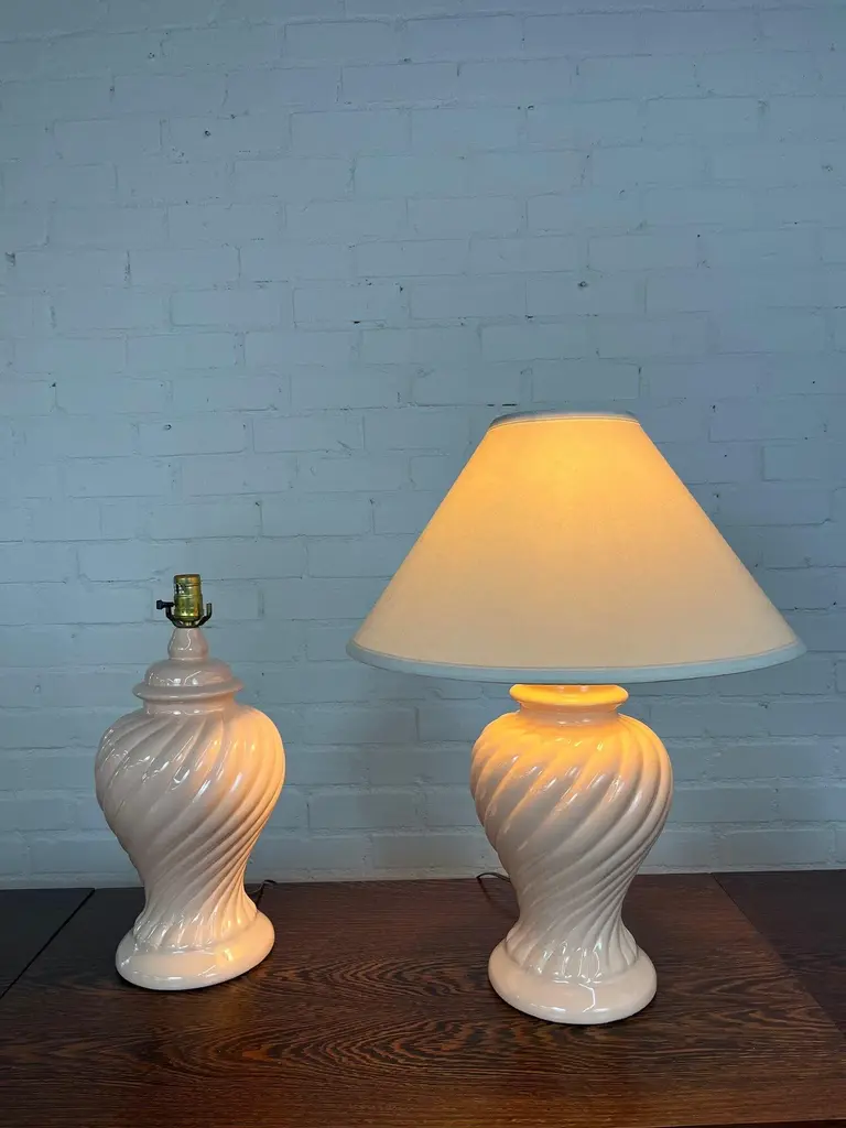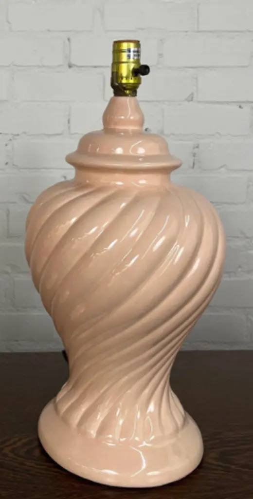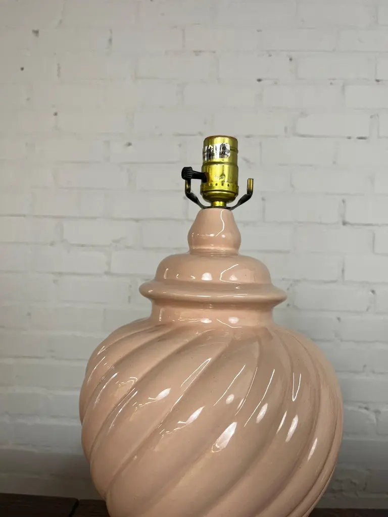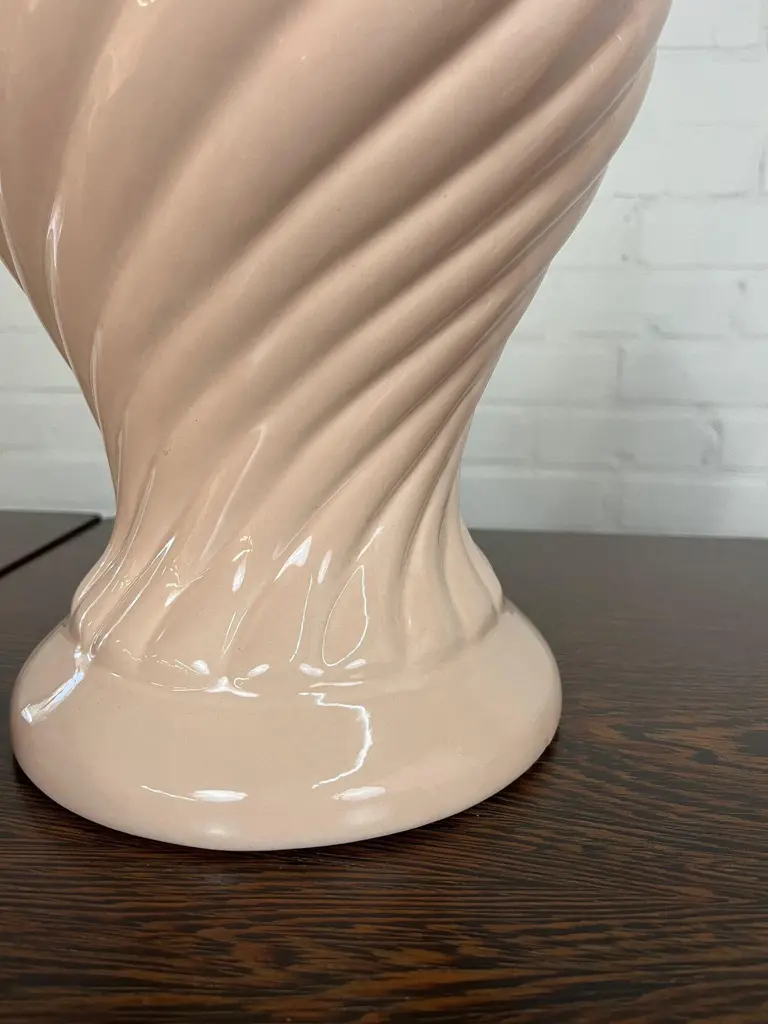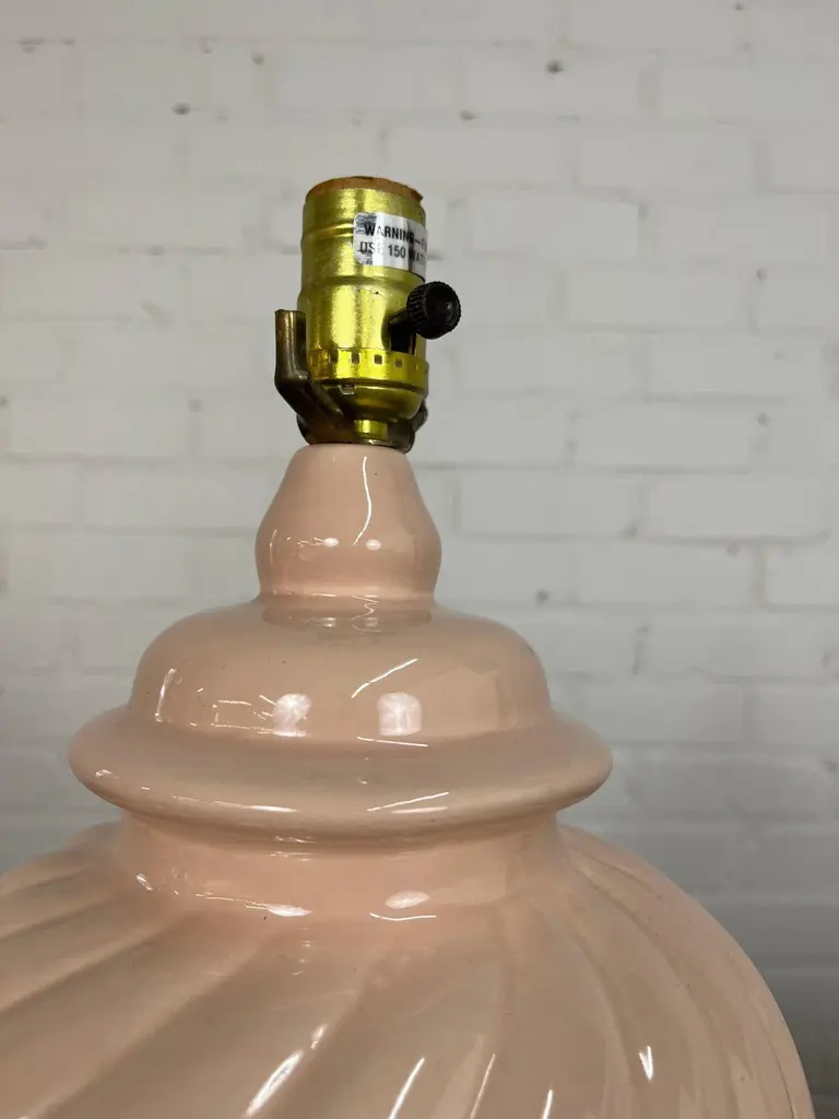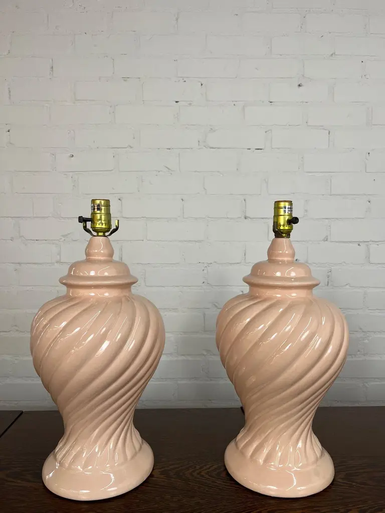 W9 D9 H19 Price is per table lamp, if you like the pair be sure to add both to cart. Vintage table lamps in a blush pink finish with a high shine finish. The lamps are in great condition with minimal signs of wear. Over all in good condition and fully functional.