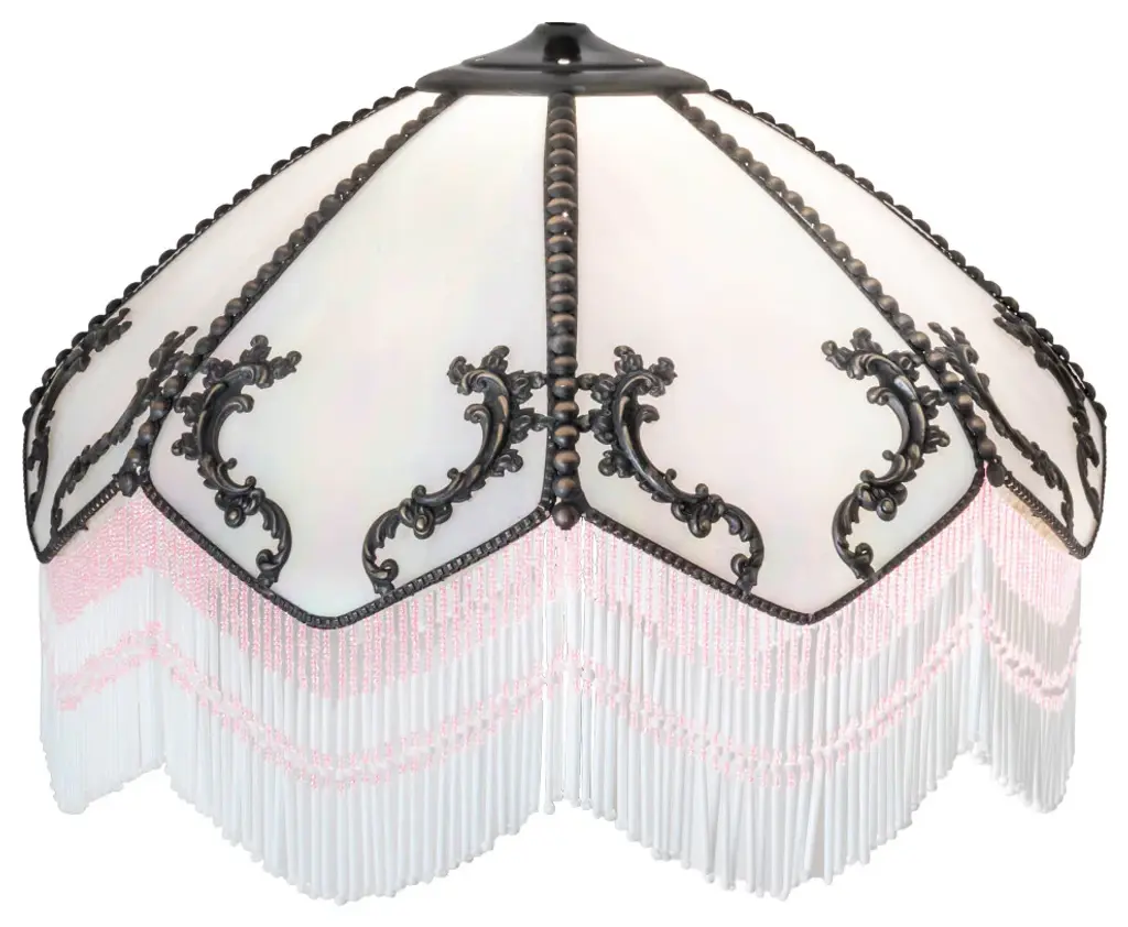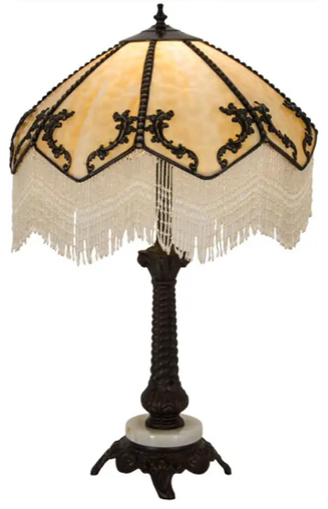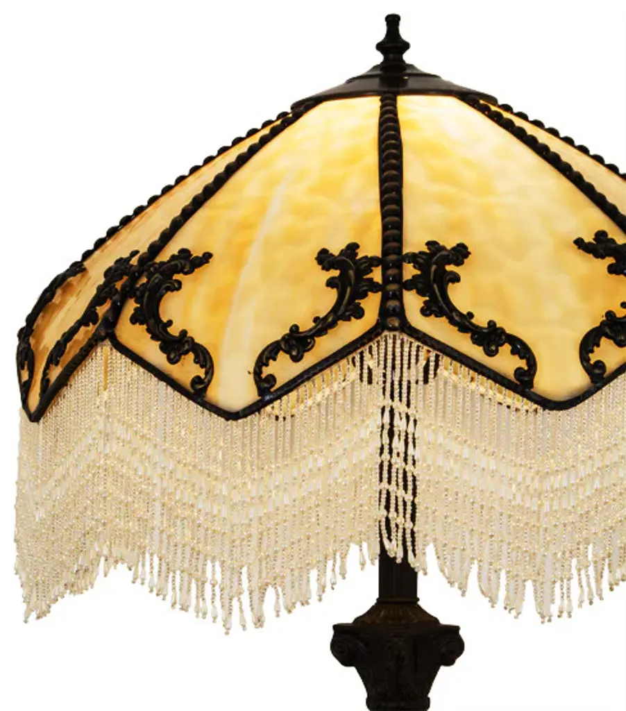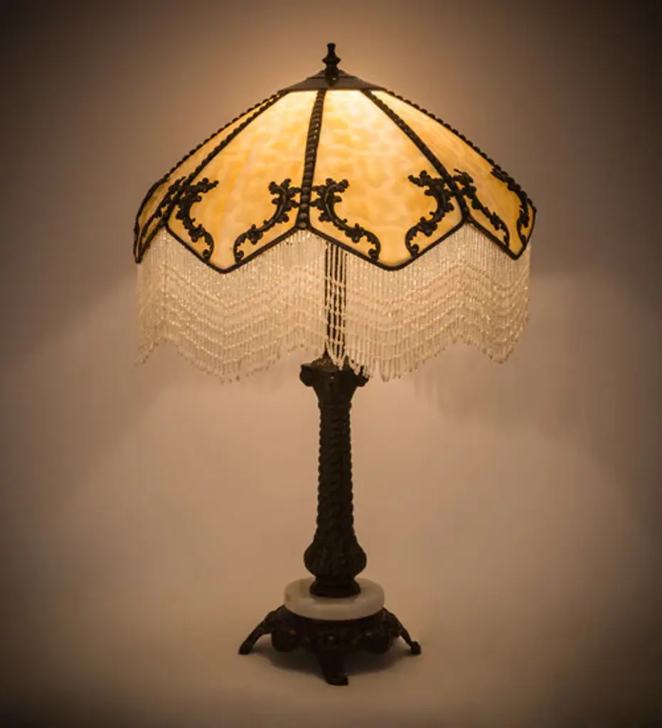 Invite this classic art glass lamp into your home. Handcrafted by Meyda artisans using century old tools; molds and techniques dating back to the days of Master Artist Louis Comfort Tiffany; Regina features hand-curved Beige Art Glass; with color coordinated Hand-strung Glass Beaded Fringe. The decorative base and hardware are hand finished in Mahogany Bronze and complemented with a White Marble accent. Handmade in our manufacturing facility; this Nostalgia Classic lamp is available in custom colors; styles and sizes. Energy efficient options are offered. The lamp; which is nearly 30 inches tall; is UL and cUL listed for dry locations.