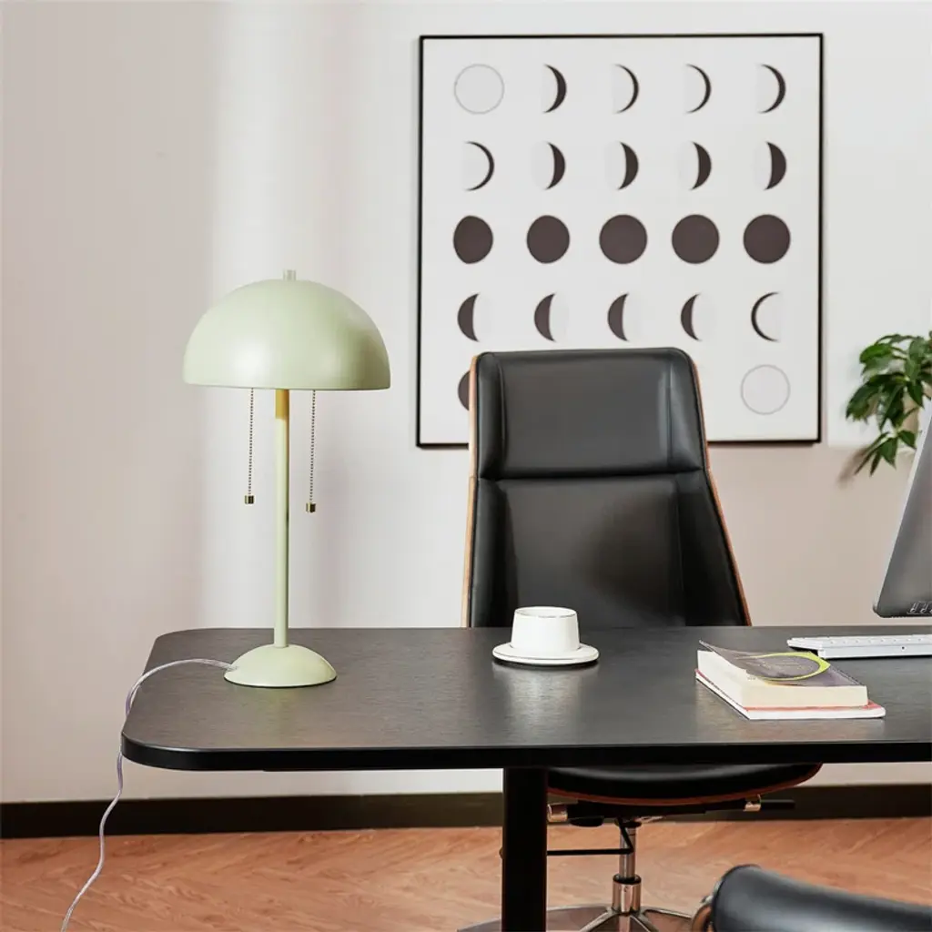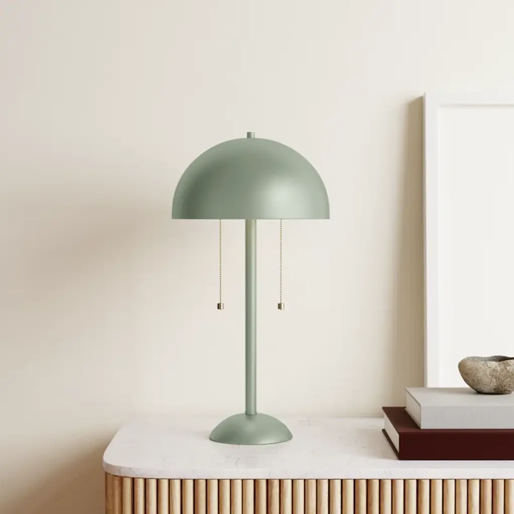 The chic dome shade, two-light feature, and double brass pull chain of this 2-Light Table Lamp are fun, sophisticated, and vintage. This table lamp is the ideal accent piece for any millennial-style living room, bedroom, or office for a flawless retro design trend and brings just the right amount of glamour to your space. The sage green color of the metal shade with brass accents sits in the grand millennial mind frame and pairs perfectly with any existing decor in your home.