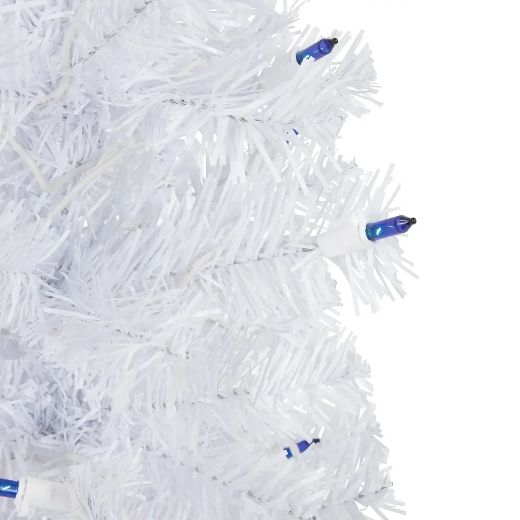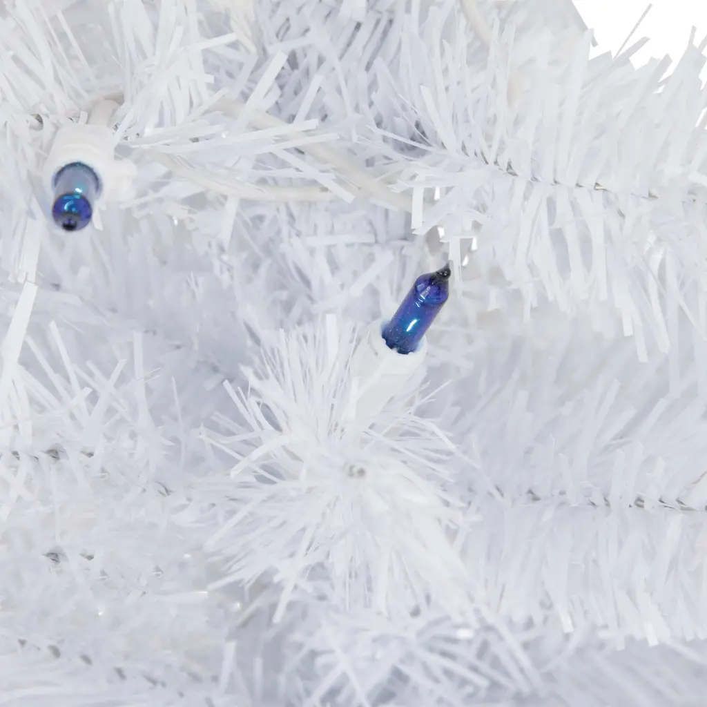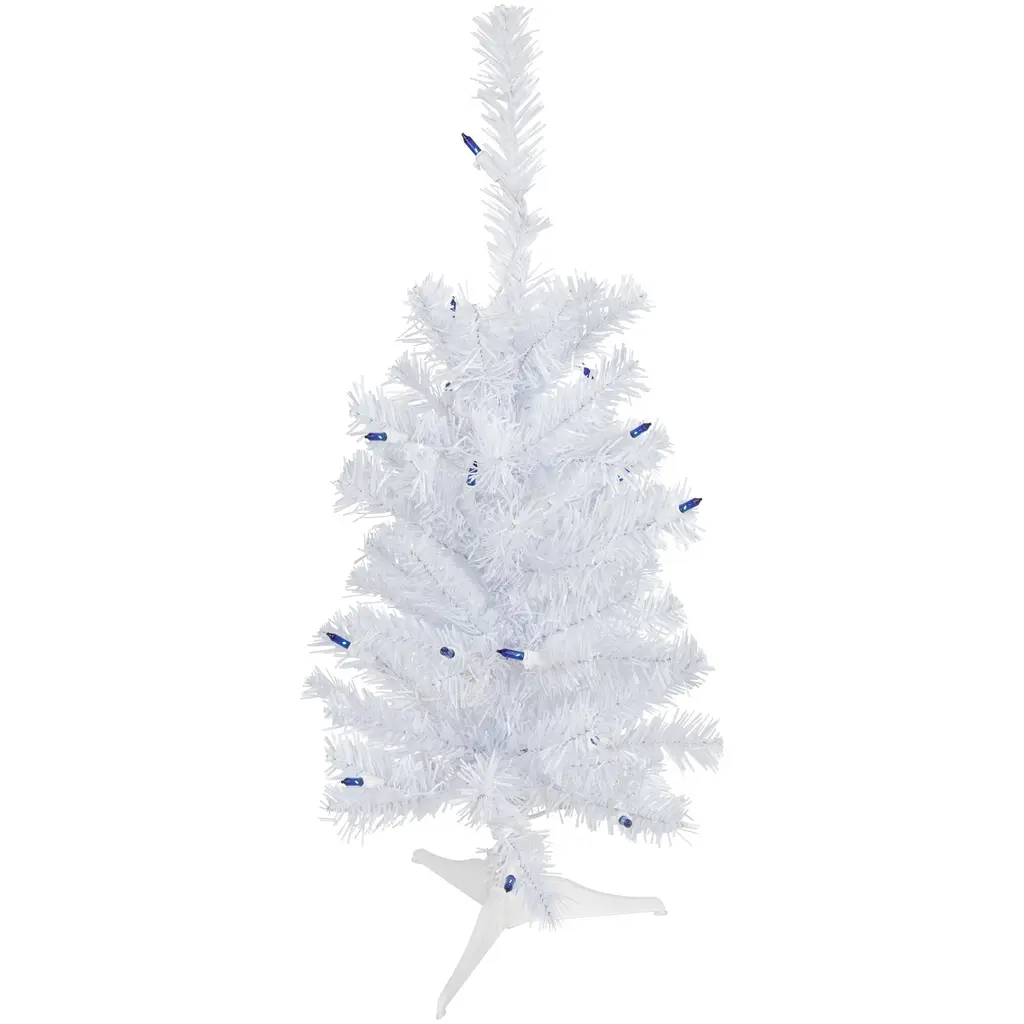 Transform your space into a winter wonderland with the beautiful Woodbury White Pine tree. It is a designer-inspired alternative to a traditional green tree with its dazzling white pine needles sure to reflect the light from the vibrant blue mini lights that it comes adorned with. The lush needles give the tree fullness but the slim profile makes it ideal for small spaces and allows it to fit perfectly in corners or on tabletops. Product features: Pre-lit with 15 blue lights Bulb size: mini Bulb type: incandescent 58 tips 1.5" wide branch tips 28" white lead cord Slim profile tree 2-piece easy assembly (including stand) Additional product features: Light sets on tree are UL listed for indoor or outdoor use however the tree itself is recommended for indoor use only If one bulb burns out the rest will stay lit Lights are equipped with Lamp Lock feature which makes them replaceable interchangeable and keep them from falling out Includes a white plastic tree stand Wire gauge: 22 120 volts 60 hertz .08 amps 9.6 watts Dimensions: 2' high (from the base of the stand to the top of the tree) 14" base diameter (at the widest point) Material(s): PVC/plastic/glass bulbs/wire Note: Branches are compressed for shipment and need to be fluffed out upon arrival to look like the photo.