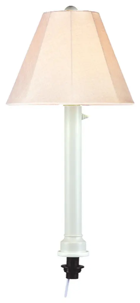 Patio Living Concepts 20-787 Umbrella Table Lamp 20787 with 2" dark mahogany wicker and bronze tube body, antique beige linen Sunbrella shade fabric. Add fashionable styling and light to your outdoor dining table. Features all resin construction and fits 1 7/16" diameter or larger umbrella table hole. Accommodates table thicknesses up to 3". Acrylic waterproof light bulb enclosure allows the use of a standard 60 watt light bulb or comparable LED or CFL bulb. Complete with on/off dimmer switch and 14 ft. weatherproof cord and plug. Dimension: 14Lx14Wx28H in.