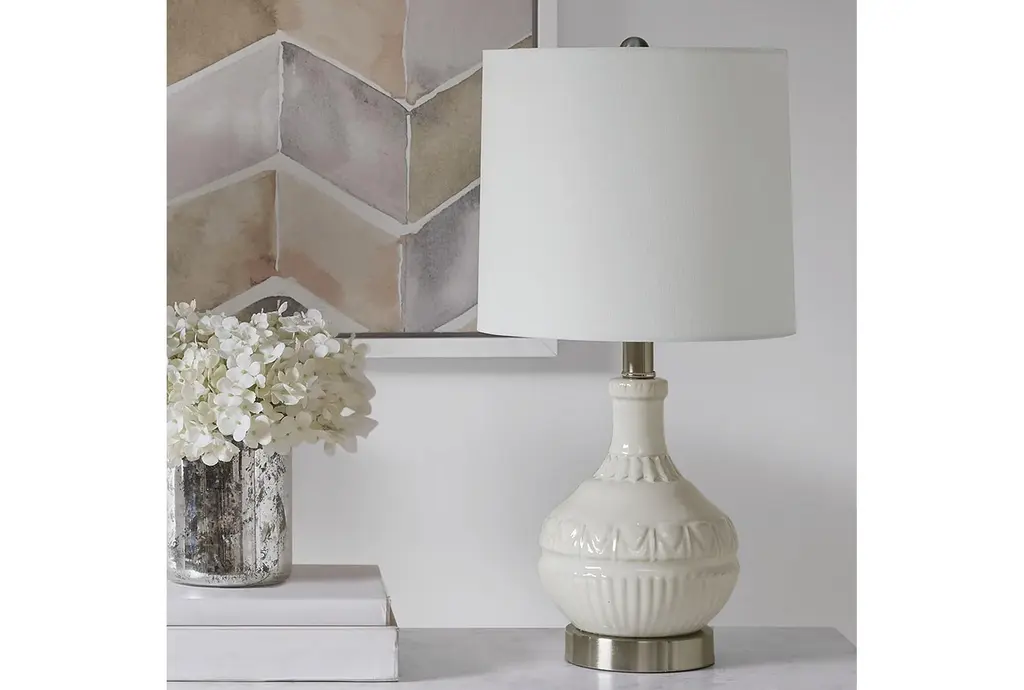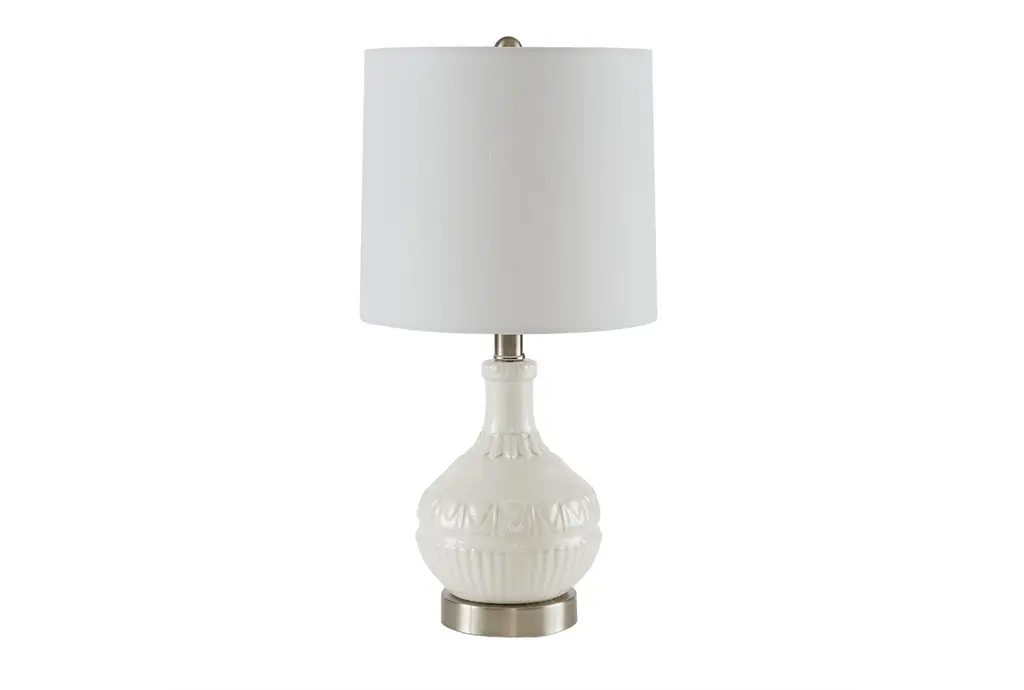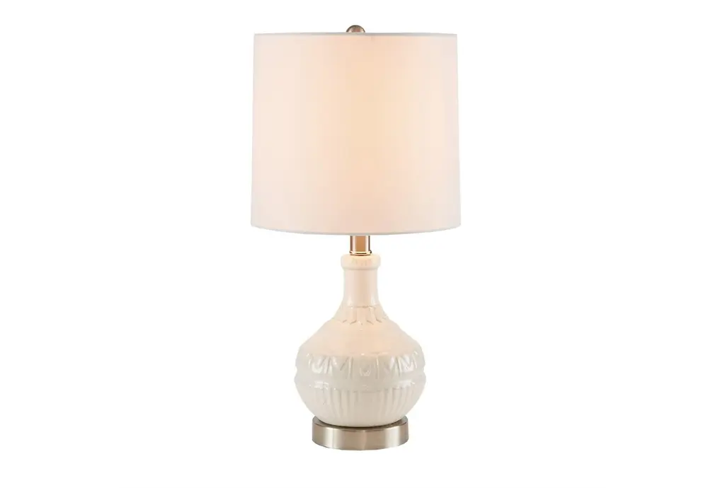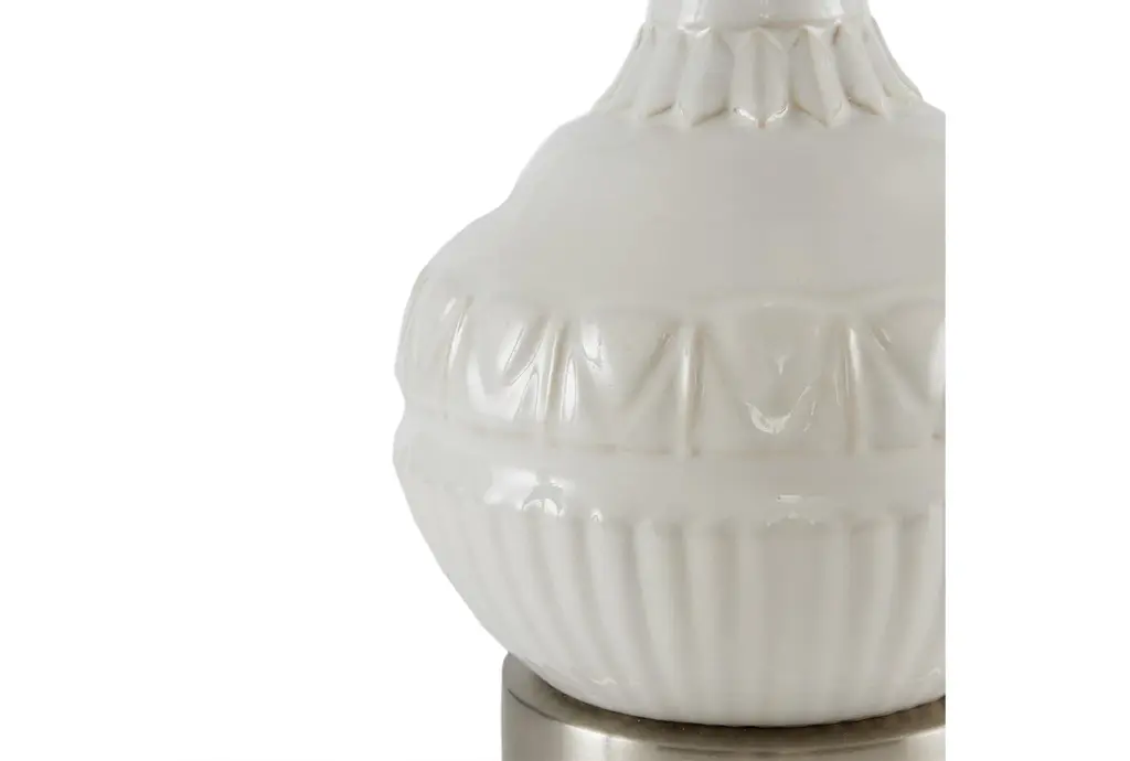 The 21" Gypsy White Ceramic Embossed Table Lamp with Pedestal base beautifully enhances any bedroom. This lamp features embossed detailing and a soft, natural color that complements various decor styles. Its sturdy ceramic and metal construction promises durability, while the fabric shade gently diffuses light.