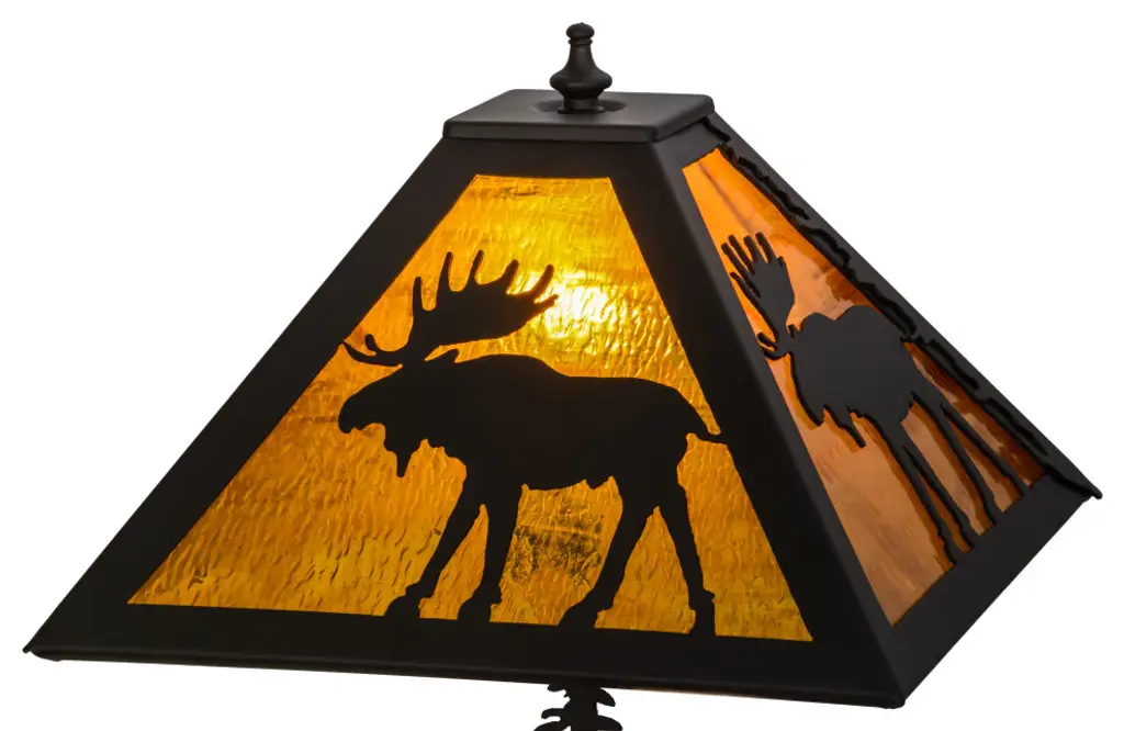 The mighty majestic Moose is depicted in this nature inspired lamp design highlighted with the warm look of Honey Wispy art glass panels and an artistic base featuring Pine trees hand finished in Oil Rubbed Bronze. Ambient light glows from the shade while the base also illuminates with a light source concealed behind the Pine tree figures. A three-way switch allows the user to light-up the shade; base or both. The lamp was handcrafted in the USA by Meyda artisans at the foothills of Upstate New York''s Adirondack Mountains.