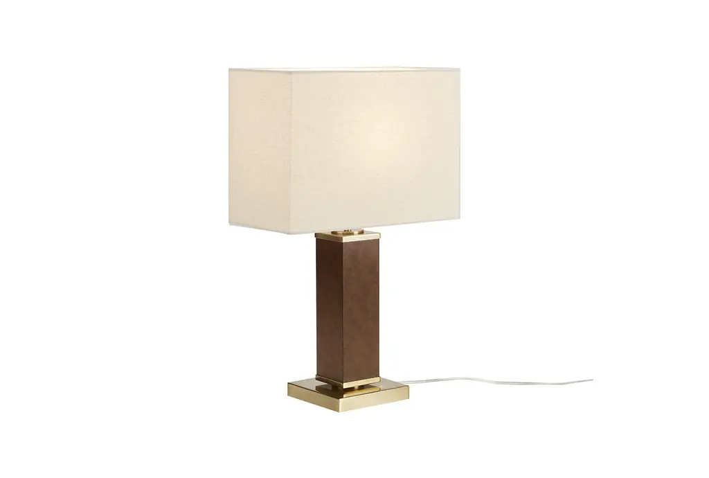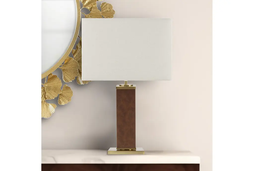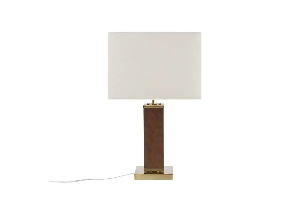 The 22" Hawley Gold & Brown Metal Faux Leather Table Lamp is a stylish and elegant addition to any room. Its sophisticated design features a combination of gold and brown tones, making it a versatile piece that complements various decor styles. The lamp's sturdy construction ensures durability, while the faux leather and fabric elements add a touch of luxury.