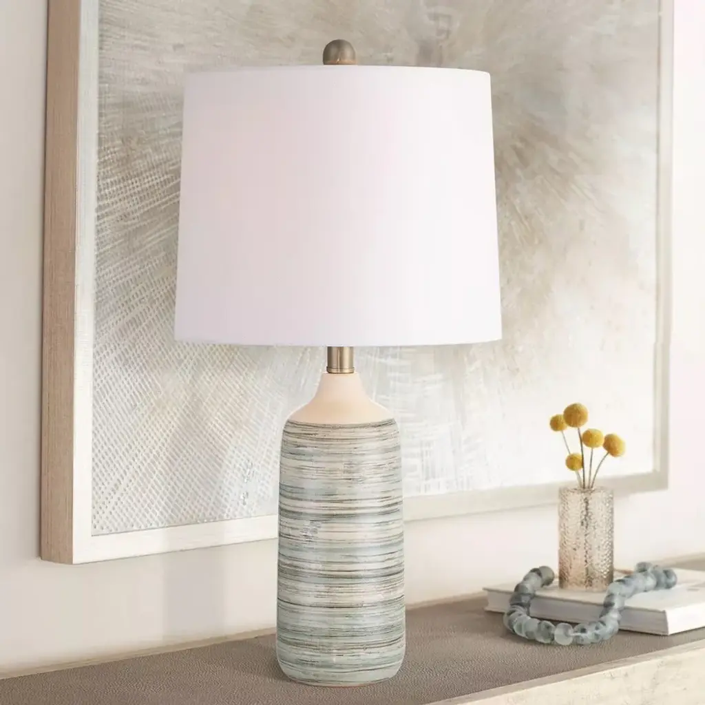 PRODUCT DETAILS: 23 1/2" high overall. Base is 4" wide. Shade is 11" across the top x 12" across the bottom x 9 1/2" high. Weighs 3.4 lbs. Uses one maximum 150 watt standard-medium base 3-way light bulb (not included). 3-way socket switch for easy lighting control. Kayla modern table lamp. Blue and gray lines on a beige background. From the 360 Lighting brand. Striped pattern of horizontal lines on the lamp base. A relaxed look for contemporary and coastal room design. White fabric tapered drum shade. 8-foot long clear-silver cord. Hand-applied ceramic glaze. Pattern and colors may vary slightly.