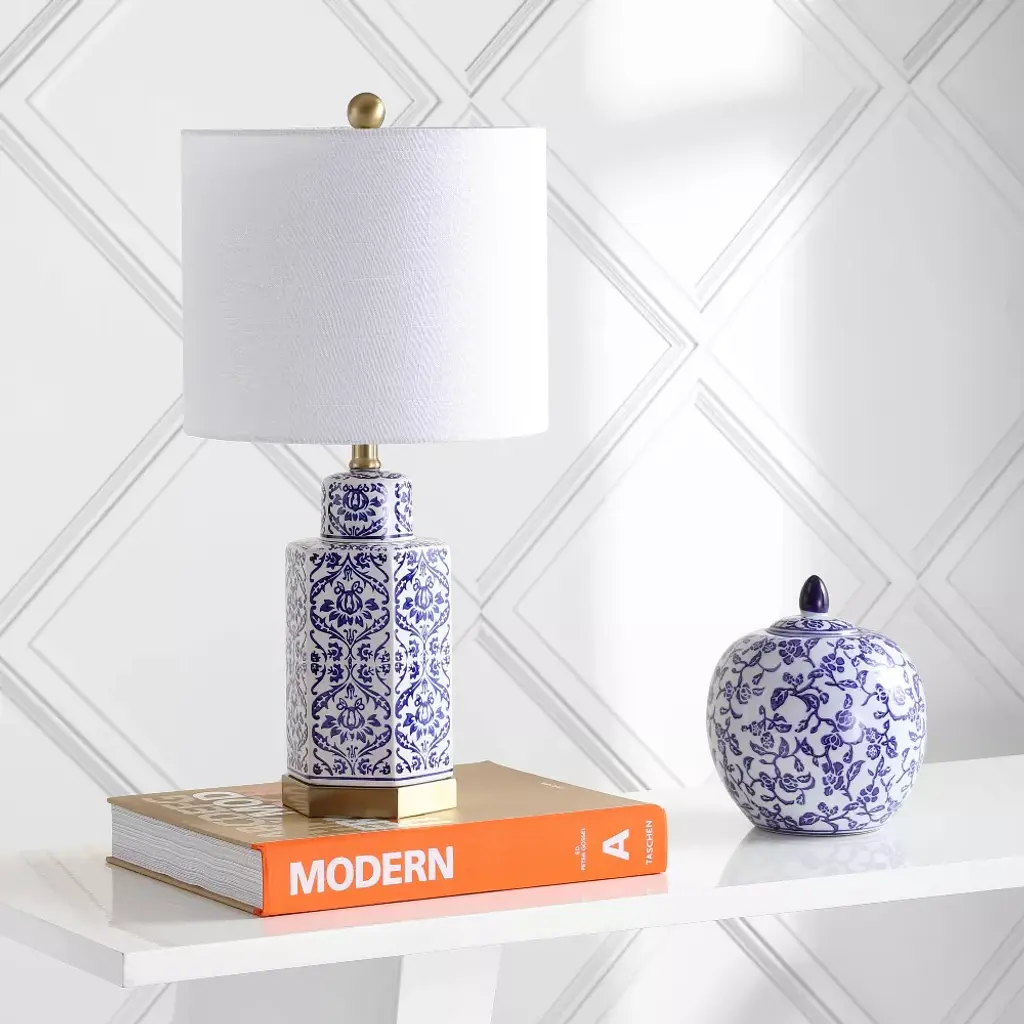 Blue and white, damask prints, and brass accents -- core elements of traditional style come together in this classic table lamp. With a hexagonal ginger jar base and brass pediment, this style takes cues from traditional Chinese porcelains while remaining decidedly modern. Topped with a linen drum shade and silk-wrapped cord, this piece is sure to be an heirloom of tomorrow.