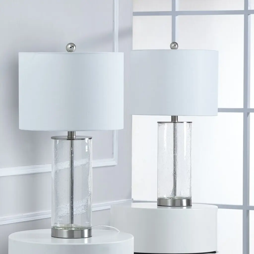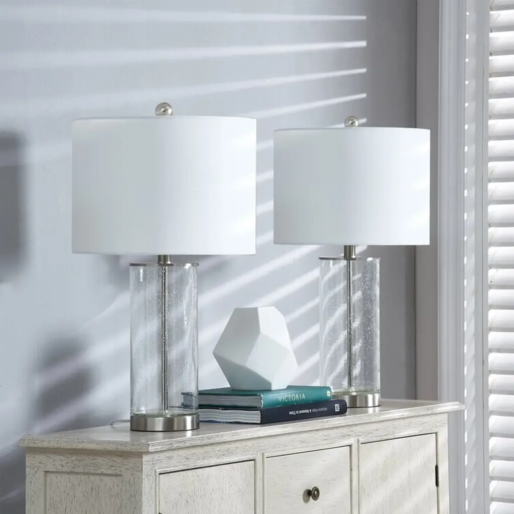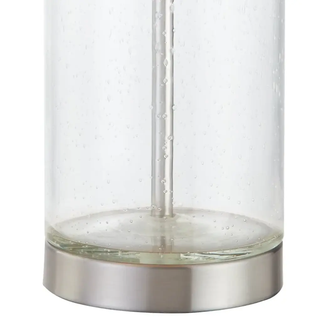 The Maxax Clear Glass Table Lamp Set may seem simple at first glance, but it is truly a unique piece of art. Each lamp is handcrafted with varying intensities and sizes, resulting in a one-of-a-kind design. The set includes two lamps and each features a 3-way rotary socket switch, a UL listing for safety, and a beautiful glass and metal construction.Features: