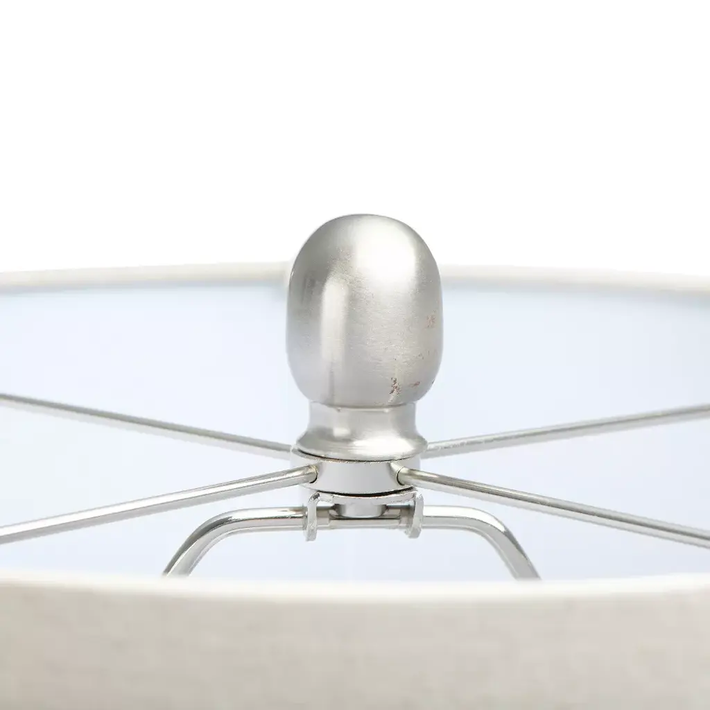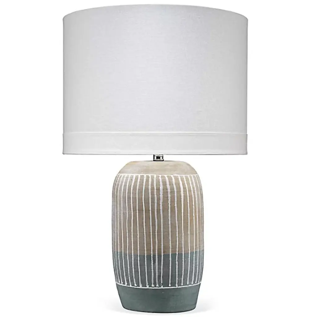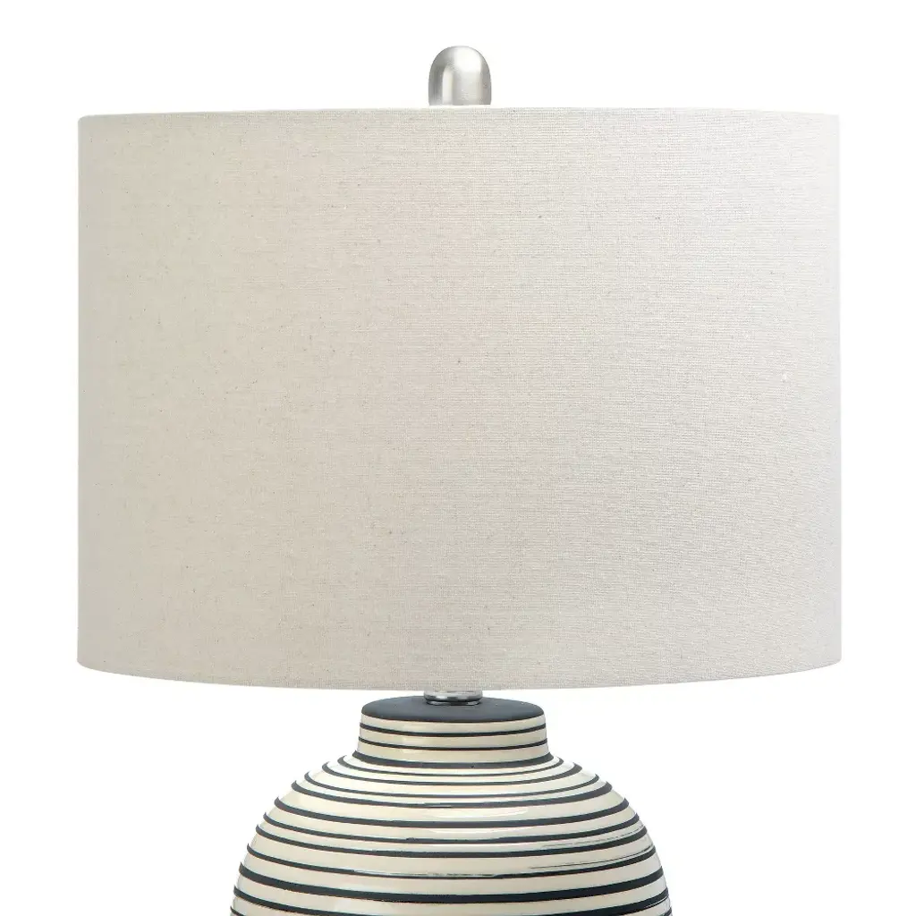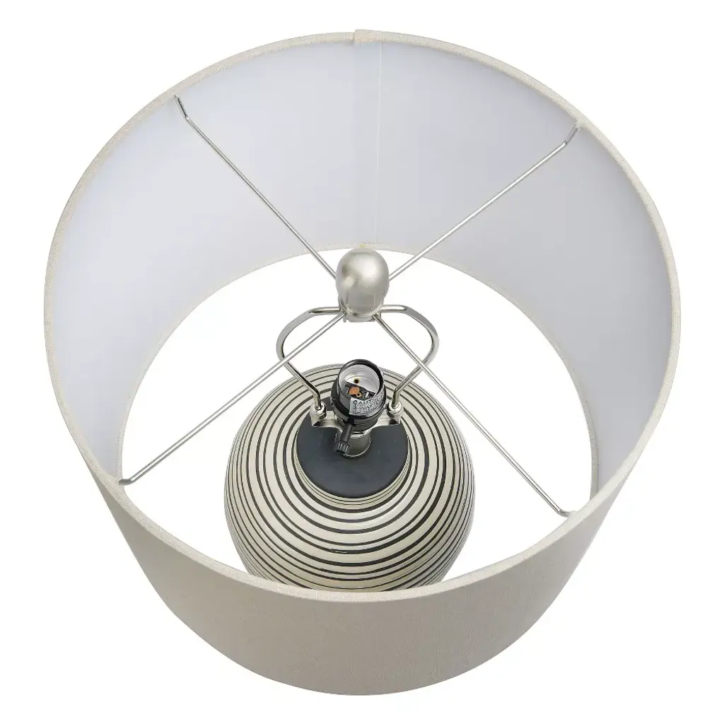 A dark gray and cream striped finish on a rounded base combines classic colors with a modern twist. The textured finish adds a layer of sophistication. Paired with a light cream colored drum shade. Overall height is 23". Curate a calming environment with the ambient diffused light of an expertly crafted table lamp; This stunning mix of materials and textures brings warmth and serenity to a space of any style from glam to modern
