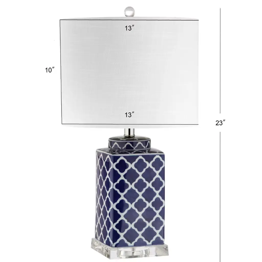 Nothing combines classic and bold like the trellis pattern, which makes it a perfect fit for the equally-versatile square ginger jar shape. A crisp linen drum shade with rolled edges tops the look. Finished with a lucite finial and silk-wrapped cord. Eastern influence abounds in this hand-painted blue and white ceramic base. 100% cotton hardback drum shade. 60" silk cord with standard USA 2-prong plug. On-off switch on socket. Takes one maximum 100 watt or equivalent bulb. Eco-friendly 9W LED bulb included. UL Listed. Before cleaning any lamp shade or fixture, disconnect the power source. Wipe with a soft, dry cloth. Avoid the use of chemicals and household cleaners as they may damage the finish.
