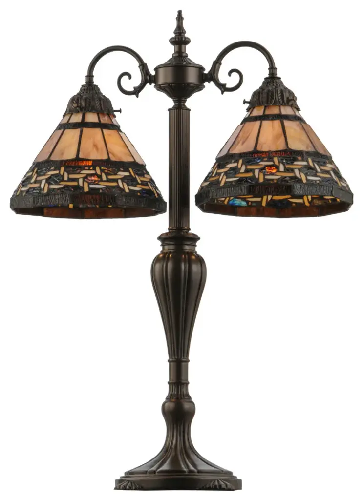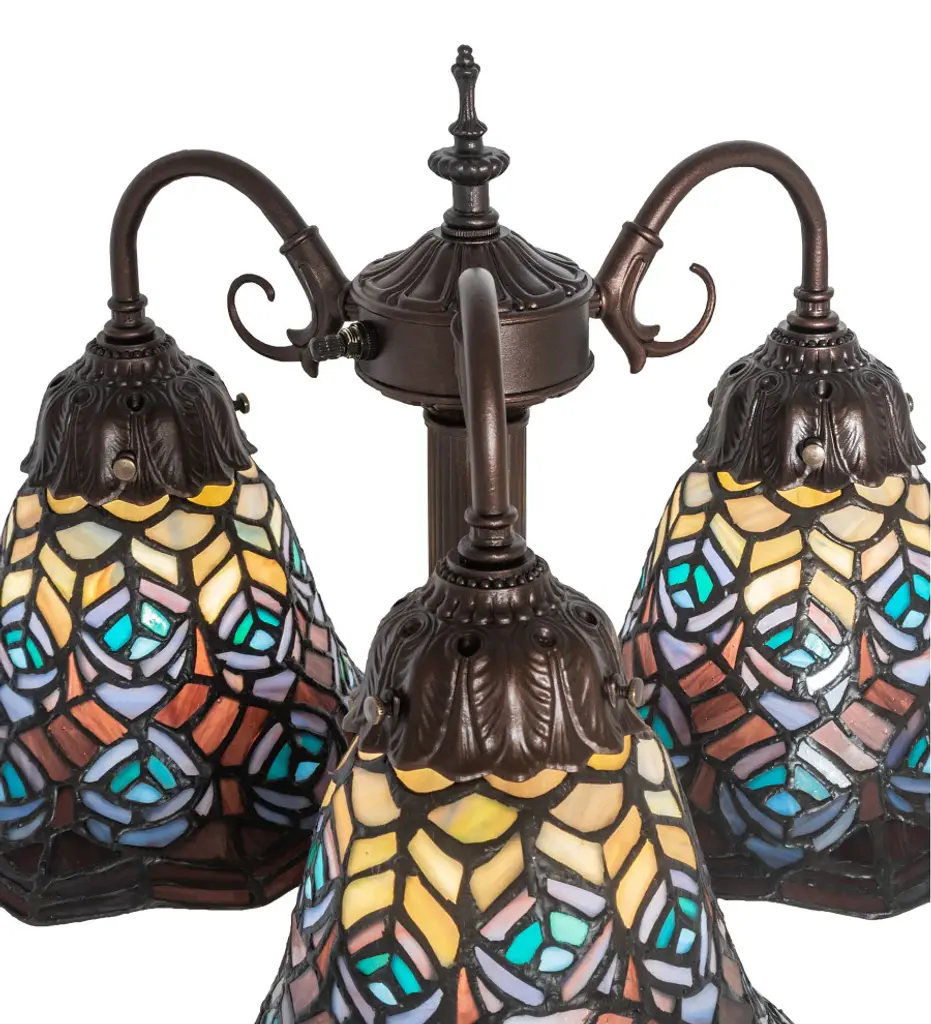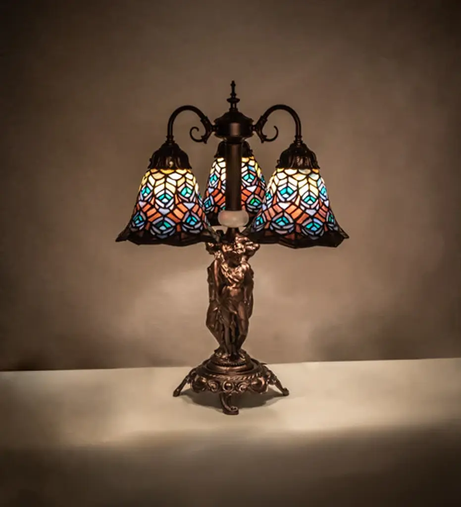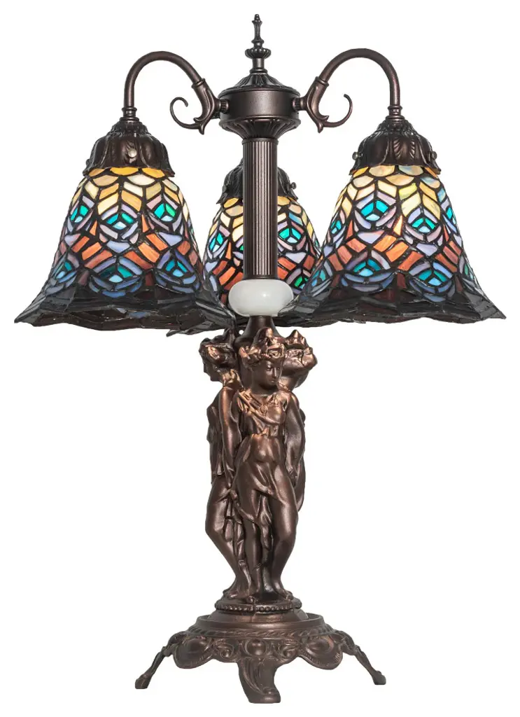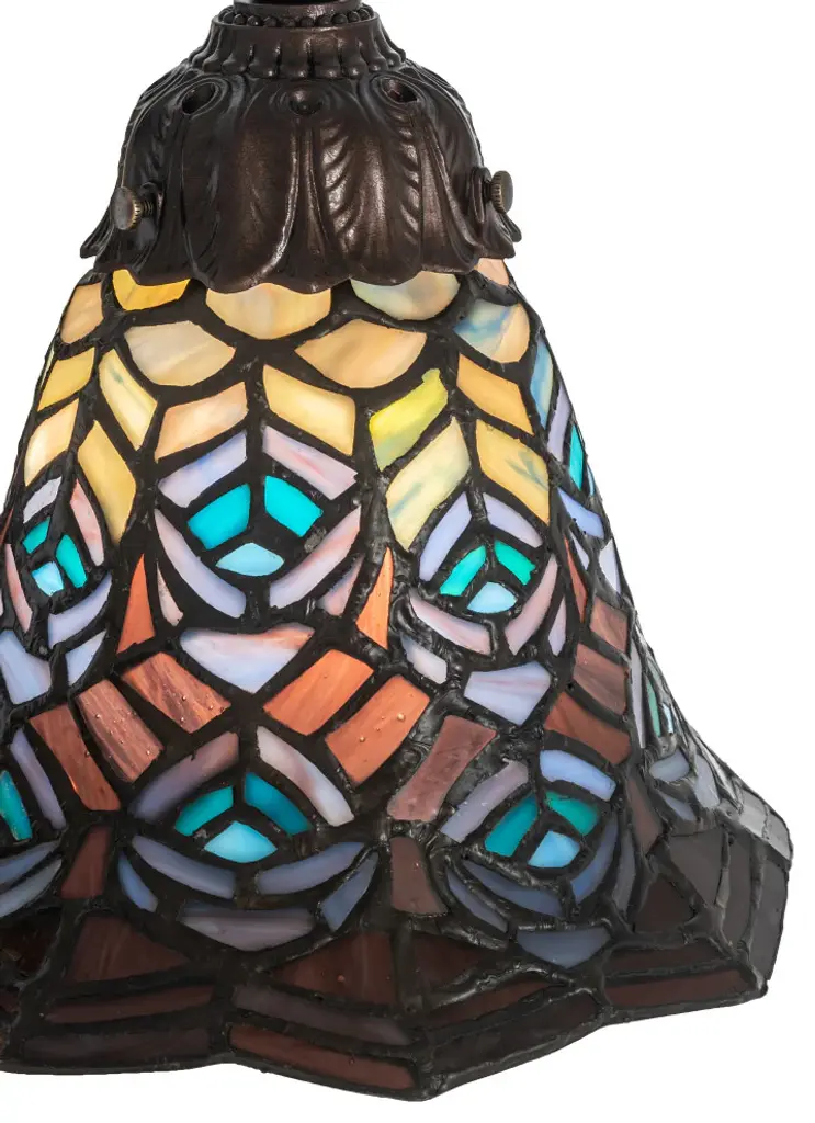 This exquisite Peacock Feather art glass design is one of Louis Comfort Tiffany''s favorite patterns. Splendid colors of Mauve; Beige; Pink; Orange; and Gray art glass adorn the bottom of the shade while feathers feature Turquoise Blue and Purple. Above is a scalloped crest of art glass featuring Purple; Blue; Orange and Green edging a ring of spectacular plumage of this elegantly undulating shade. This prized design is beautifully reproduced using the famous Meyda Tiffany copperfoil construction process. and enhanced with a Three Graces sculpted table base finished in Mahogany Bronze. The Tiffany Peacock Feather Table Lamp is featured in our handcrafted Tiffany Reproduction Lighting Collection. UL & cUL listed for dry locations.