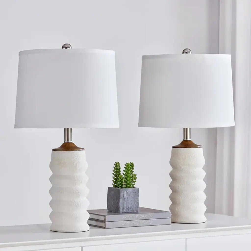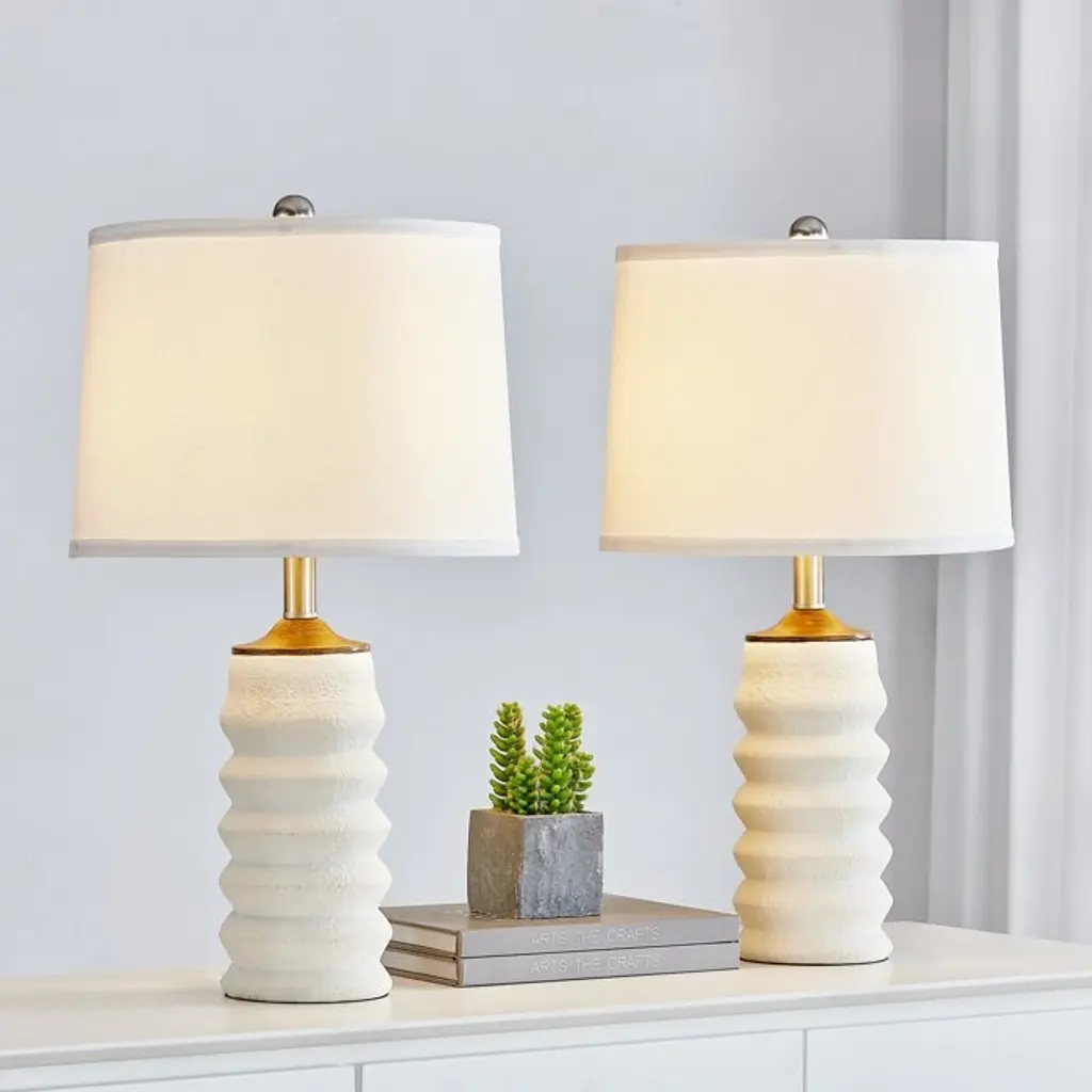 Arriving as a 2-piece set, this table lamp features a dynamic silhouette and plenty of sleek modern style. Crafted from resin, it features a distinctive layered design that reminds us of accordion bellows. Gold-finished accents bring a hint of contrast to the look, while a white linen empire shade filters the glow from a 100W max bulb, sold separately and controlled with the help of a 3-way switch. At 23" tall and 5" at the base, this duo is just the right fit for nightstands and entryway consoles. Bonus: USB ports are included to keep electronics charged and at the ready. Features: