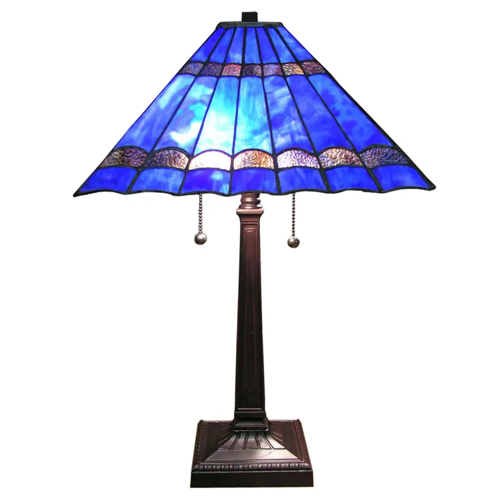 Slender Beige stained glass petals sprout from a chestnut crown with matching background accented with Amber Acorn glass jewels outlined in Willow White and bordered in Bark Brown. This gracious shade is created using Meyda Tiffany''s famous copper foil construction process and complemented with an elegant Mahogany Bronze lamp base. UL Approved: YesHardwire or Plug: PlugBulb Quantity: 2Bulb Type: MEDBulb Wattage: 60Bulbs Included: No