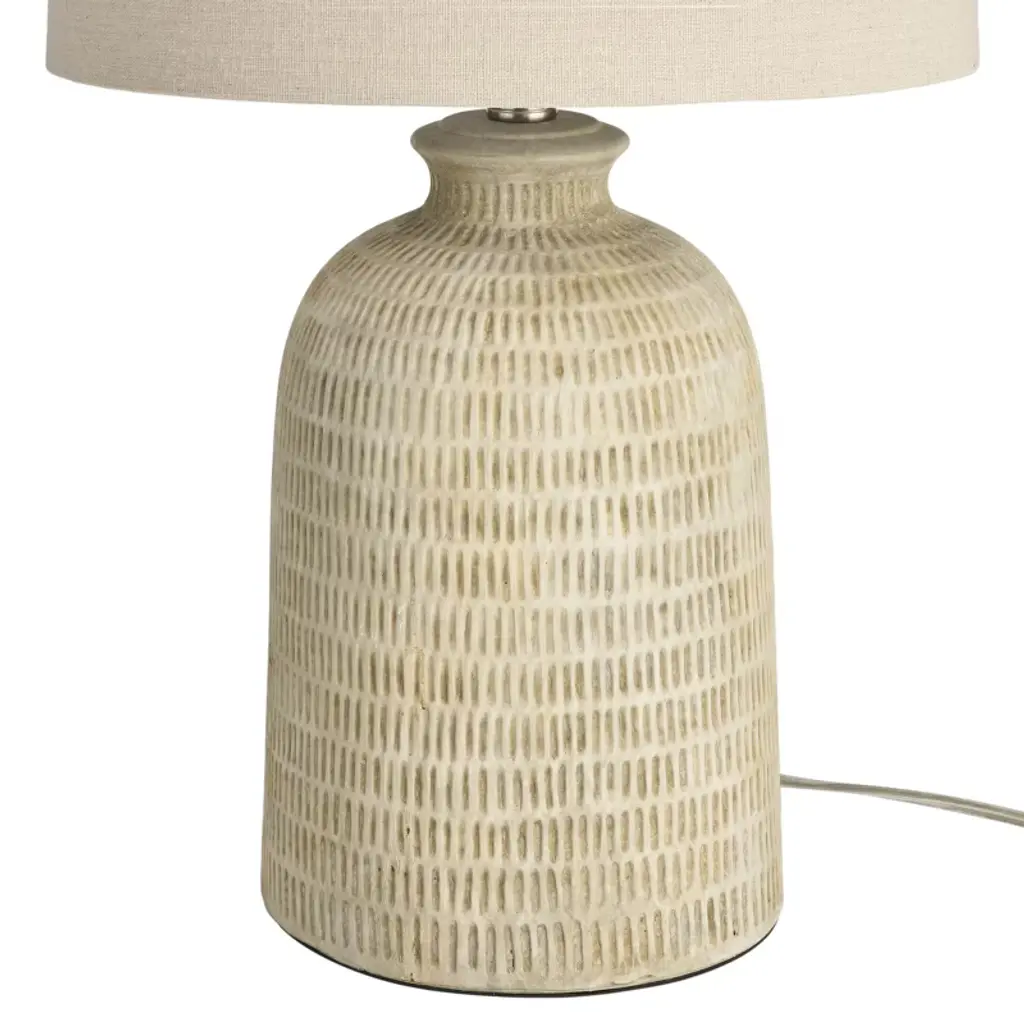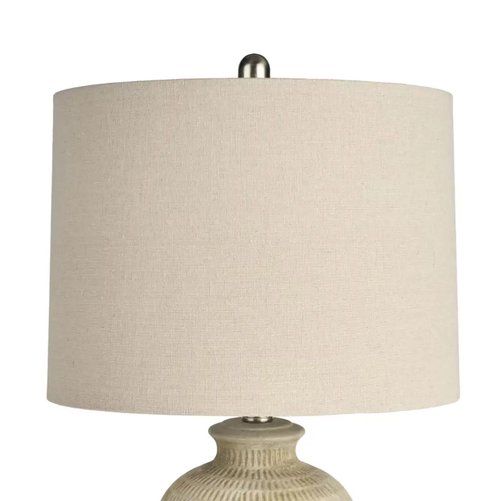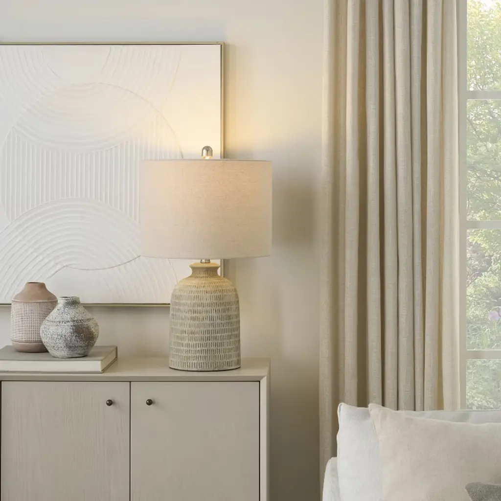 Add rustic charm to your home with this farmhouse table lamp. The textured ceramic base in a neutral finish brings warmth and character, while the classic drum shade offers soft, inviting light. Perfect as both a functional light source and a stylish statement piece, it complements living rooms, bedrooms, or entryways with timeless appeal.