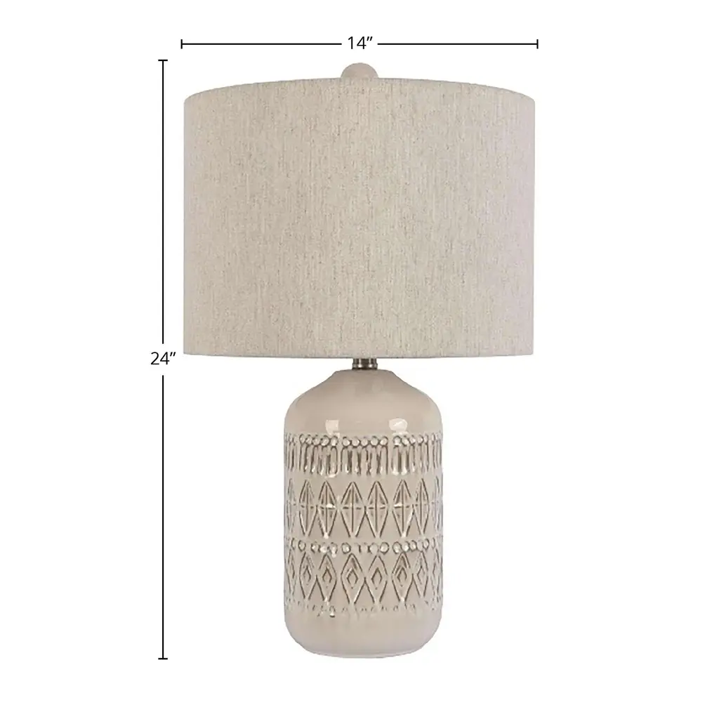Elevate your home's ambiance with this Set of Two 24" High Ceramic Table Lamps. Each lamp features a ceramic base adorned with an eye-catching diamond pattern, adding texture and visual interest to their neutral-toned exteriors. The natural fabric shades complement the ceramic bases beautifully, diffusing light to create a warm and inviting glow. These lamps seamlessly blend contemporary design with timeless elegance, making them suitable for a variety of interior styles.FeaturesDimensions:Table LampRequirementsAt COFAB, we combine sophistication and affordability through our diverse range of lighting and accessories. Our global collection features modern designs and high-quality craftsmanship, perfect for any space in your home or office. COFAB lets you effortlessly create inviting atmospheres or standout focal points without breaking the bank. Explore our carefully curated selection to find the perfect pieces for you. We look forward to partnering with you to transform ordinary spaces into extraordinary ones.