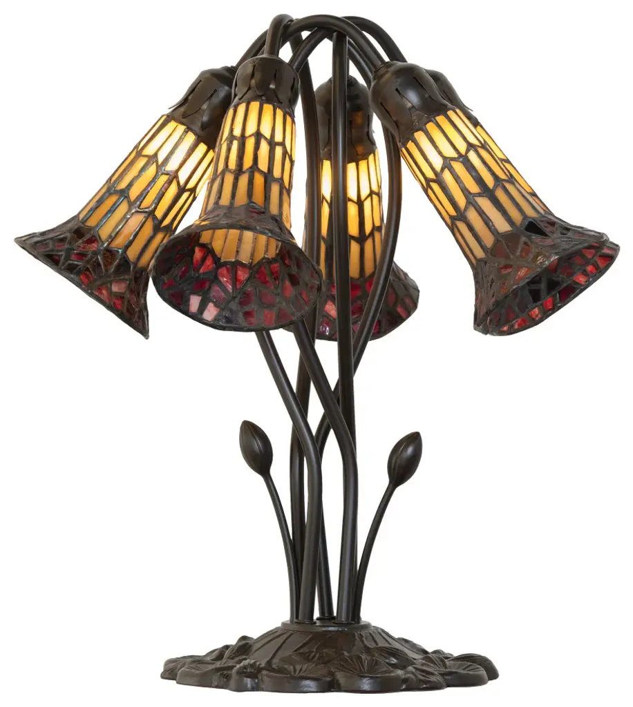 Recreating the famous Tiffany design from the early 1900s. This resplendent table lamp features 12 stunning shades created of Dark Amber Favrile-style art glass. An elegant metal base with floral accents is finished by hand in Mahogany Bronze. This lamp is ideal for illuminating picture windows; dining areas; and living spaces in fine homes and hotels from Cheektowaga; New York; to Warwick; Rhode Island. The Dark Amber Tiffany Pond Lily 12 Light Table Lamp is included in our American-designed; handcrafted Favrile Glass Lighting Collection. UL and cUL listed for dry locations. Each shade is a unique work of art with color variations based on natural ingredients inherent in the glass.