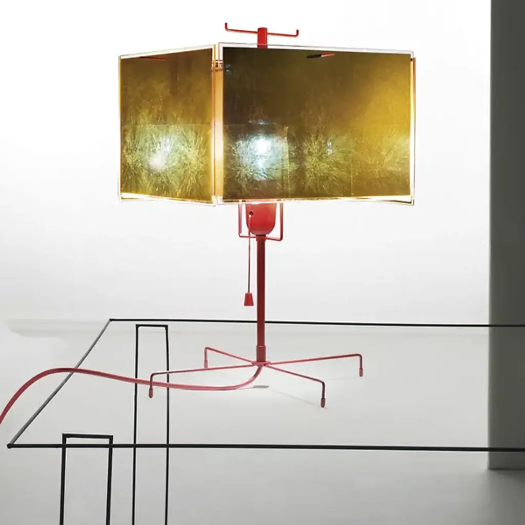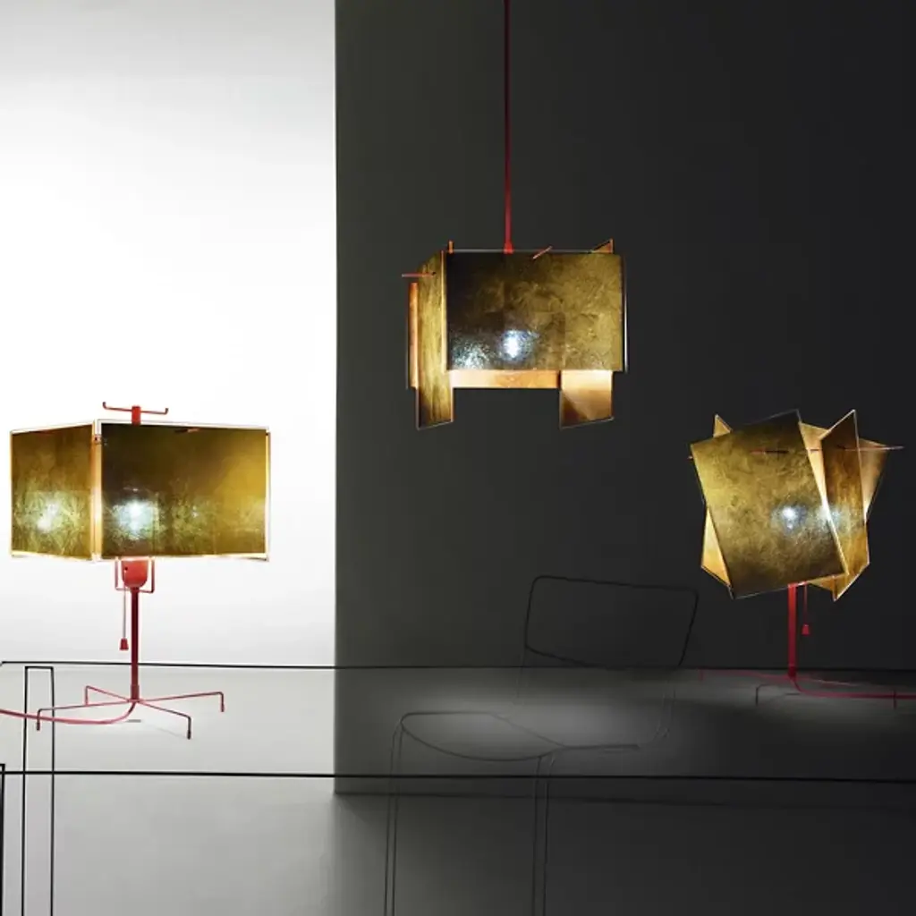 The Ingo Maurer 24 Karat Blau T Table Lamp features gold leafing beaten to a thickness of 1/10.000 mm (corresponding to 1.000 atomic layers), allowing short-wave blue light to pass through. Yellow-gold light is reflected, giving the inner surface of the lamp a gold appearance when lit while the outer surface is blue. A mode of self expression, the shades on this lamp can be arranged in various shapes and angles for a look unique to its owner.