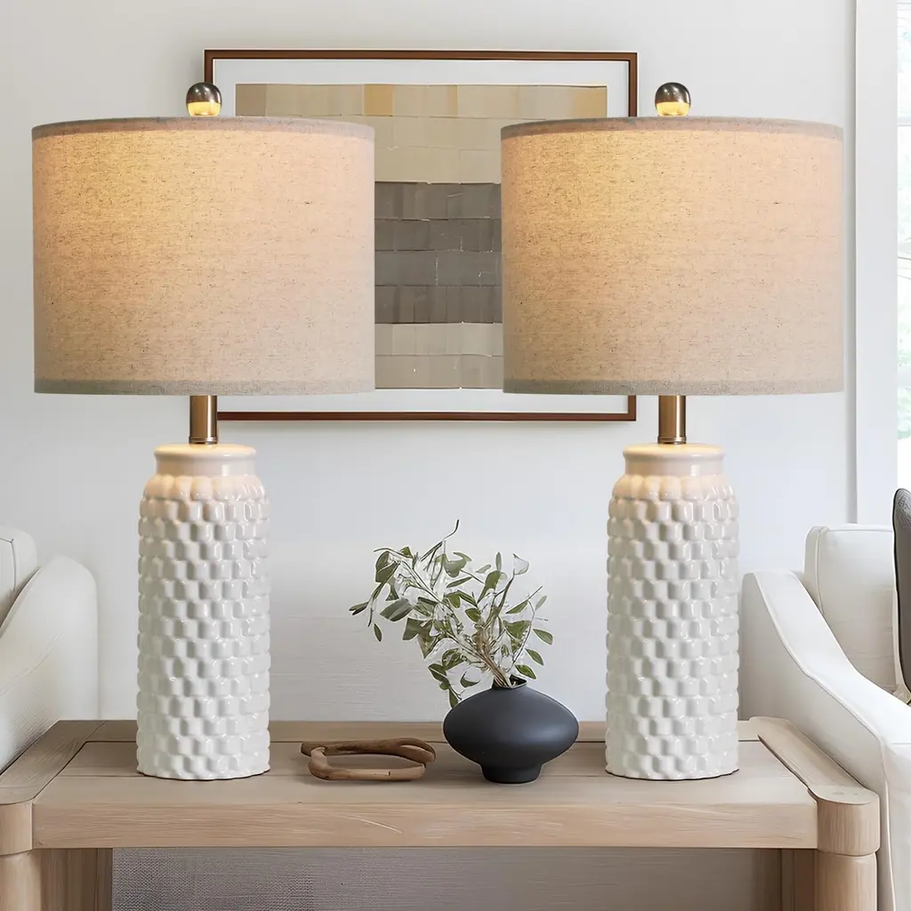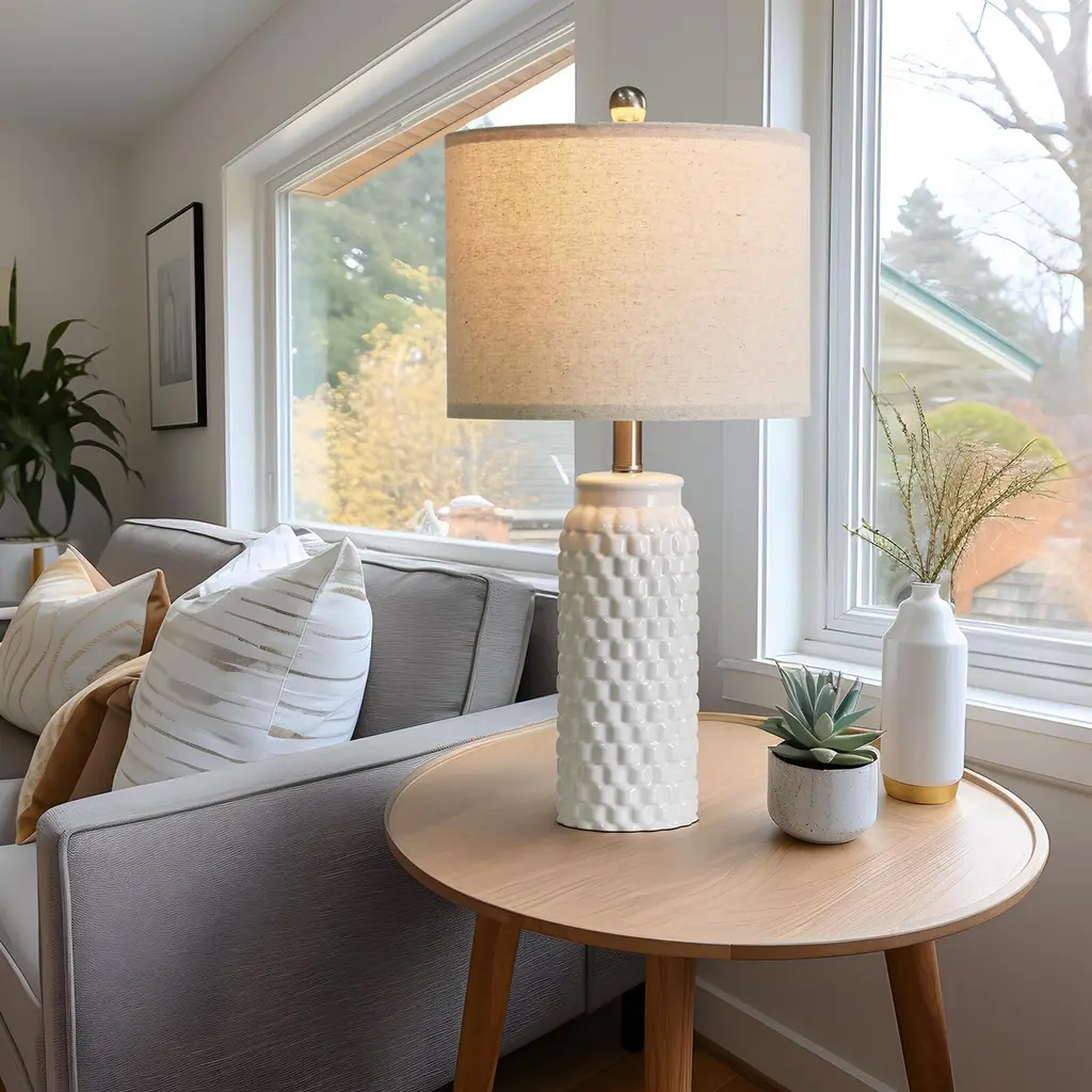 Modern Design&Perfect Gift: A contemporary table lamp with ceramic design. The perfect fusion of classic and modern, can add artistic atmosphere to your living room. Our nightstand lamp is the perfect gift for your families and friends.Comfortable Glow: The shade of our bedside lamp is made of linen, which can effectively soften the brightness and protect the eyes. When you are get along with your family, this bedroom lamp creates a warm atmosphere for you, it is very suitable for living room and bedroom.Great Value&Perfect Size: If you are looking for better products at less cost, this ceramic lamp is a perfect target. The base of this nightstand Lamp is 4.75 inches wide, the shade is 12 inches wide, and the overall height is 24 inches. What a great addition for your living room, bedroom, guest room, or office.Easy to Assemble: Our night lamp needs to be assembled but it’s very easy, we will attach an instruction manual for you.(Bulb not included)