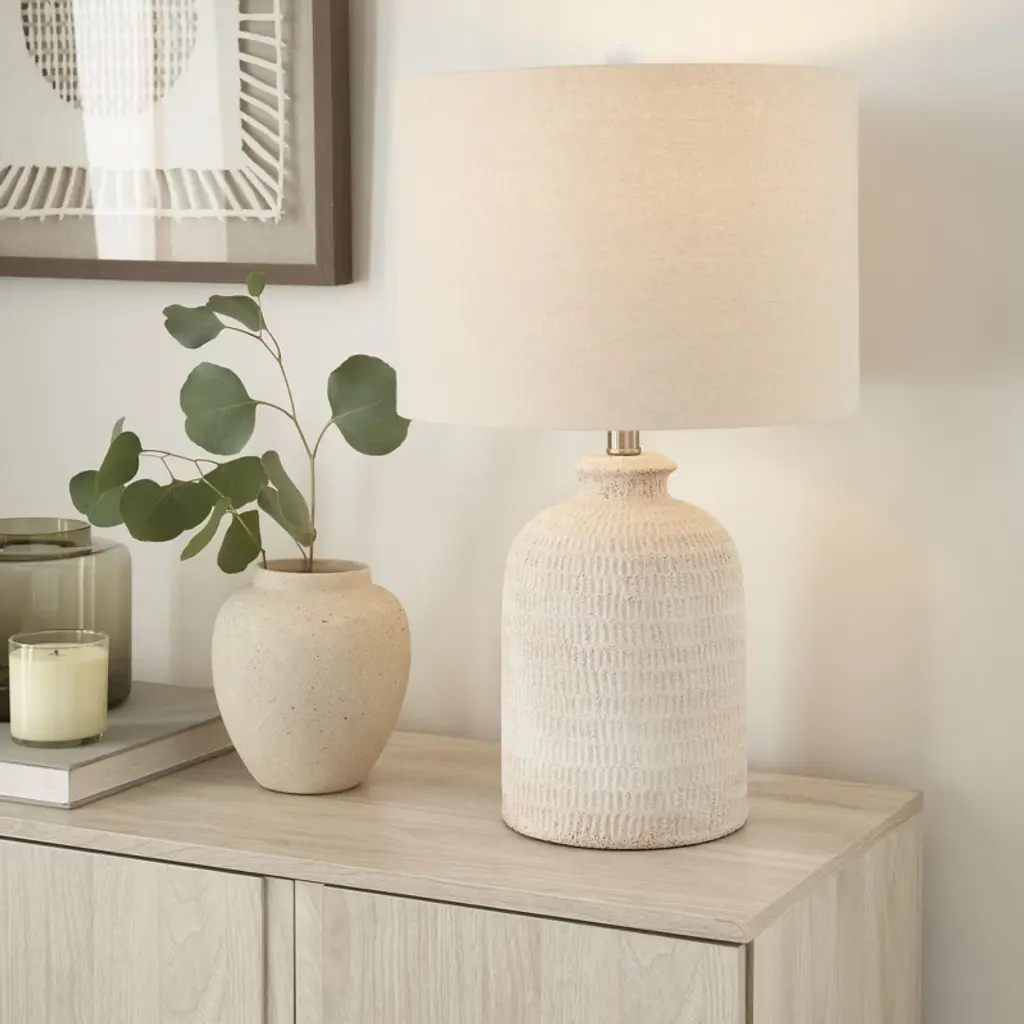 Bring raw beauty to your surroundings with this farmhouse table lamp. Featuring a textured white washed terracotta base, the prefect neutral statement piece that will warm up any room.