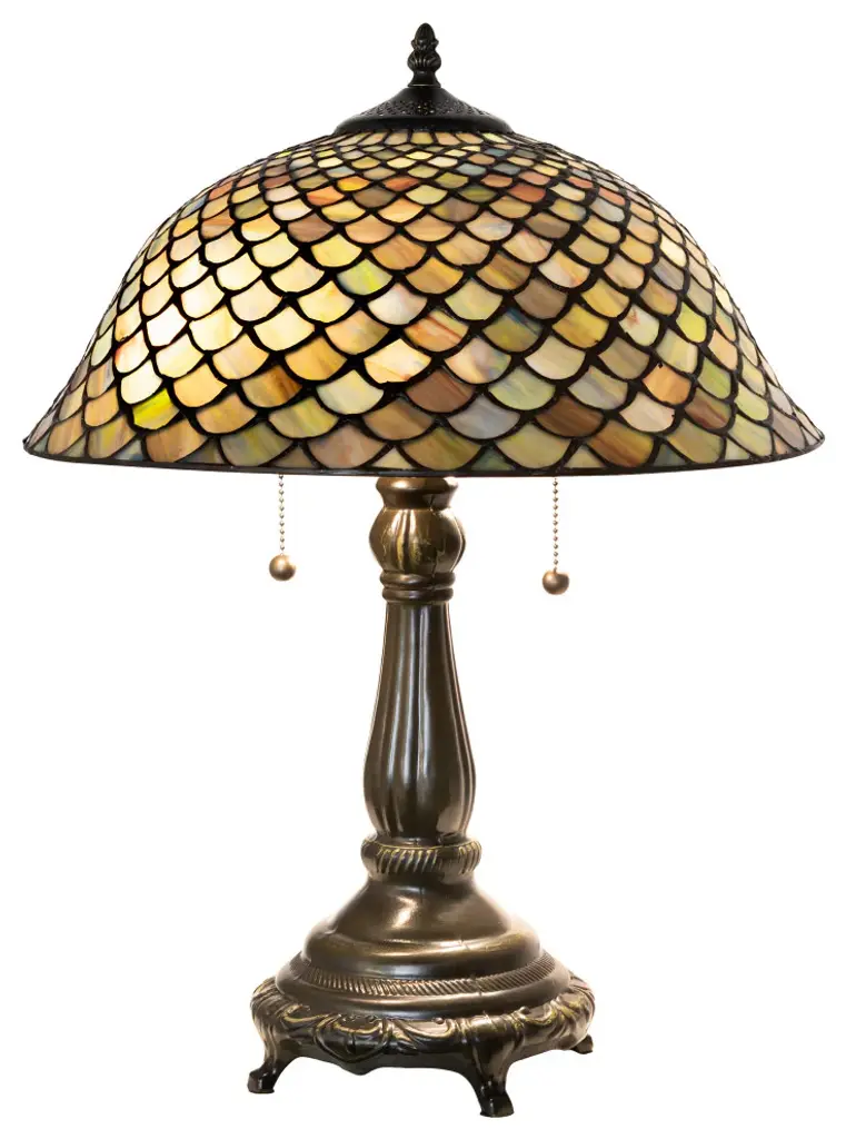 Diamond patterns of Iridized Ivory and Ivy Green are accented all over with sparkling clear jewels droplets in this elegant Victorian style shade. The versatile stained glass shade is created using copper foil construction, a process developed by Louis Comfort Tiffany. The table lamp base is hand finished in a warm Mahogany Bronze. UL Approved: YesBulb Type: MEDBulb Quantity: 2Bulb Wattage: 60Bulbs Included: No