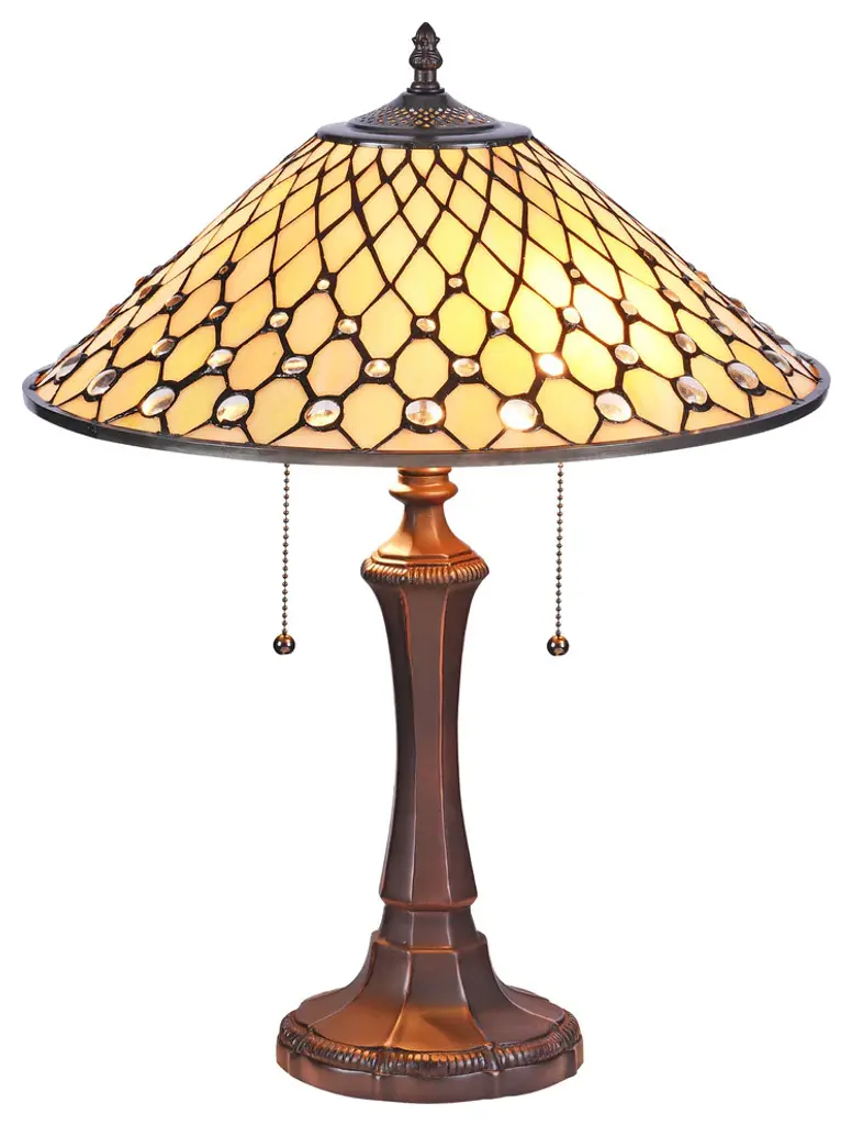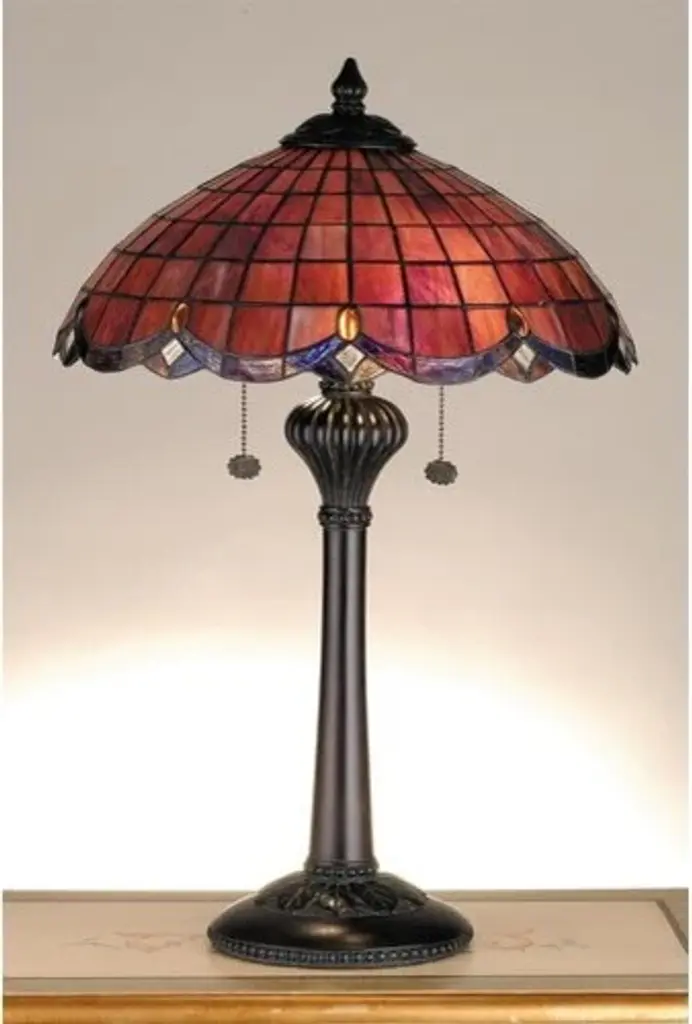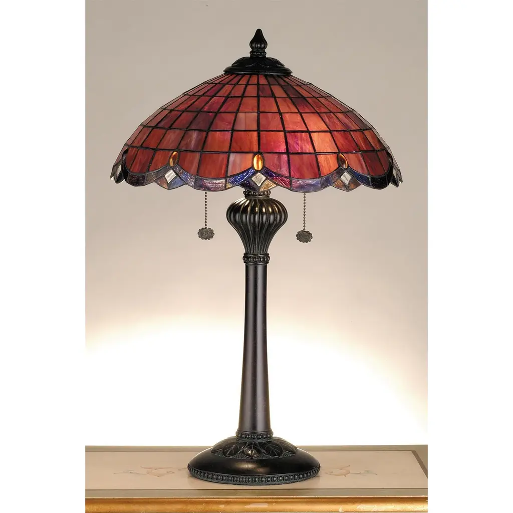 Elan features a Concord Grape art glass shade trimmed in swooping scallops of multiple shades of Purple Rippled glass, which are accented by sparkling Amber jewels and Clear granite glass. The shade is created using the famous Meyda Tiffany copper foil construction process of hand-cutting and hand-soldering individual pieces of authentic stained glass. This lamp includes a handsome floor base which is offered in an Antiquity finish. Custom sizes, styles and dimmable energy efficient lamping are available. UL and cUL listed for dry locations. UL Approved: YesHardwire or Plug: PlugBulb Quantity: 2Bulb Type: MEDBulb Wattage: 60Bulbs Included: No