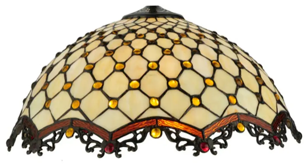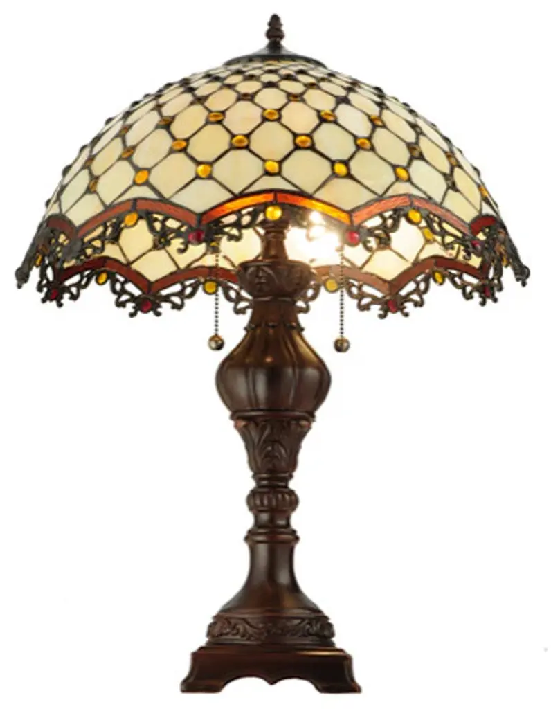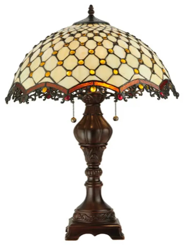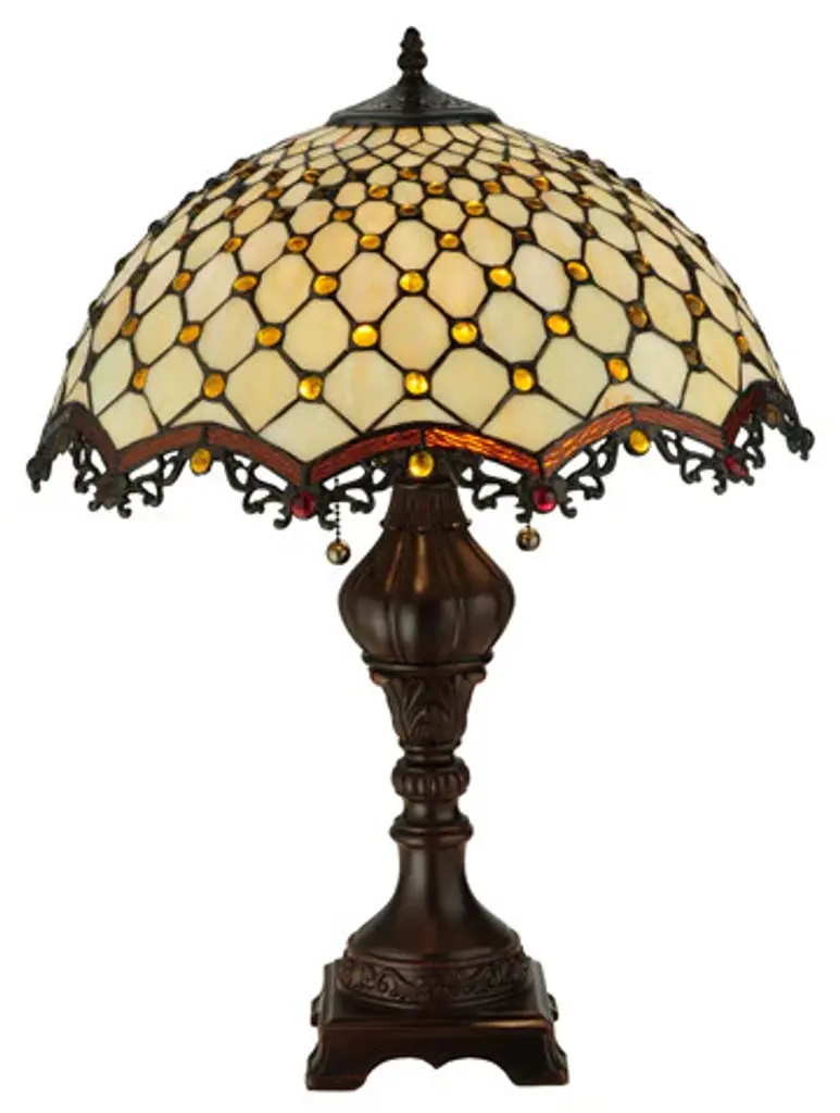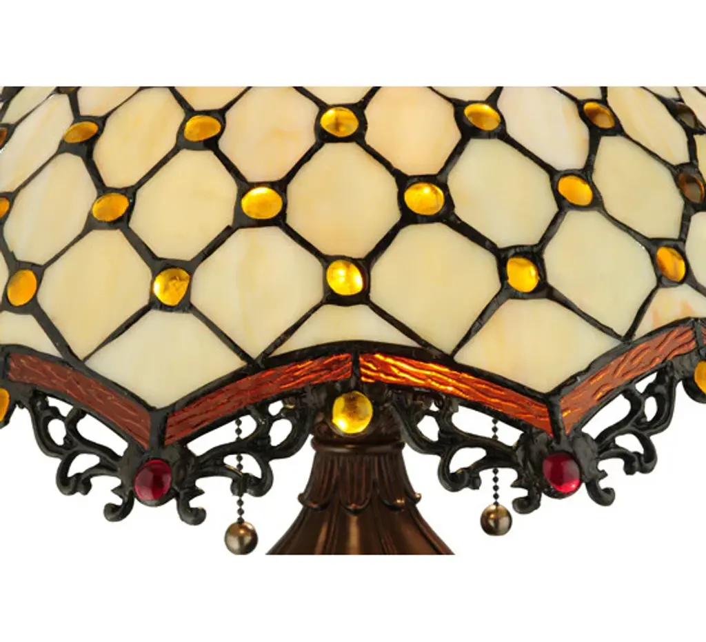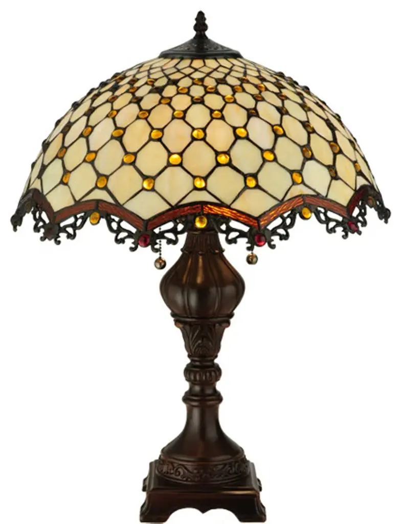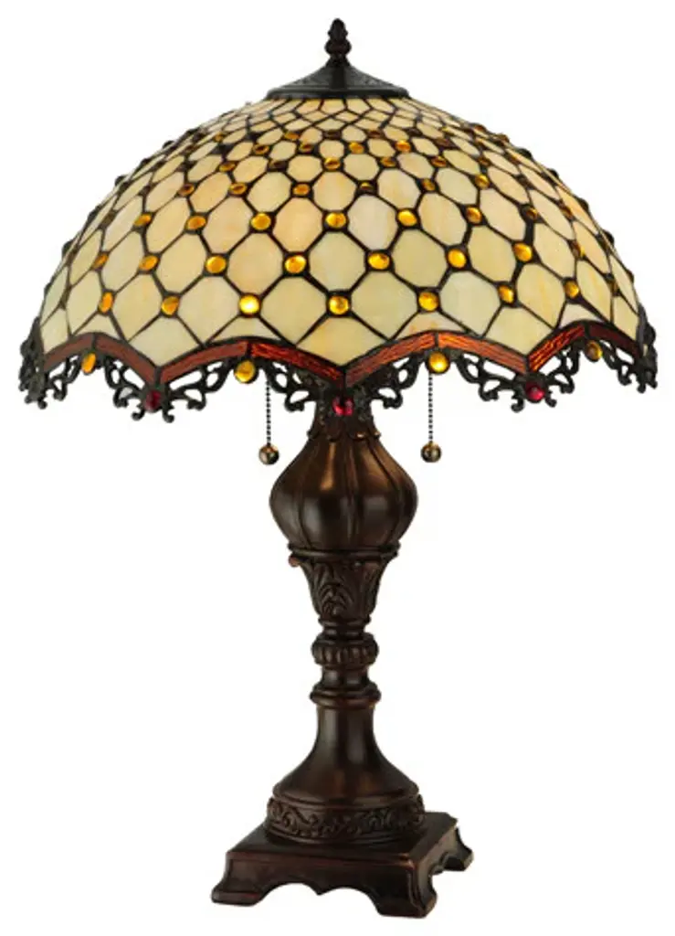 Named for the Diamond pattern and Jewel accents; this table lamp will light up your living space with sophistication and style. Bask in the complements you receive when friends; family and acquaintances comment on your elegant decor. The glass is Beige opalescent; the jewels are Amber and the look is to die for. The shade is augmented by repeating; arched; Root beer edges and the hardware is finished in sturdy Mahogany Bronze.