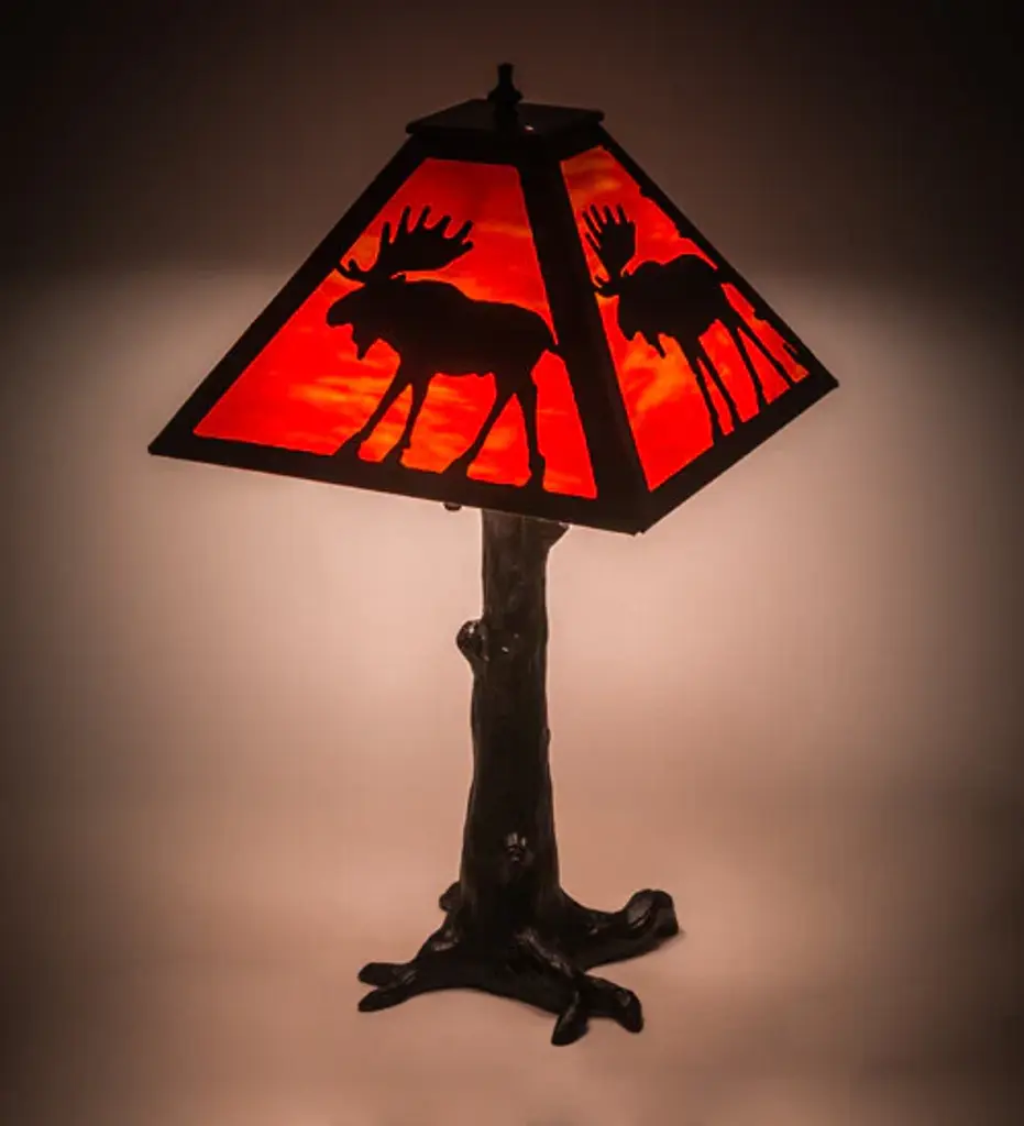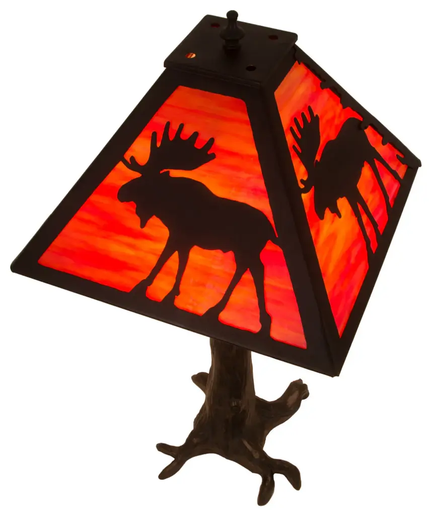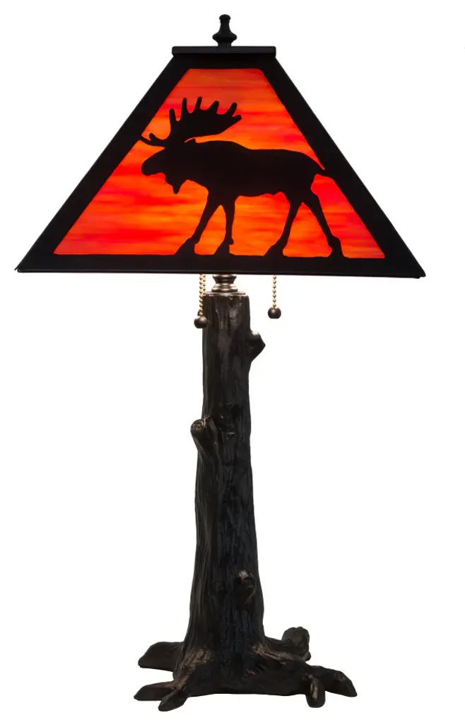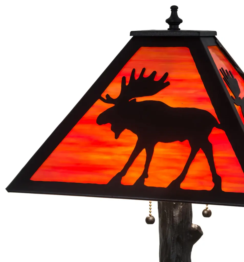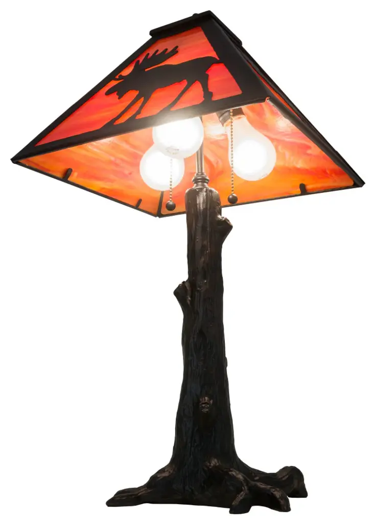 A lone majestic Moose meanders through the woods in this unique wildlife inspired lighting design. The stunning lamp features a Sunburst Opal Art Glass Shade which is complemented with decorative accents and a Root and Tree Base in a Black Textured finish. This lamp is custom made by the hands of highly skilled artisans in our manufacturing facility at the foothills of the Adirondack Mountains in NY. Custom sizes; styles and colors are available; as well as dimming energy efficient lamping options such as LED. The 24-inch table lamp is UL and cUL listed for dry locations.
