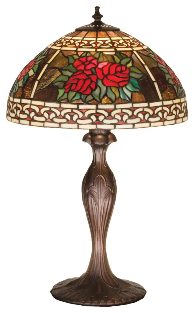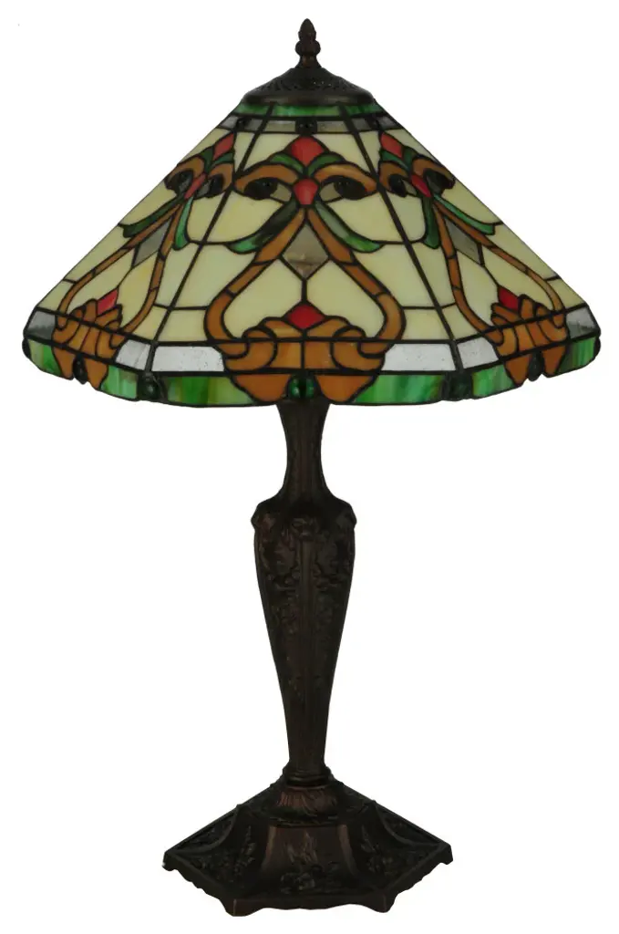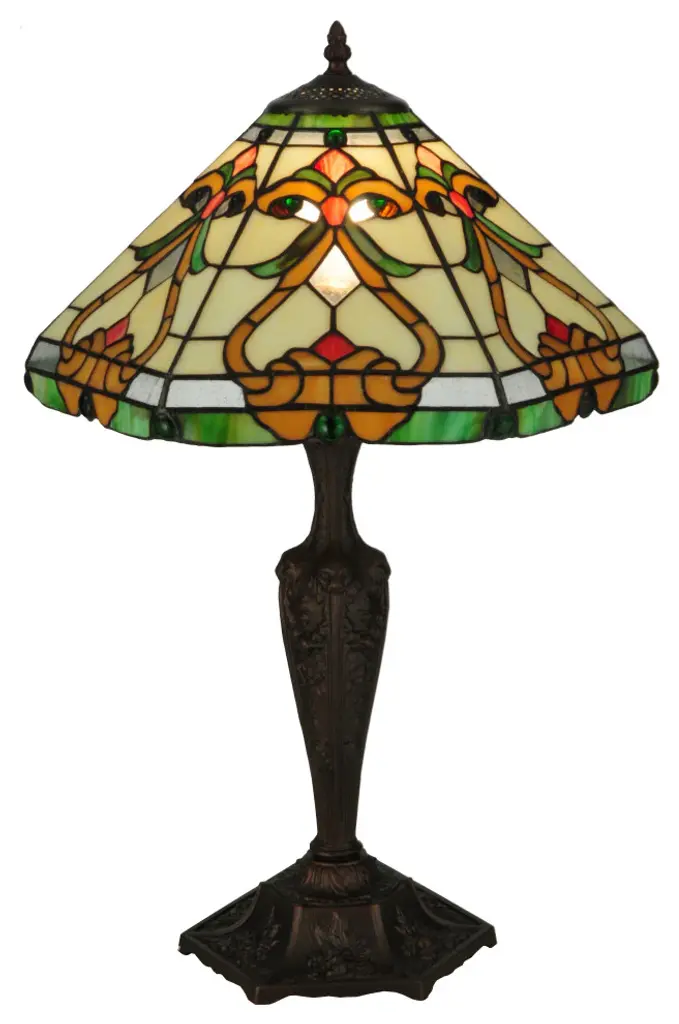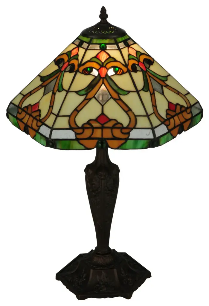 Victorian charm in beautiful stained glass for a striking festive look best describes Middleton. Leafy Green Holly entwined with Saffron with Ripe Red Berry accents and Green jewels that highlight this decorative design on a Bone Beige background and is trimmed in Green and Clear Seedy glass. The shade was created using Meyda Tiffany''s famous copper foil construction process and enhanced by decorative hardware finished in a warm Mahogany Bronze. UL Approved: YesBulb Type: MEDBulb Quantity: 1Bulb Wattage: 60Bulbs Included: No