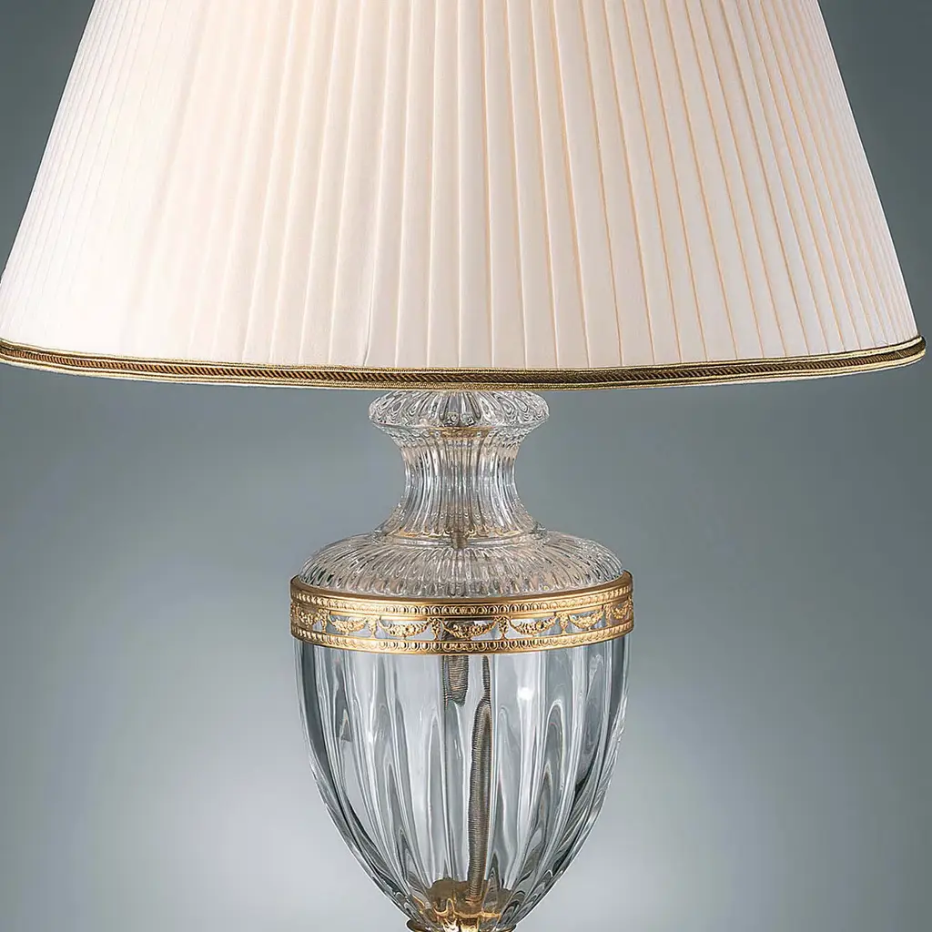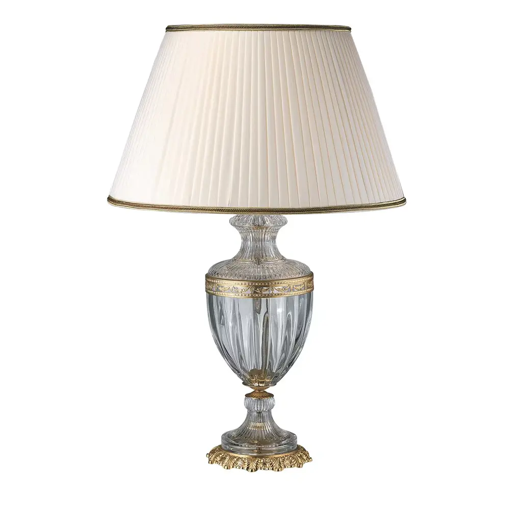 This lamp meant for the top of a dresser will add a touch of luxury to any home. The clear crystal body of the lamp is adorned with accents and a base in 24k gold plated brass. The elegant white lampshade has piping in its bottom and top in 24k gold plated brass as well.
