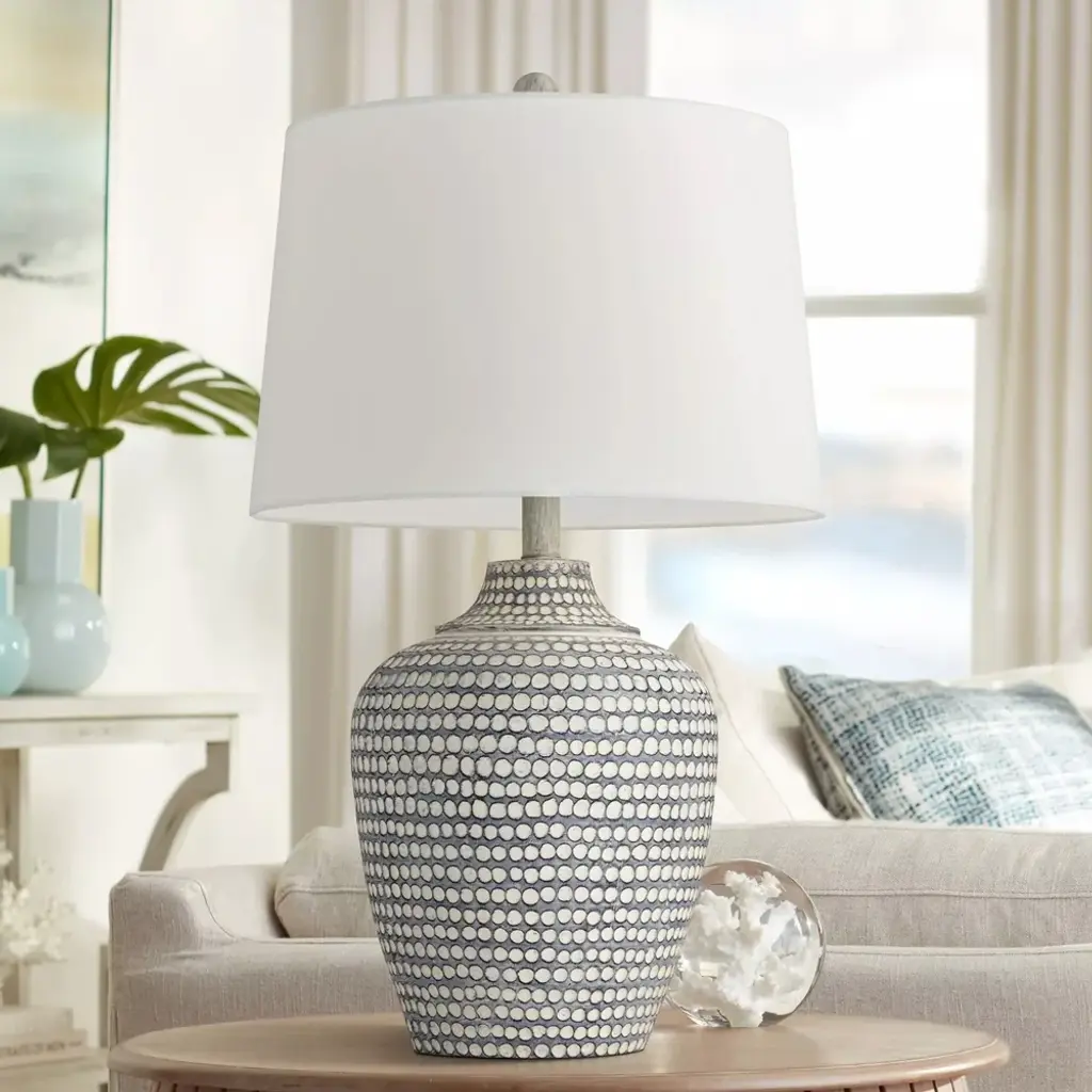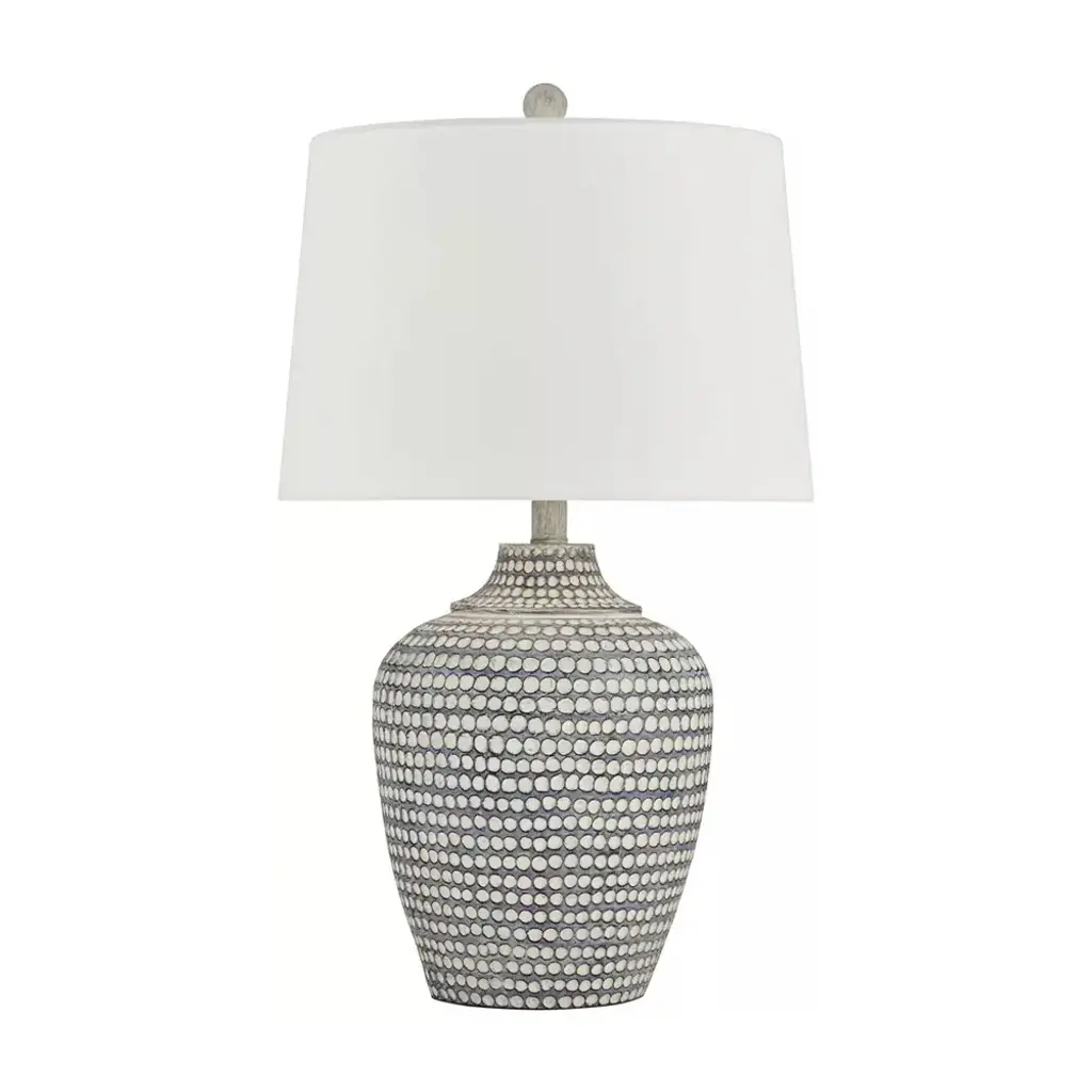 PRODUCT DETAILS: 25 1/2" high overall. Shade is 13" wide at the top x 15" wide at the bottom x 10" high. Uses one maximum 150 watt standard-medium base light bulb (not included). On-off rotary socket switch. Alese country cottage style table lamp. Jug lamp profile. Rustic gray-wash color with decoative geometric pattern. Cast resin construction. White linen fabric tapered drum shade. 8-foot long clear-silver cord.