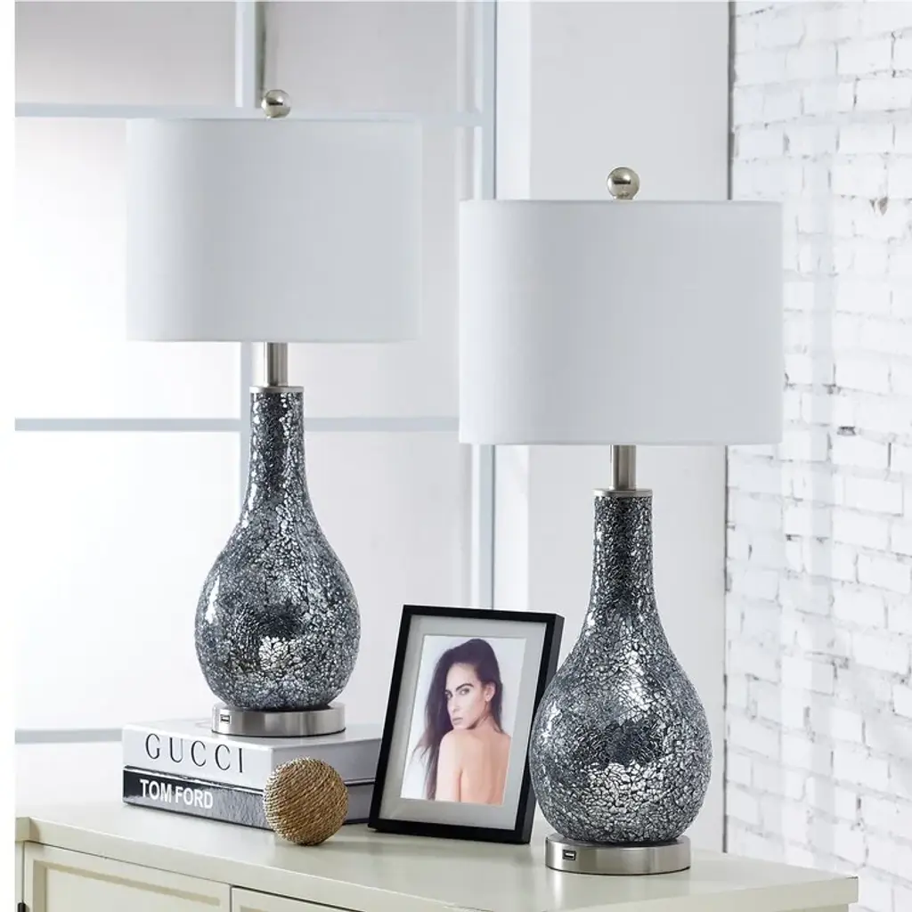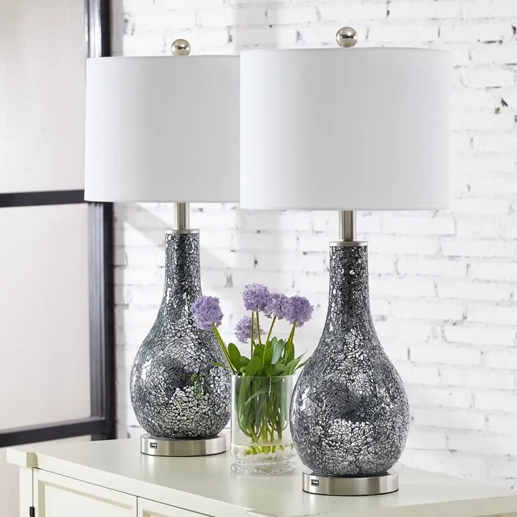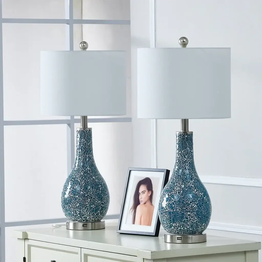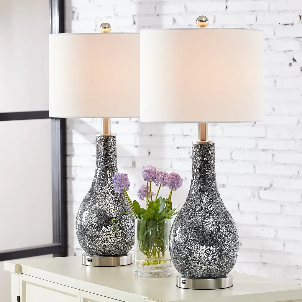 This 2-piece set of bedside table lamps light up your space with fun texture and boho flair. Both are crafted in teardrop shapes with a unique crackled effect that reminds us of mercury glass. The circular metal bases have built-in USB ports ideal for charging your phone or tablet while you're reading or watching TV. The simple drum shade and finial top allows the body of the lamp to really fantastic. Each lamp takes one standard bulb (Not included).